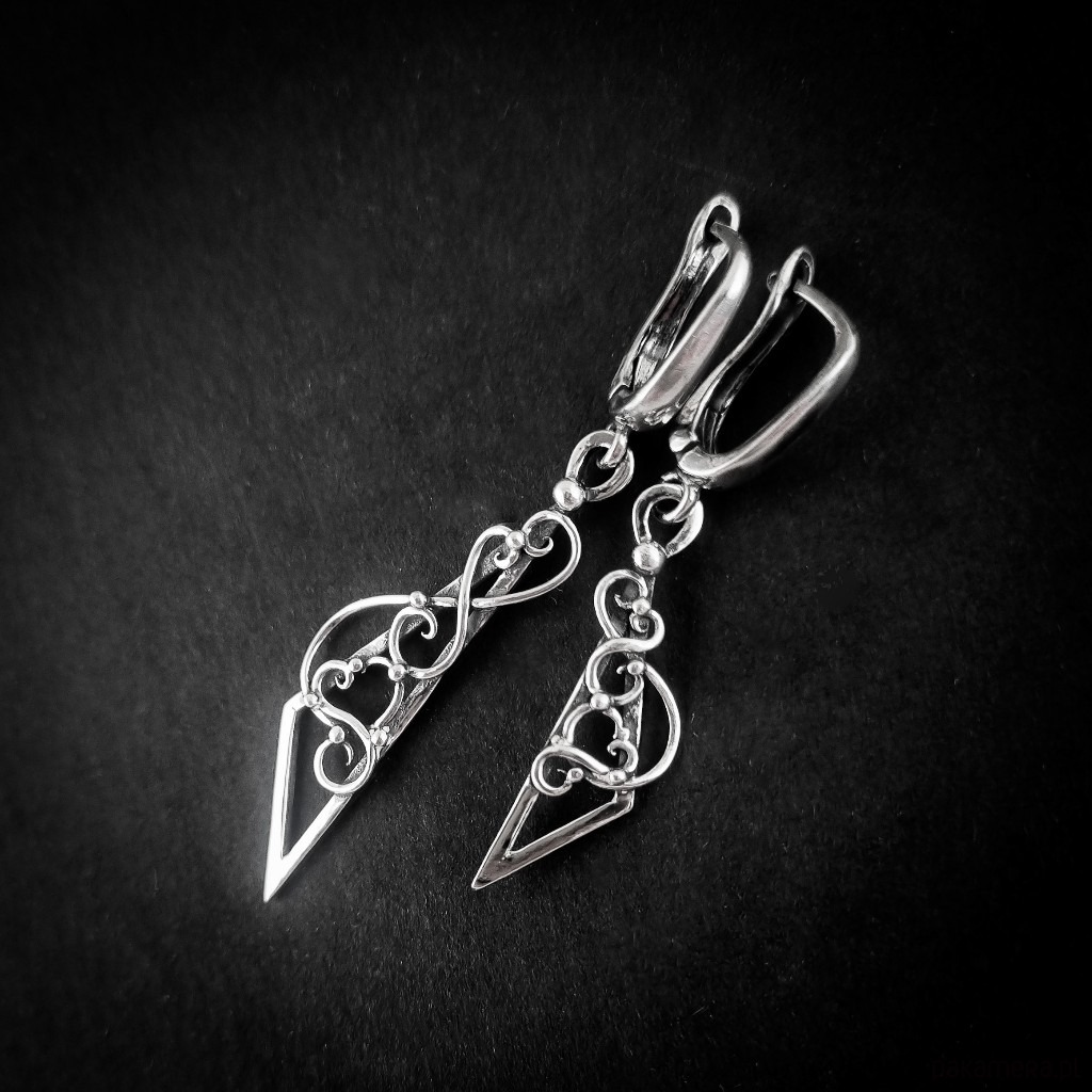 Srebro zostało zaoksydowane do głębokiej czerni, a następnie mocno przecierane i wypolerowane, co nadaje kolczykom wyjątkową grę światła i cieni – od subtelnych odcieni szarości po intensywną czerń. Taki efekt sprawia, że kolczyki nabierają głębi i wyrazistości, a ich oryginalny wygląd wpasuje się w styl odważnych osób, które cenią nietuzinkową biżuterię.