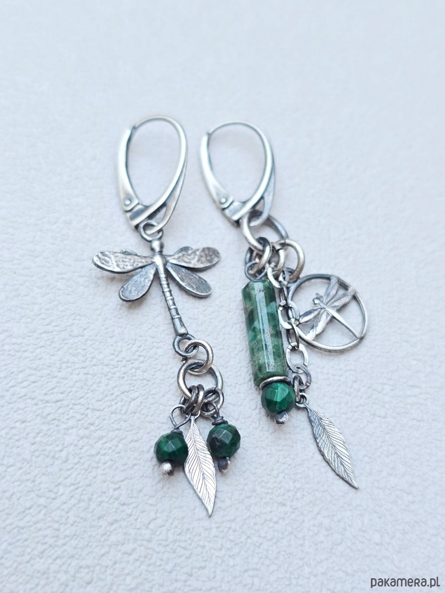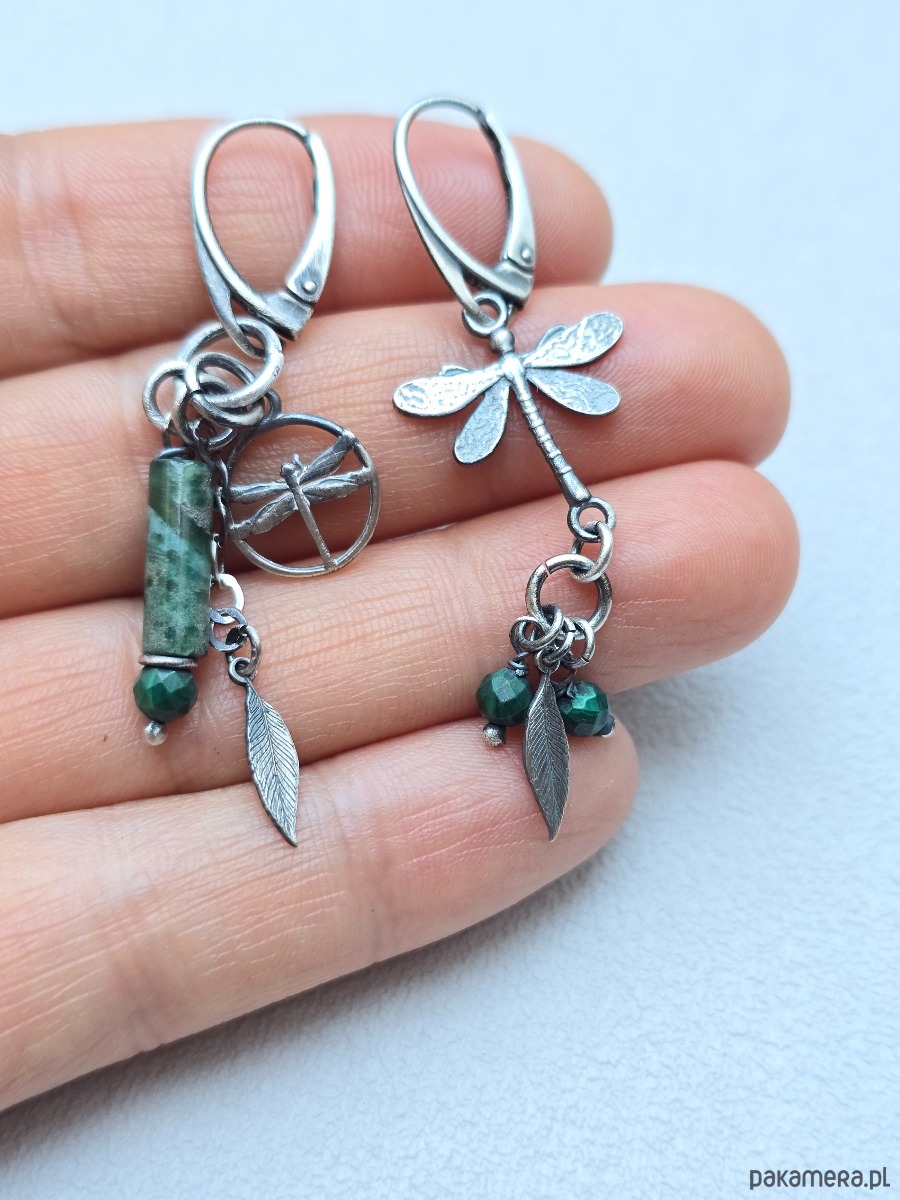 Kolczyki srebrne Asymetryczne Zielone Ważki