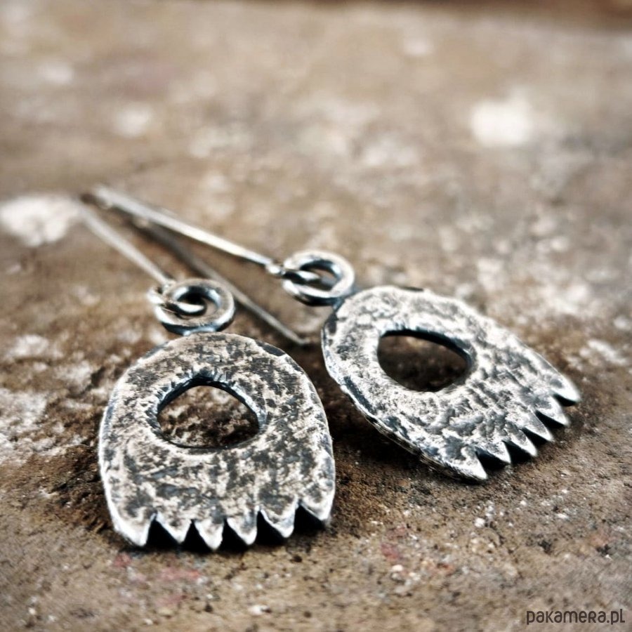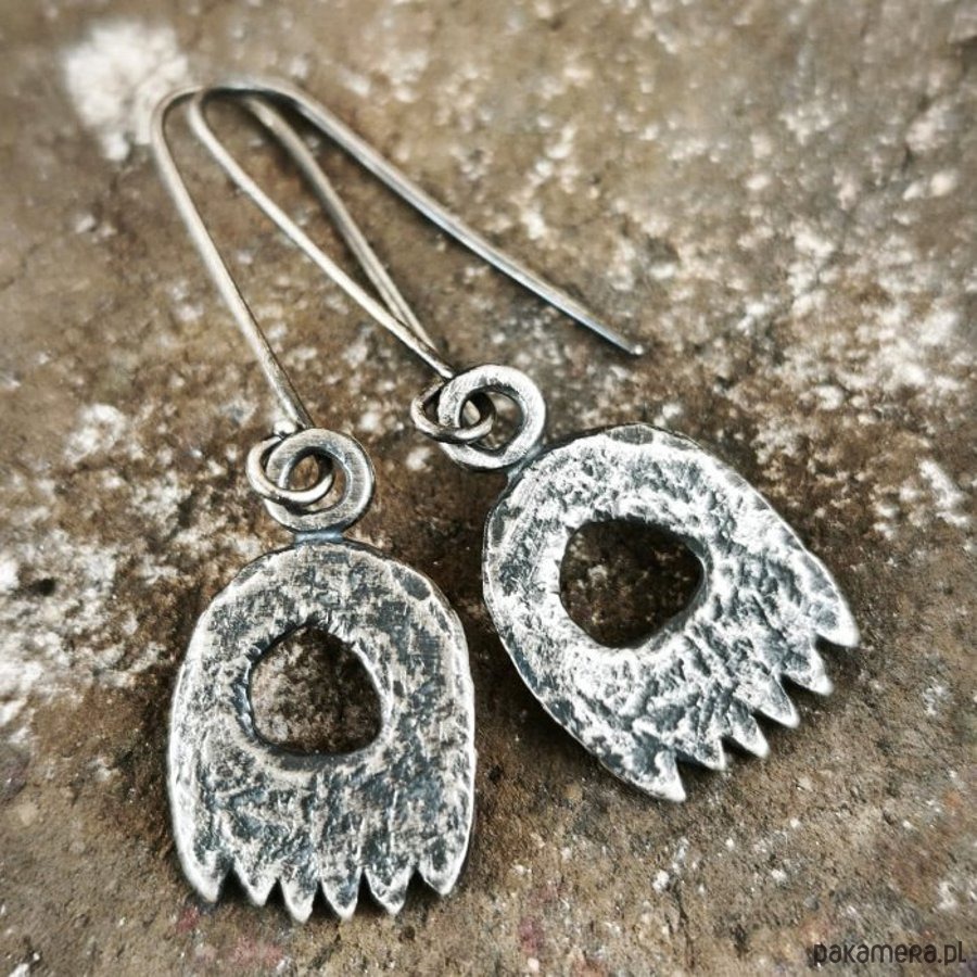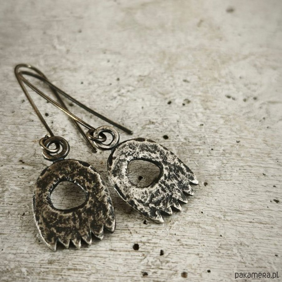 Kolczyki z oksydowanego srebra. Szerokość kolczyków 1,5 cm, długość 5,5 cm.