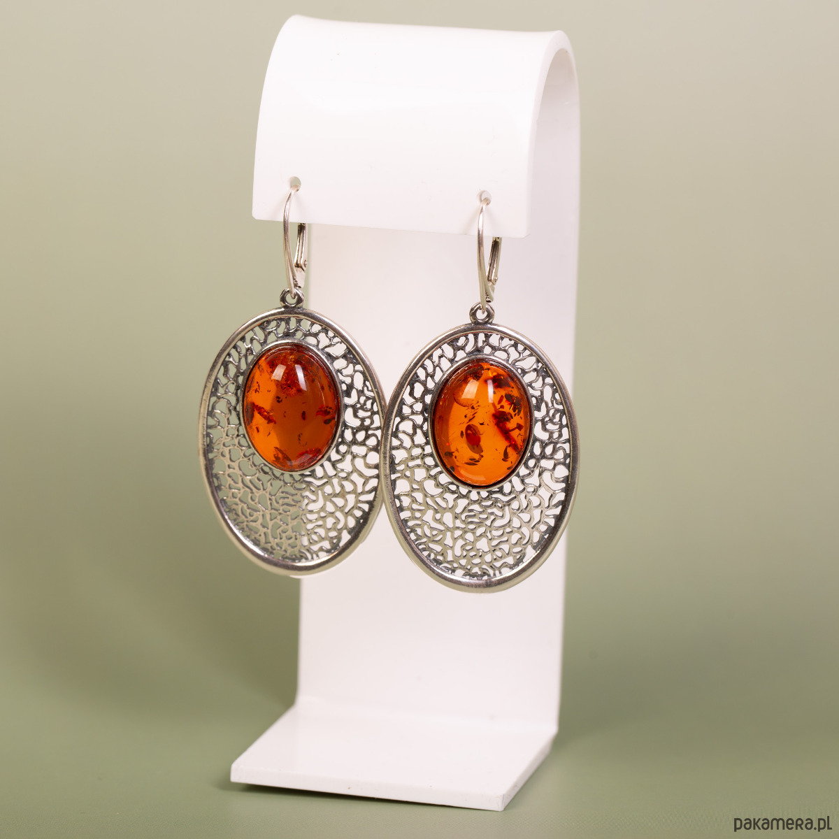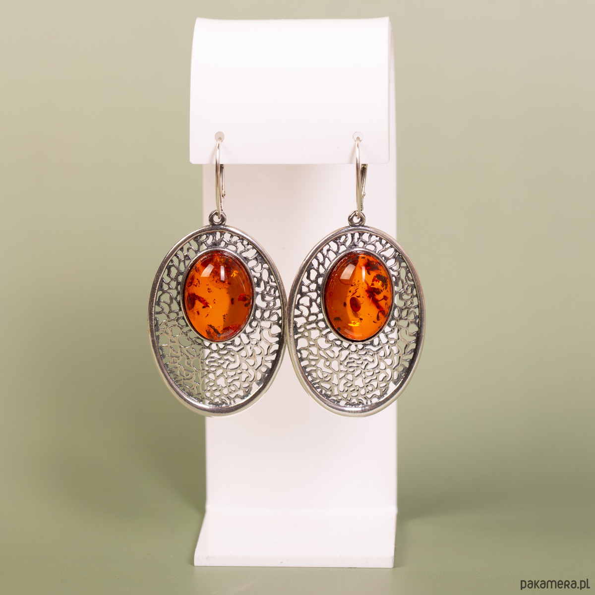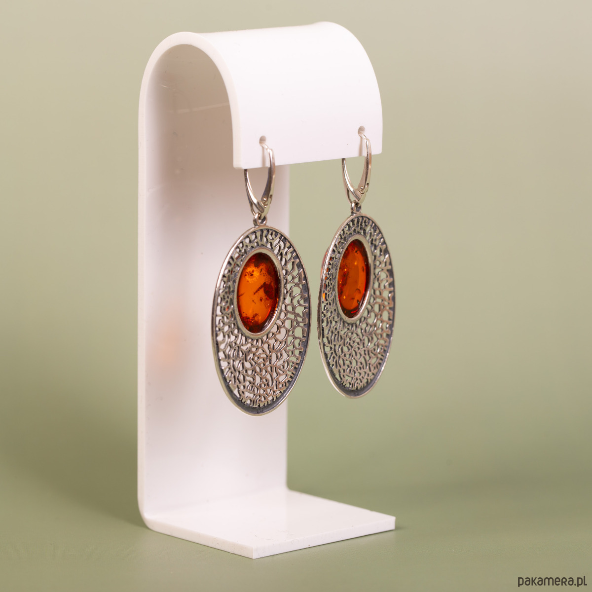Kolczyki srebrne ażurowe z koniakowym bursztynem