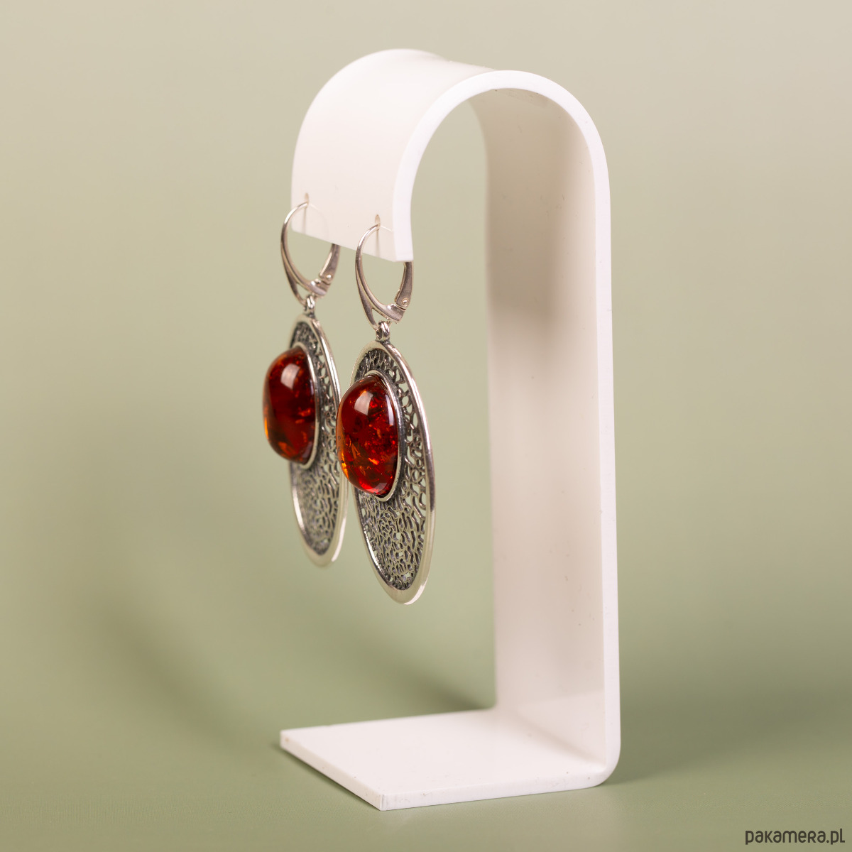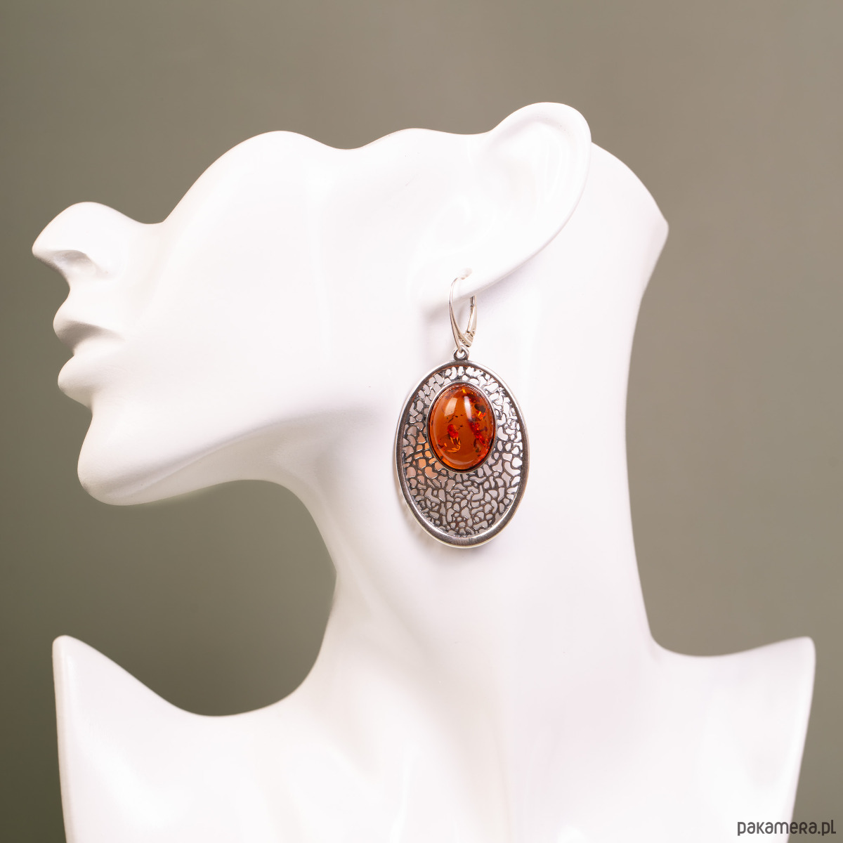 Rozmiar i forma: Kolczyki mają wyrazistą, owalną formę, która pięknie eksponuje centralnie umieszczony bursztyn. To biżuteria o dużym formacie, zaprojektowana jako dominujący akcent stylizacji. Owalny szlif żywicy idealnie współgra z miękkimi liniami srebrnego ażuru, tworząc harmonijną całość.