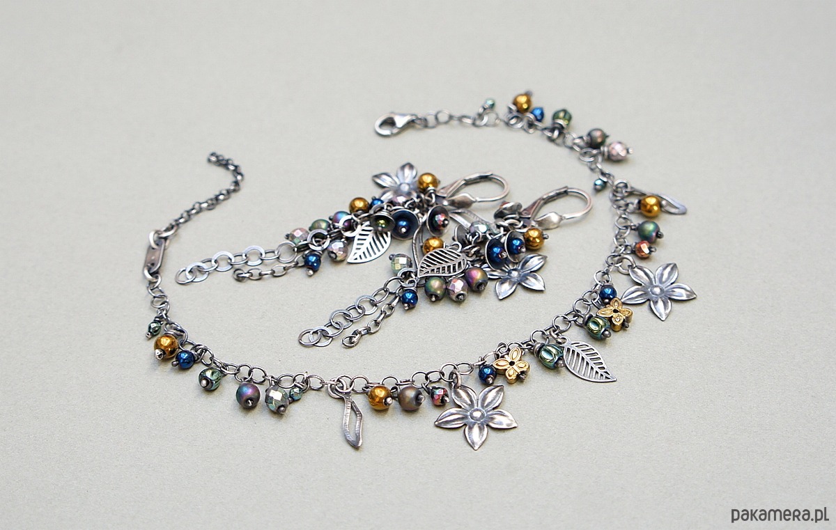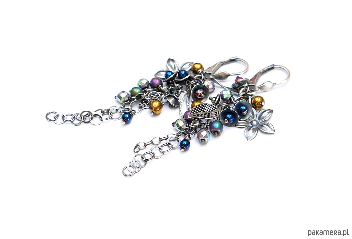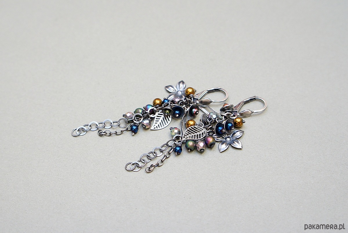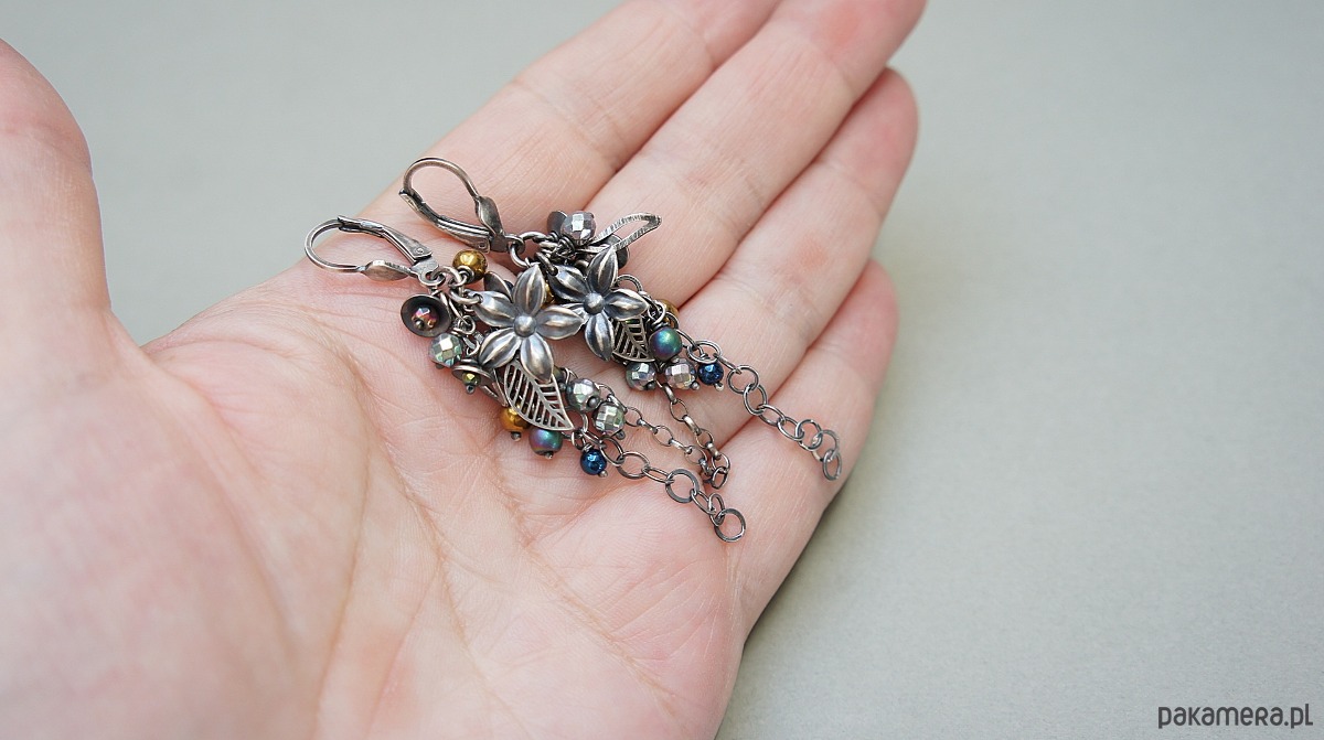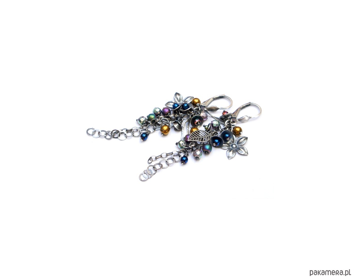 Kolczyki wykonane ze srebra w połączeniu z wielokolorowymi hematytami [4mm,3mm i 2mm] oraz srebrnymi zawieszkami. Całość oksydowana i przetarta. Całkowita długość kolczyków 7, 2 cm. Biżuteria ozdobnie zapakowana.