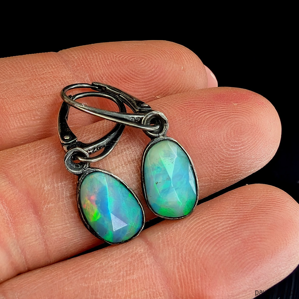 Delikatne kolczyki wykonane z oksydowanego srebra 925 oraz opali z Etiopii. Kamienie zachwycają multikolorową opalizacją spotęgowaną precyzyjnym szlifem. Wymiary elementów oprawy kamienia 12 x 7 mm. Zapinane na klasyczne bigle angielskie. Długość całości z biglami 30 mm. Leciutkie, waga jednego kolczyka 1,3 grama. Kolczyki zostaną zapakowane w ozdobne pudełeczko.
