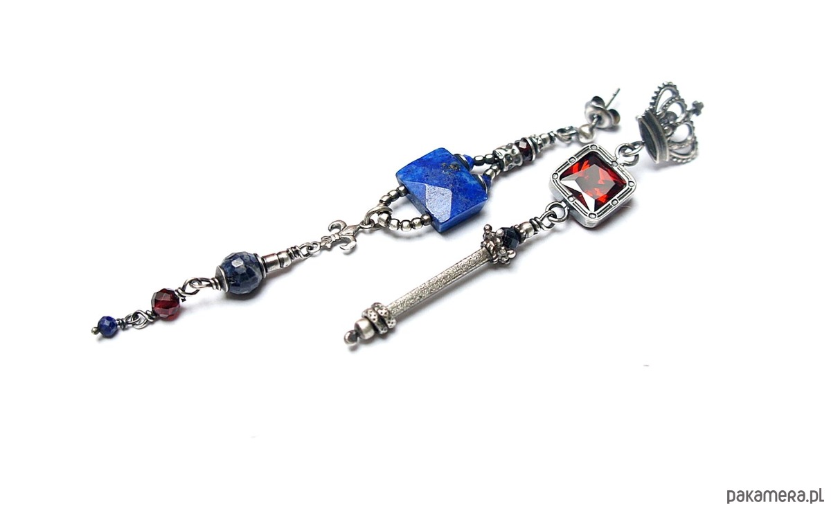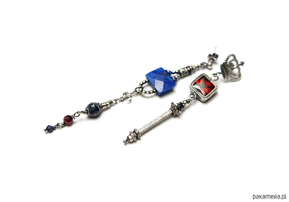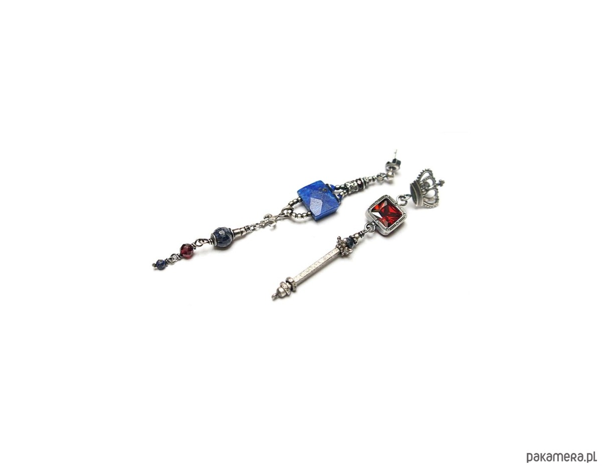 Asymetryczne kolczyki wykonane w całości ze srebra [pr. 925] w połączeniu z naturalnym fasetowanym lapisem lazuli [12mm x 9mm], fasetowanymi kuleczkami szafirów [6mm i 4mm],fasetowanymi granatami [4mm],lapisem lazuli [2mm] oraz cyrkonią [8mm x 8mm]. Całkowita długość kolczyków 8,8cm i 6,9cm. Biżuteria ozdobnie zapakowana. Do kompletu można dokupić bransoletkę przedstawioną na zdjęciach.