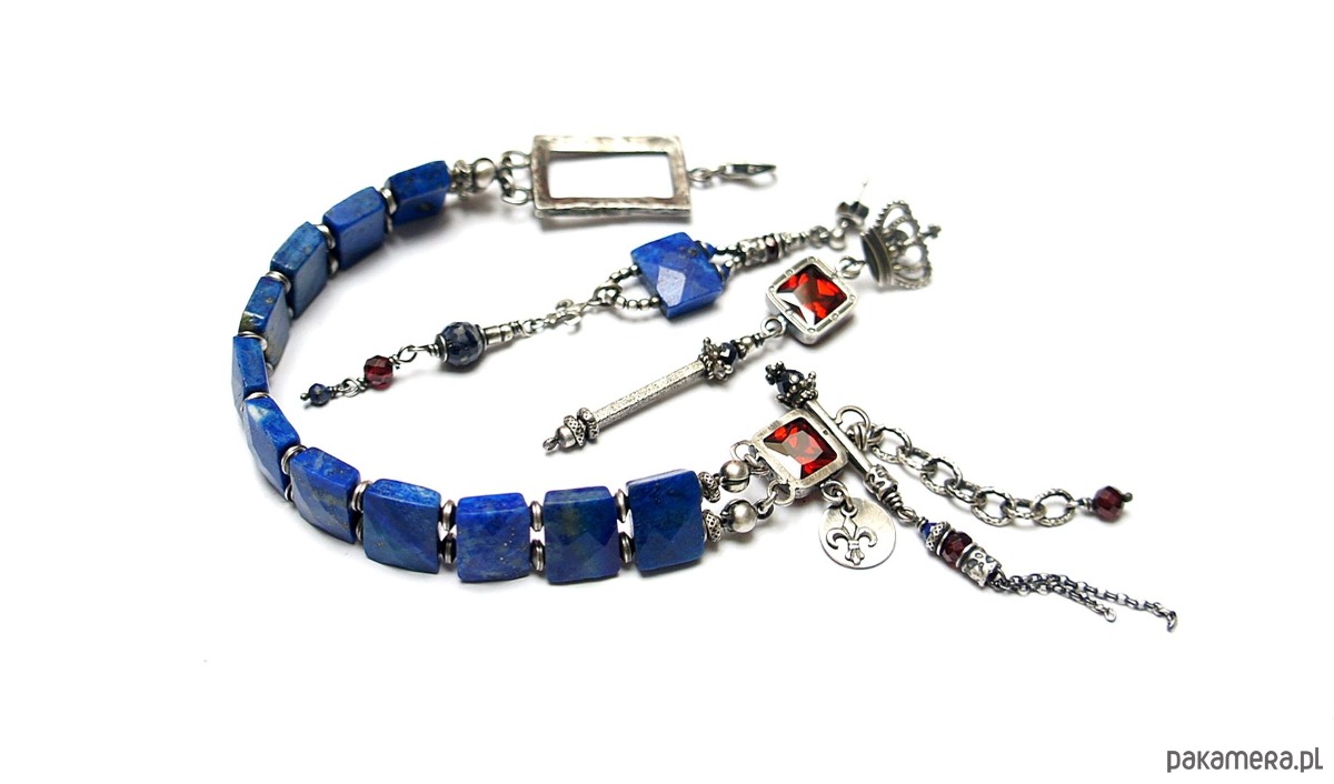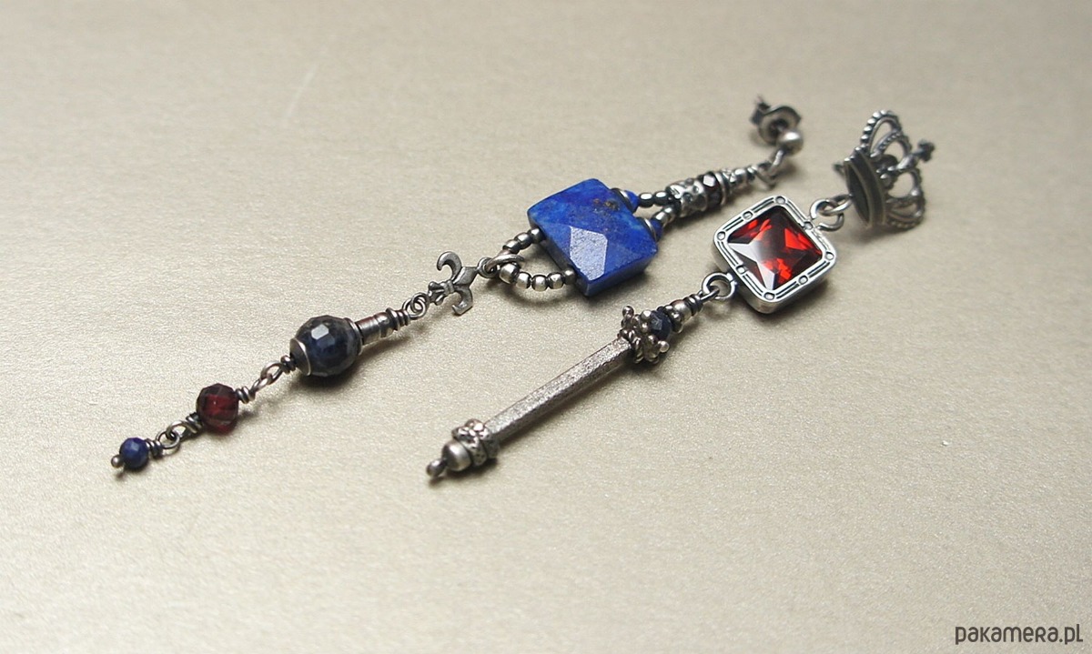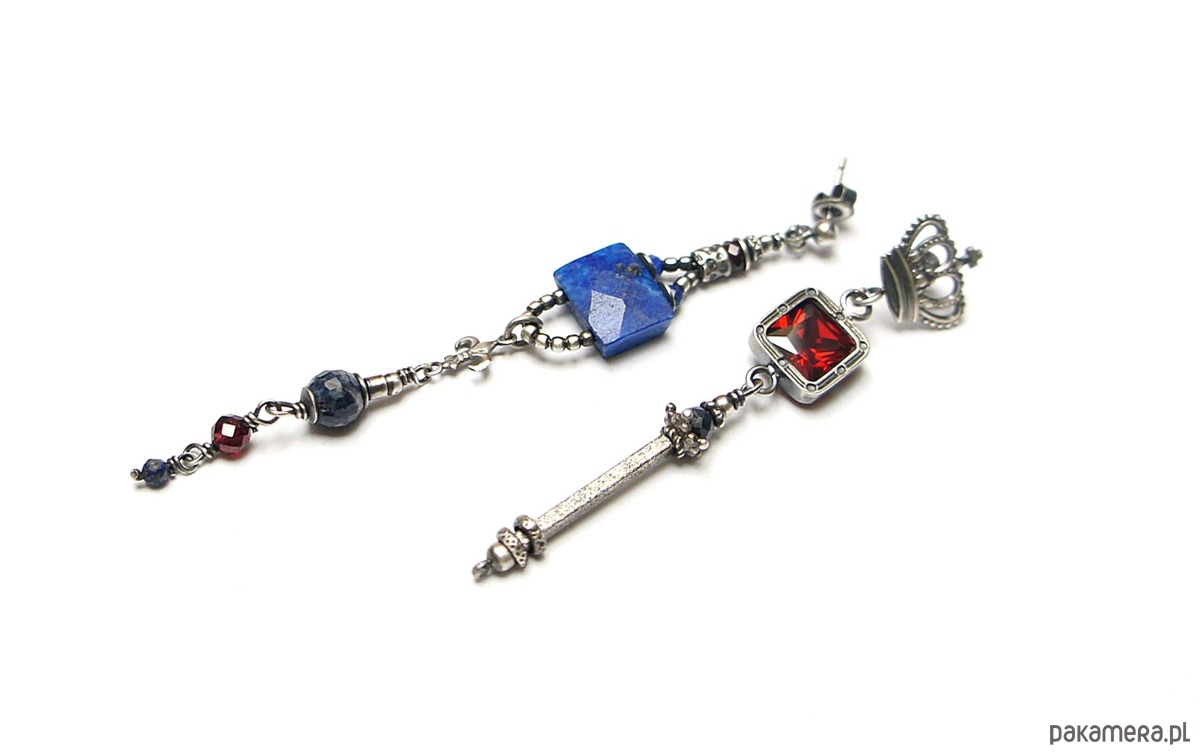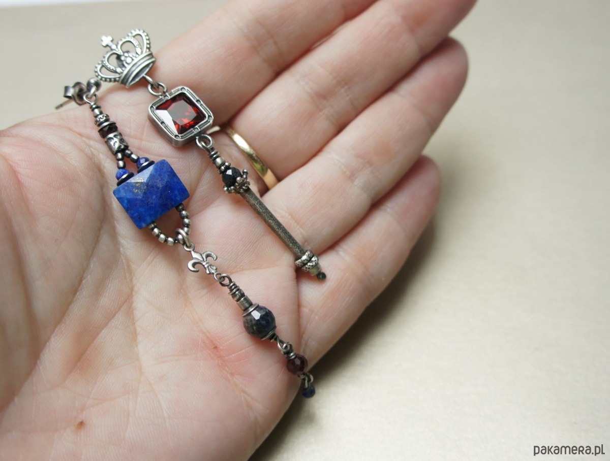 Asymetryczne kolczyki wykonane w całości ze srebra [pr. 925] w połączeniu z naturalnym fasetowanym lapisem lazuli [12mm x 9mm], fasetowanymi kuleczkami szafirów [6mm i 4mm],fasetowanymi granatami [4mm],lapisem lazuli [2mm] oraz cyrkonią [8mm x 8mm]. Całkowita długość kolczyków 8,8cm i 6,9cm. Biżuteria ozdobnie zapakowana. Do kompletu można dokupić bransoletkę przedstawioną na zdjęciach.