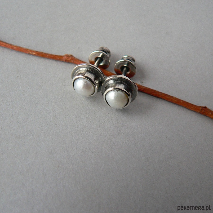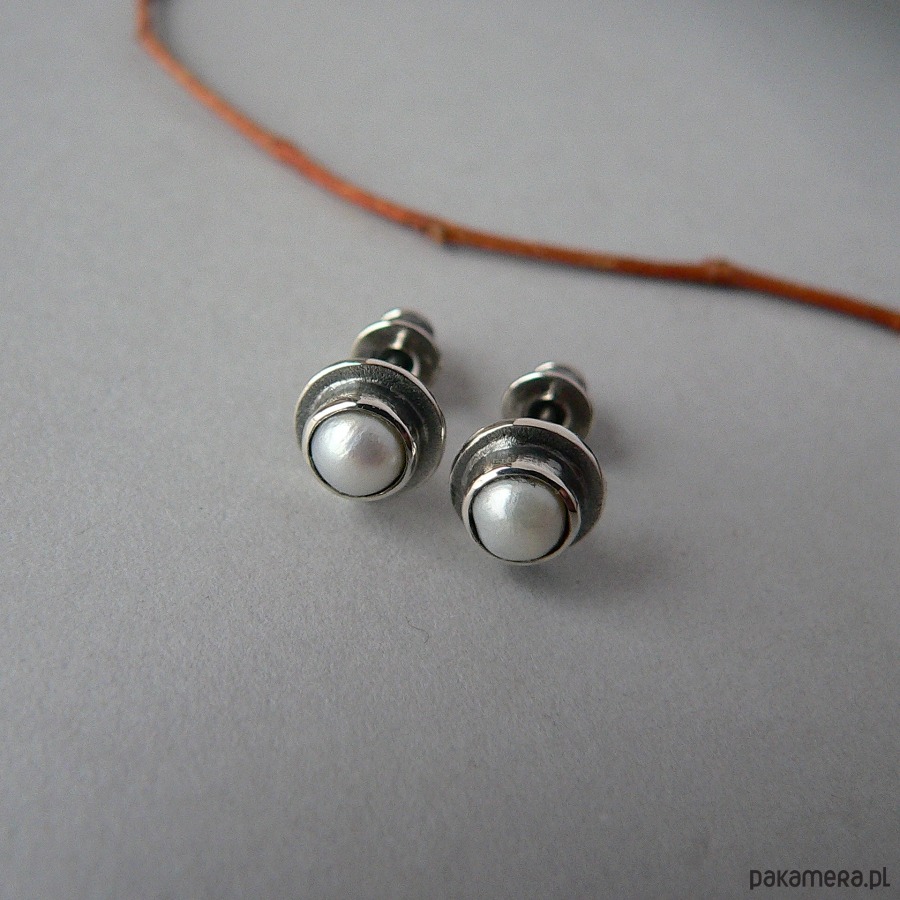 Delikatne kolczyki do pracy i na wyjście, wykonane z białych hodowlanych, perełek i srebra. Srebro piaskowane , całość oksydowana , detale polerowane. Średnica perełek 5 mm, perełki nie są idealnie okrągłe, średnica srebrnych krążków 7 mm Sztyfty zabezpieczone solidnymi zatyczkami ze srebra z silikonem.