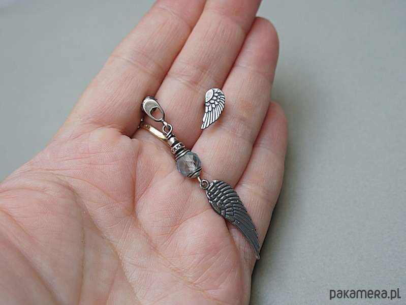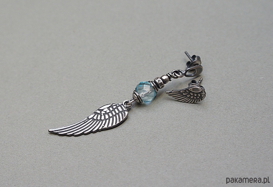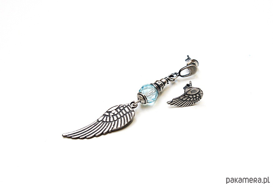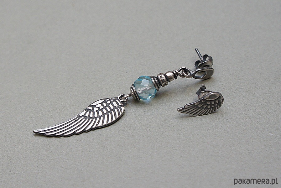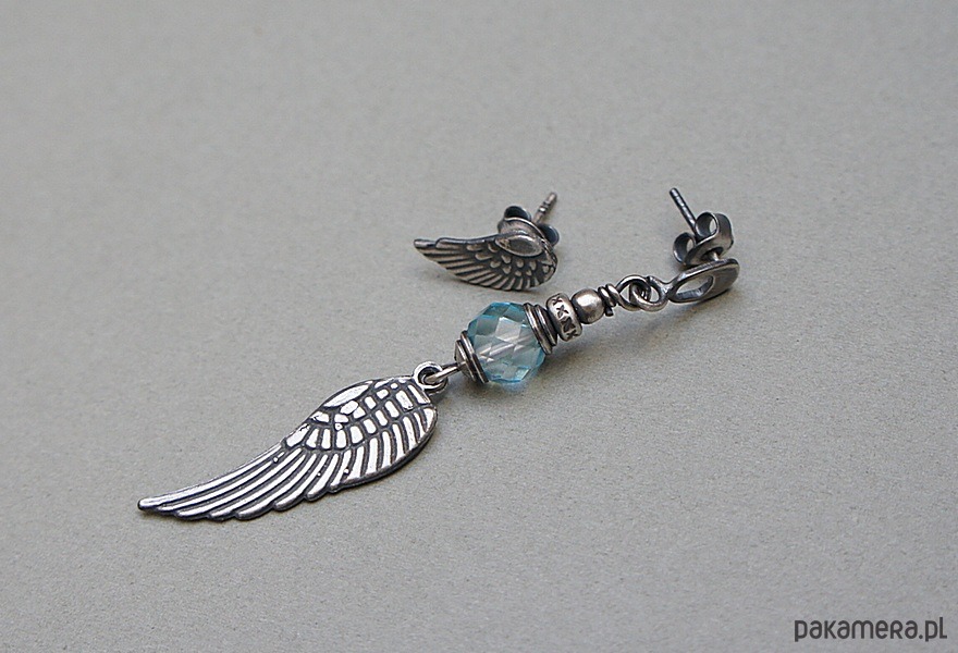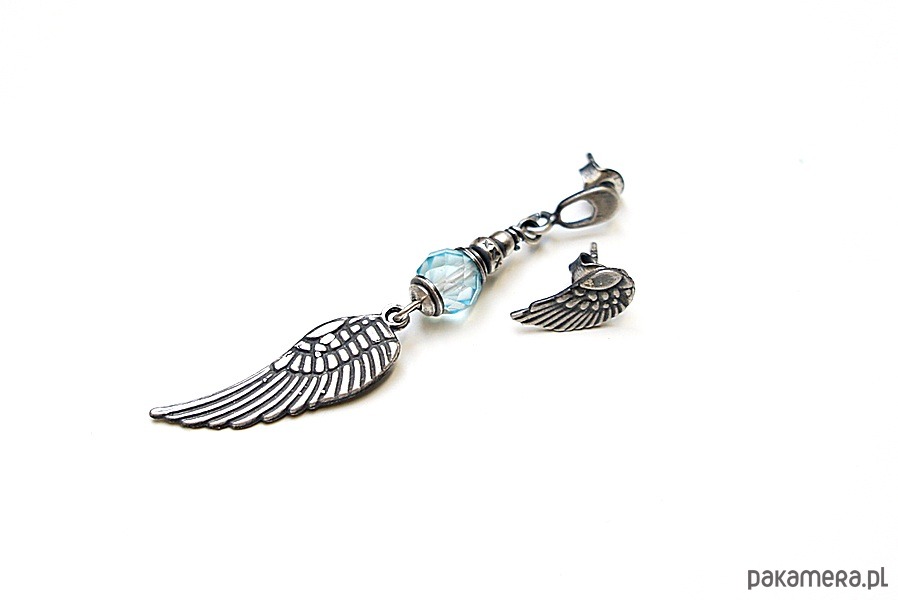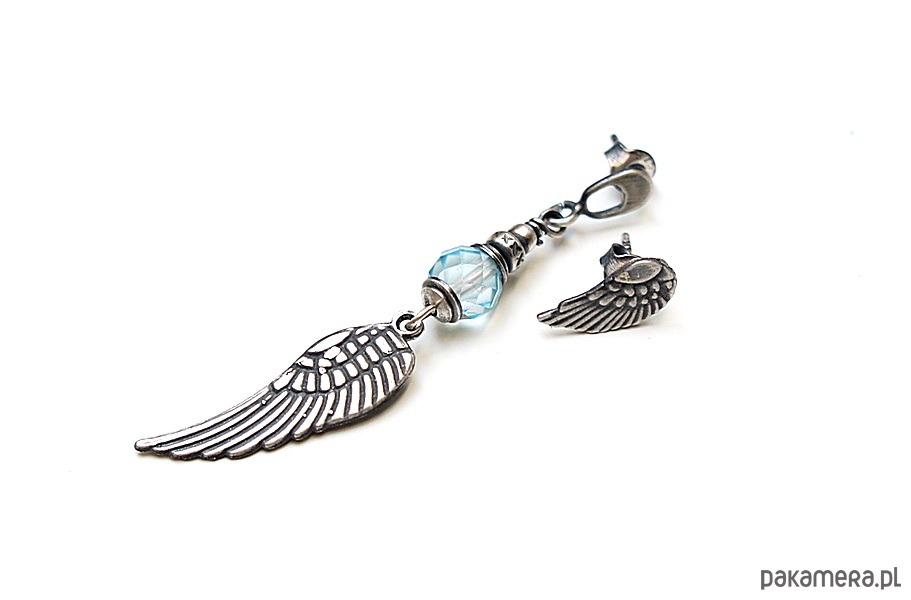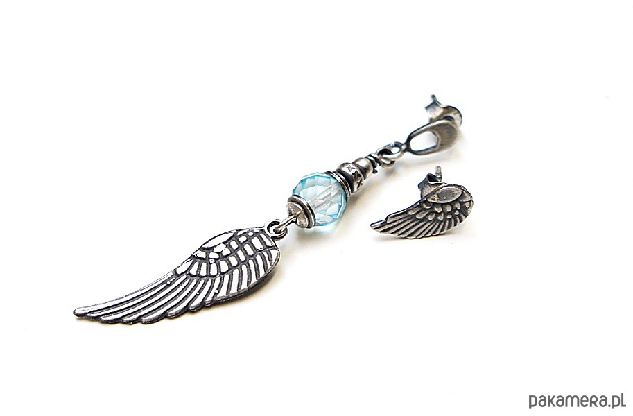 Asymetryczne kolczyki wykonane ze srebra [pr. 925] w połączeniu ze srebrnymi skrzydełkami oraz fasetowaną kuleczką topazu [8mm]. Srebro oksydowane i przetarte. Całkowita długość długiego kolczyka 6cm. Biżuteria ozdobnie zapakowana. Do kompletu można dokupić bransoletkę i naszyjnik dostępny w naszej galerii - przedstawione na zdjęciach.