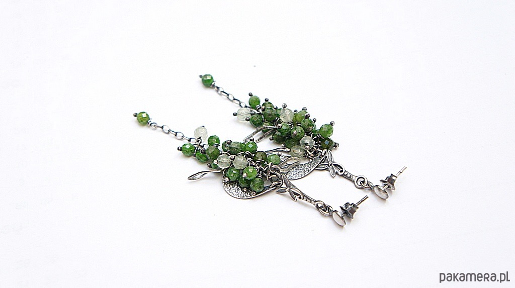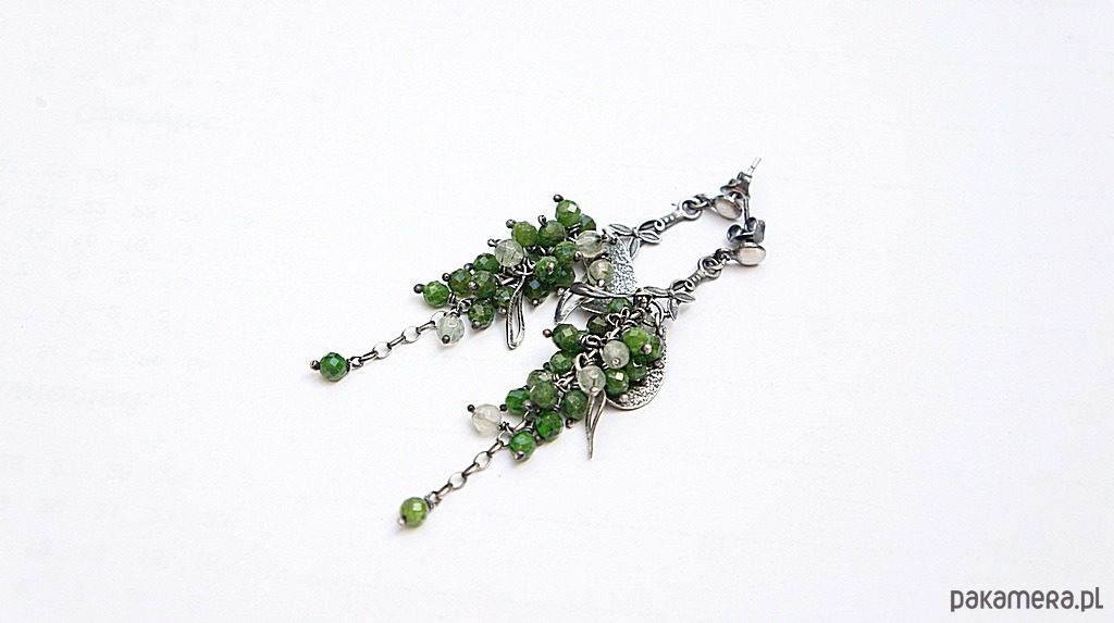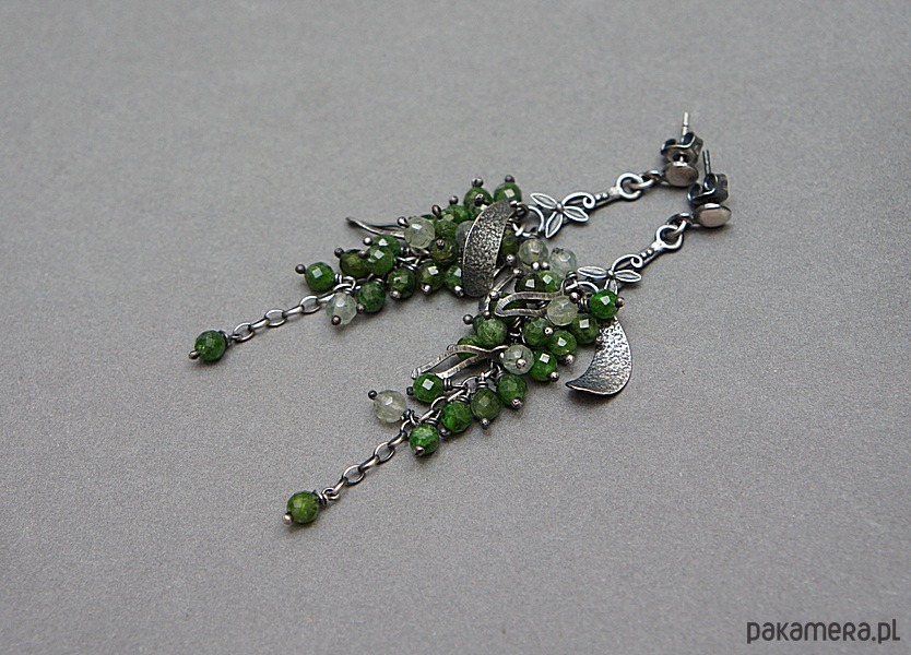 Kolczyki wykonane ze srebra w połączeniu z fasetowanymi diopsydami [4mm], fasetowanymi frenitami [4mm] oraz srebrnymi płatkami. Całość oksydowana i przetarta. Całkowita długość kolczyków 7,5cm. Biżuteria ozdobnie zapakowana.