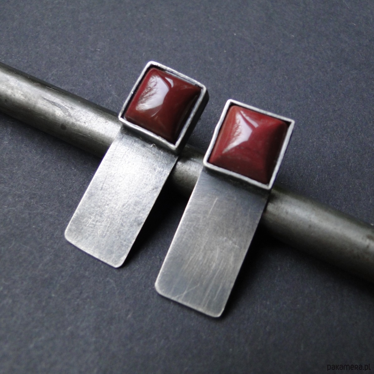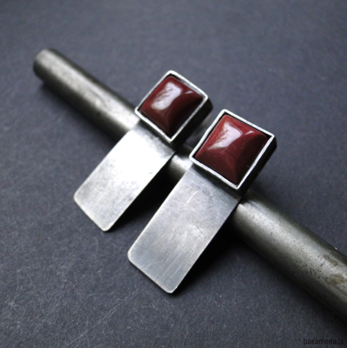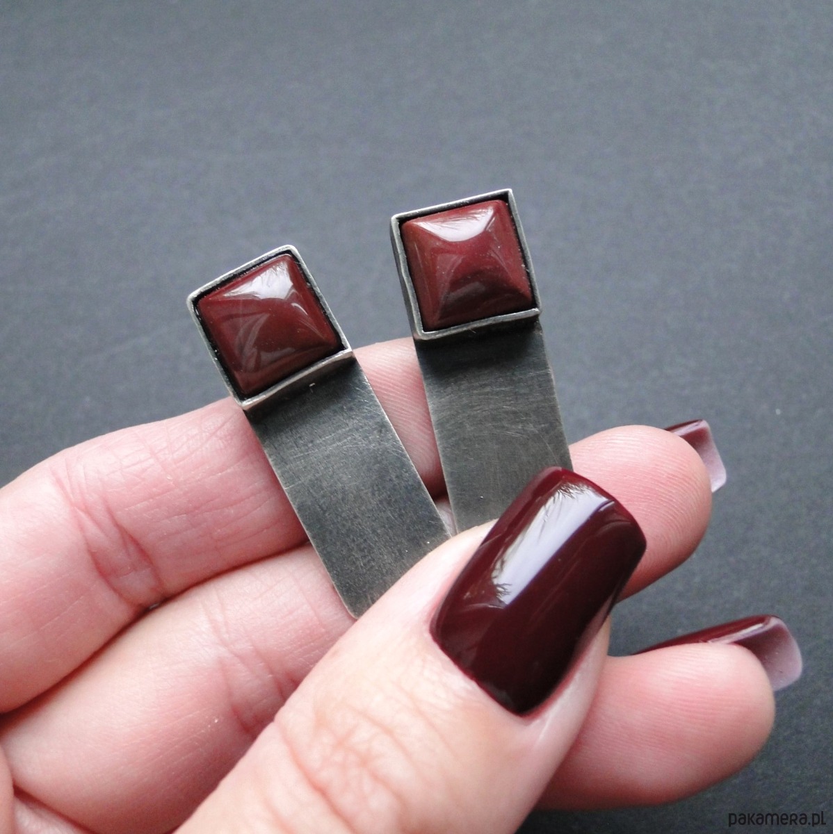 Duże,nietypowe sztyfty wykonane ręcznie ze srebra pr.925. Oksydowane i szorowane. Naturalny mokait 10x10mm. Kamień w kolorze zgaszony burgund. Sztyfty z wygodnymi zatyczkami z silikonu i srebra. Wciąż jeden z najmodniejszych kolorów sezonu jesień/zima.