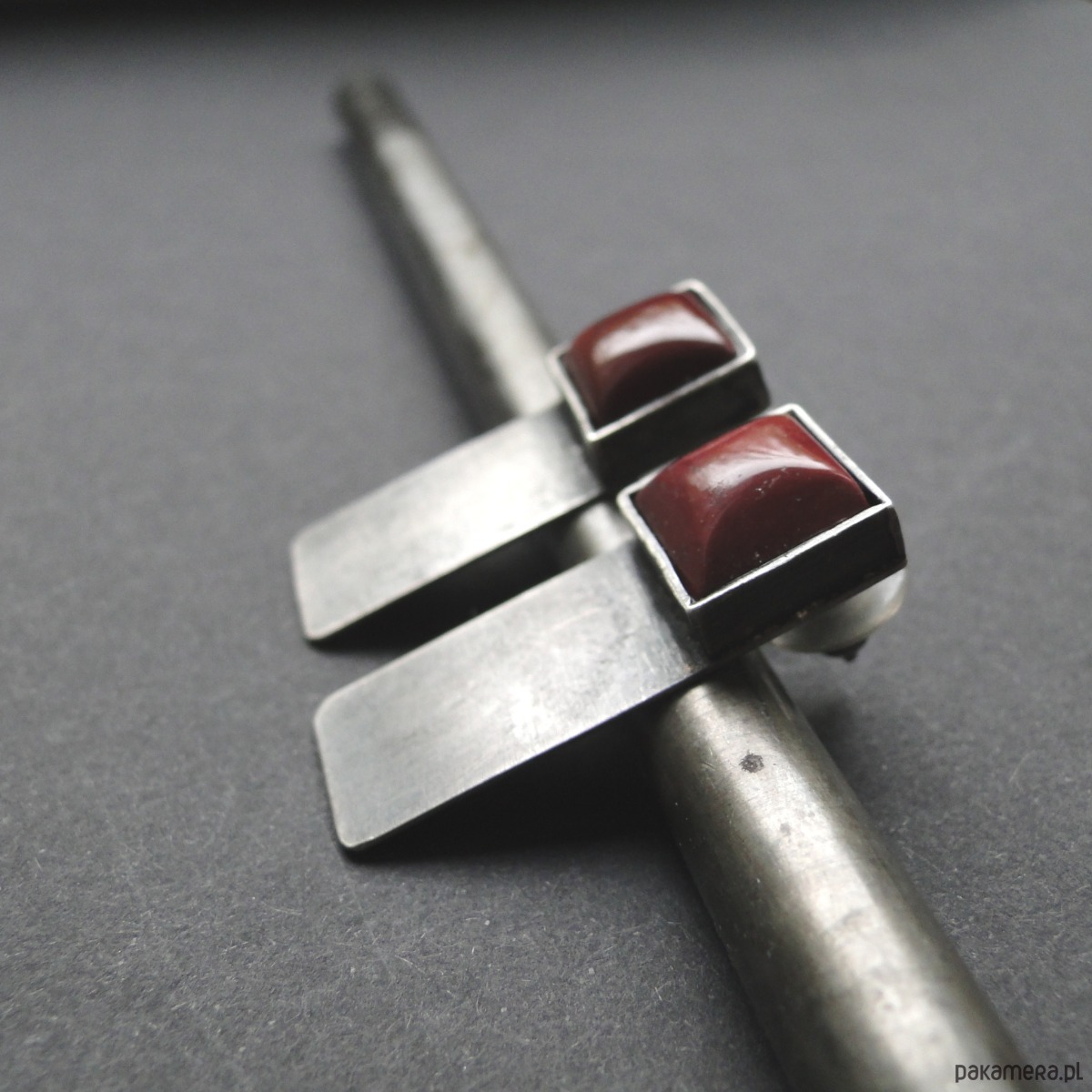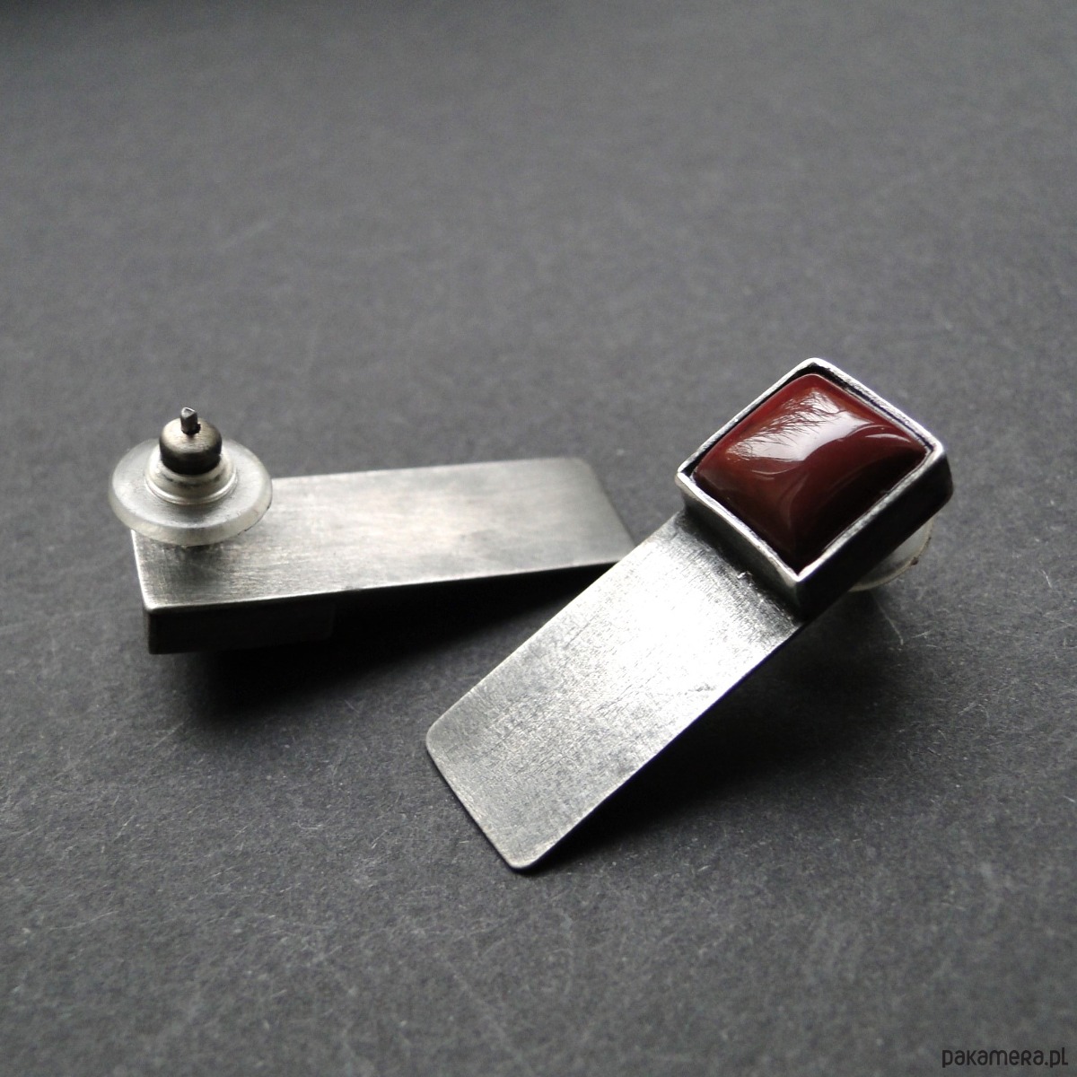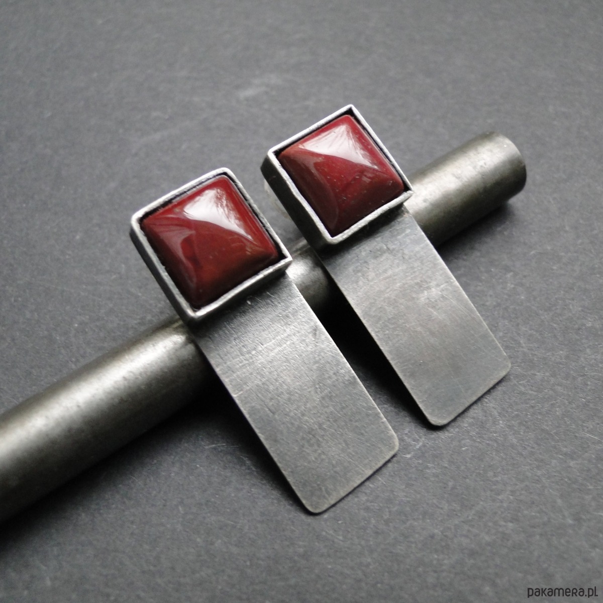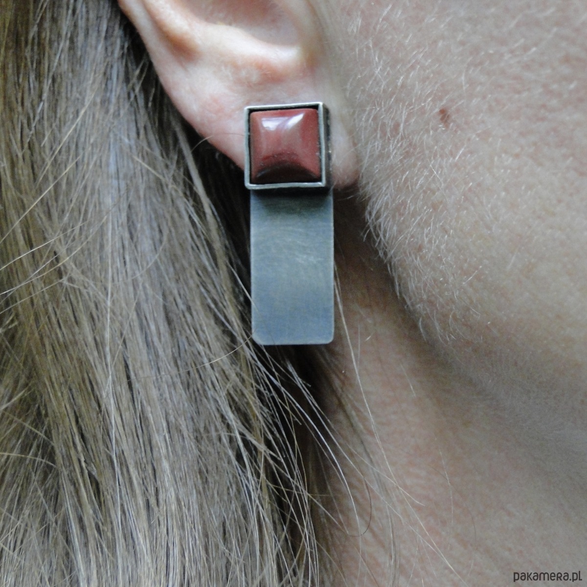 Duże,nietypowe sztyfty wykonane ręcznie ze srebra pr.925. Oksydowane i szorowane. Naturalny mokait 10x10mm. Kamień w kolorze zgaszony burgund. Sztyfty z wygodnymi zatyczkami z silikonu i srebra. Wciąż jeden z najmodniejszych kolorów sezonu jesień/zima.