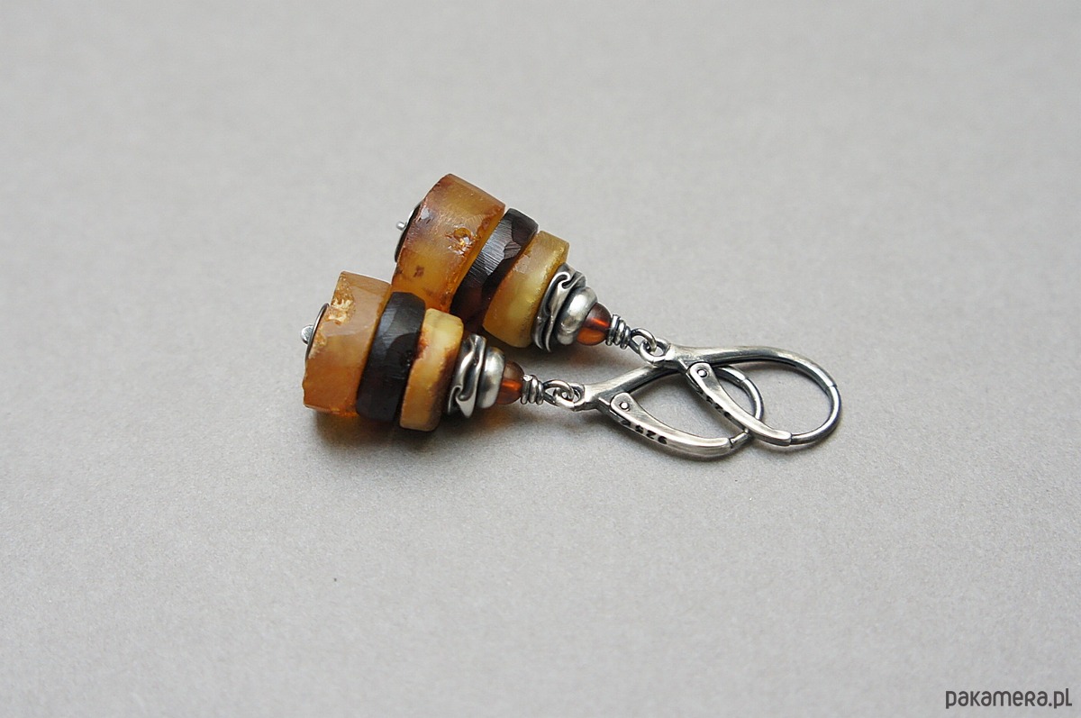 Kolczyki wykonane ze srebra [pr. 925] w połączeniu z plastrami surowych, matowych bursztynów [13mm ,12mm i 10mm], kuleczką bursztynu [4mm] . Srebro o oksydowane i przetarte. Całkowita długość kolczyków 5,2cm. Biżuteria ozdobnie zapakowana.