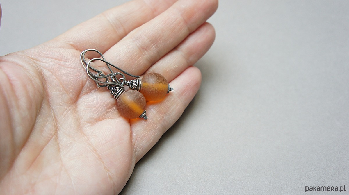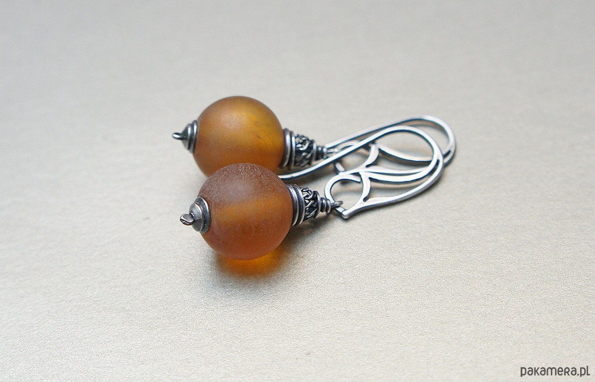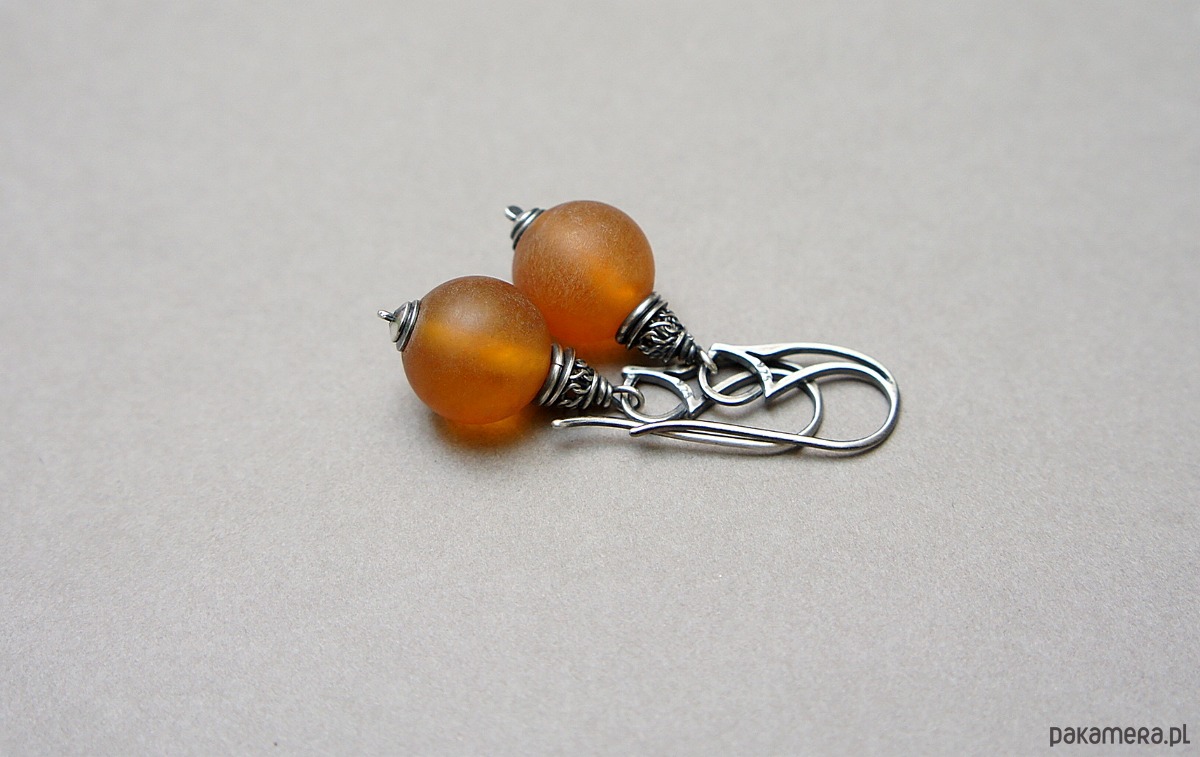 Kolczyki wykonane ze srebra [pr. 925] w połączeniu z kulami naturalnych matowych bursztynów [14mm] . Srebro o oksydowane i przetarte. Całkowita długość kolczyków 4,5cm. Biżuteria ozdobnie zapakowana.