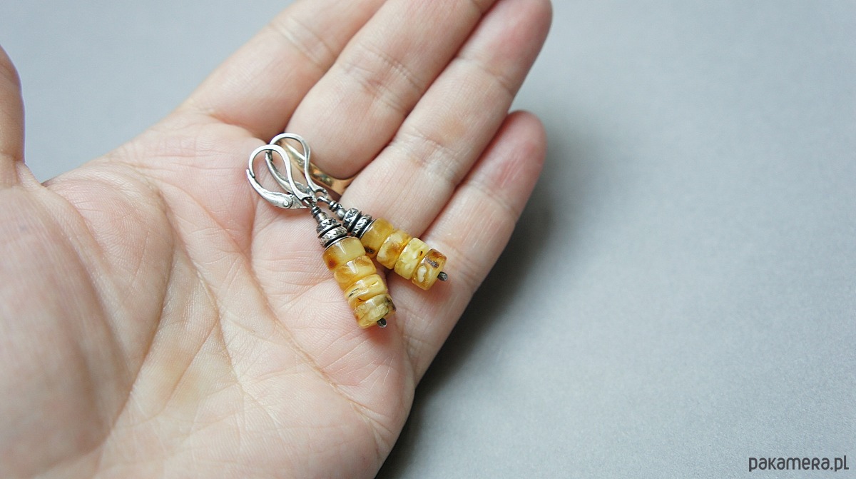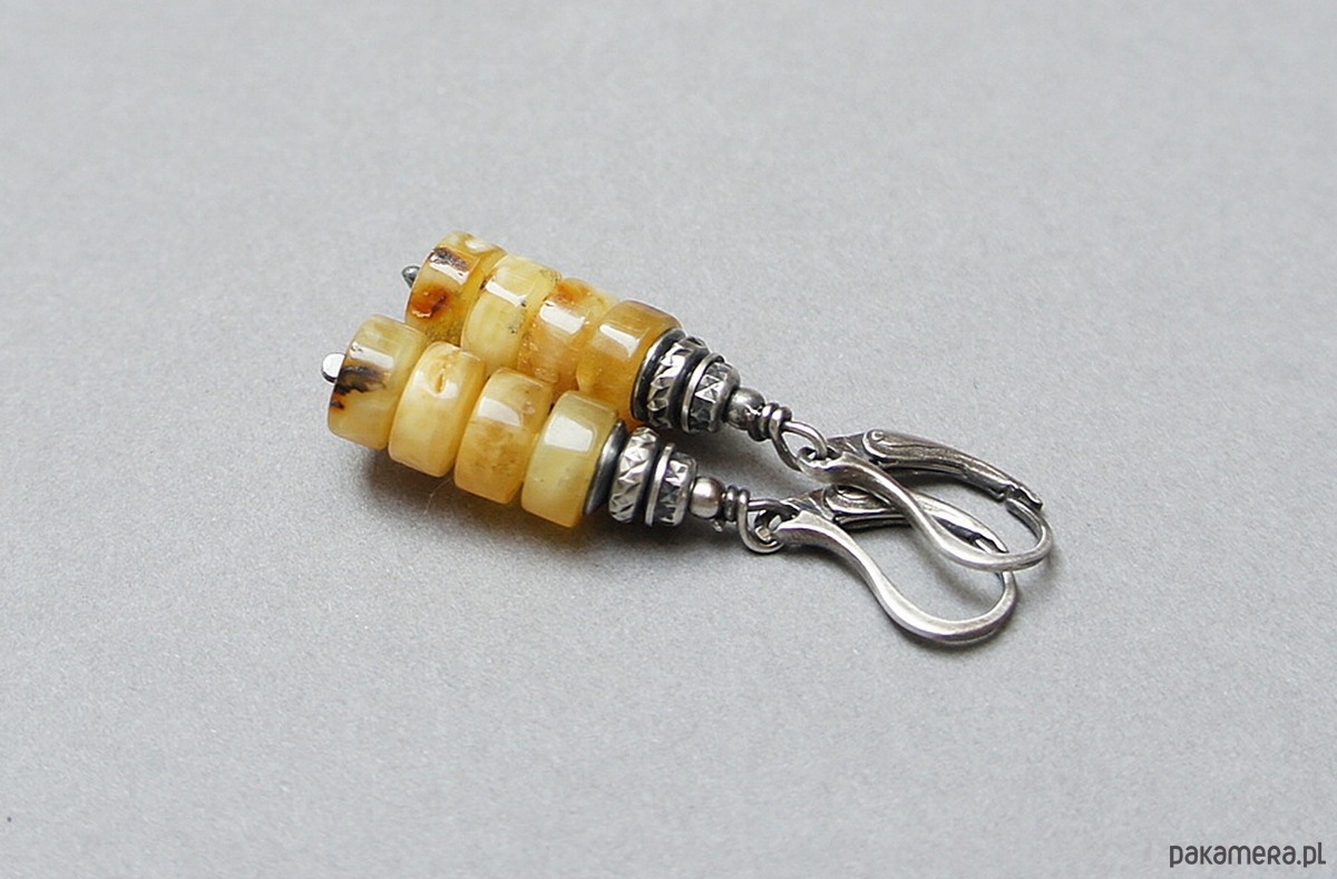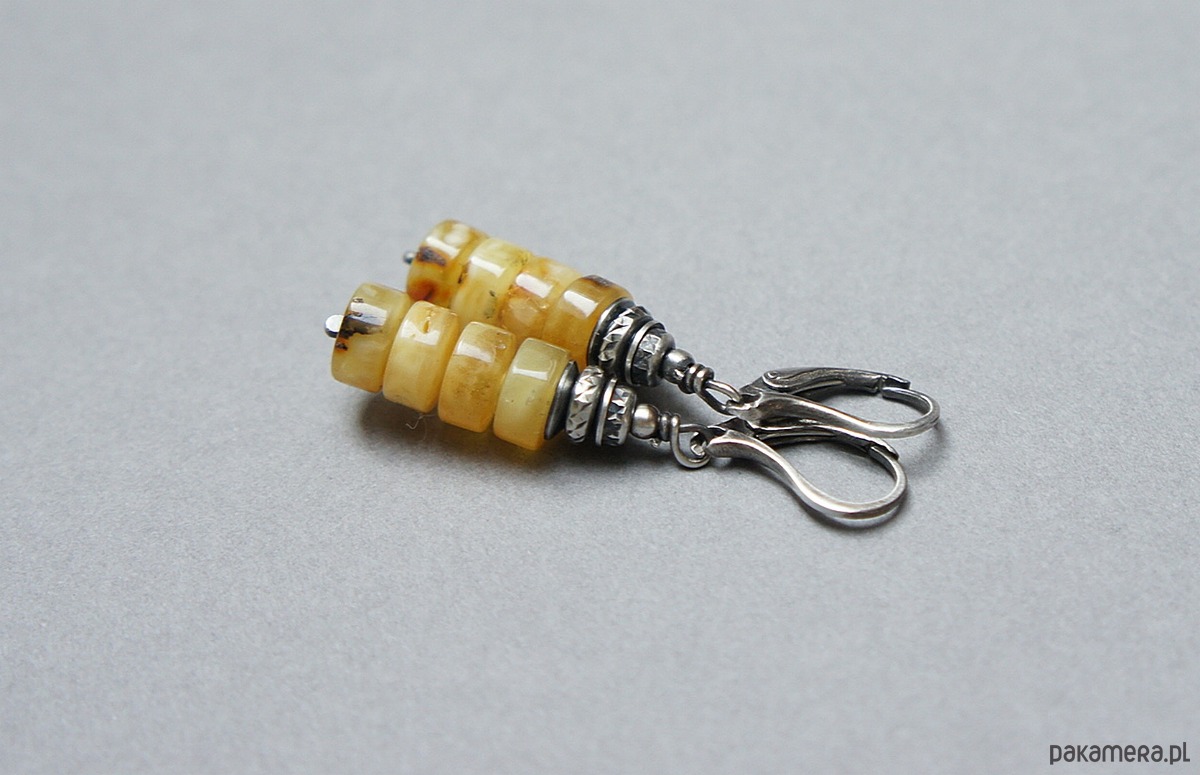 Kolczyki wykonane ze srebra [pr. 925] w połączeniu z plastrami bursztynów [8mm]. Srebro o oksydowane i przetarte. Całkowita długość kolczyków 4,5cm. Biżuteria ozdobnie zapakowana.