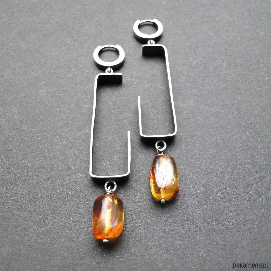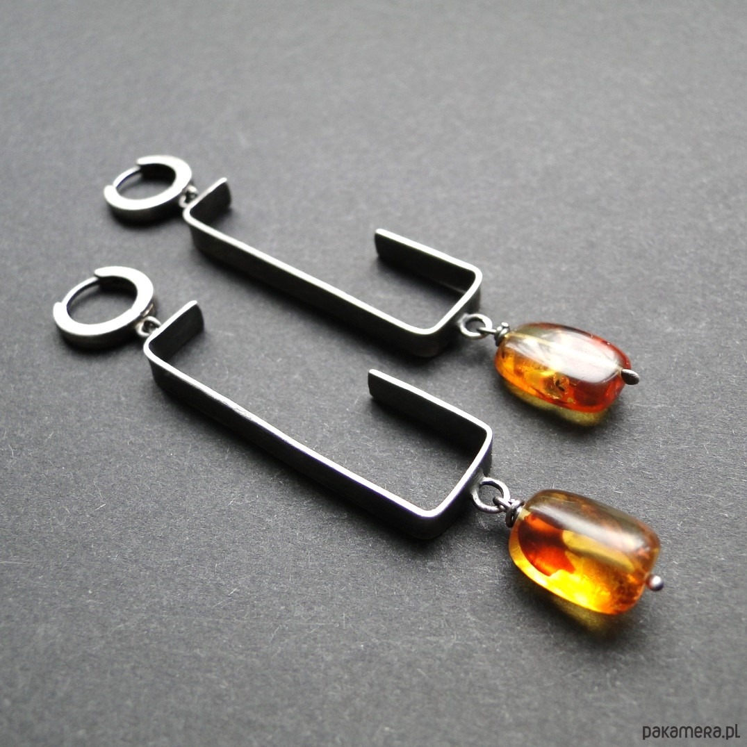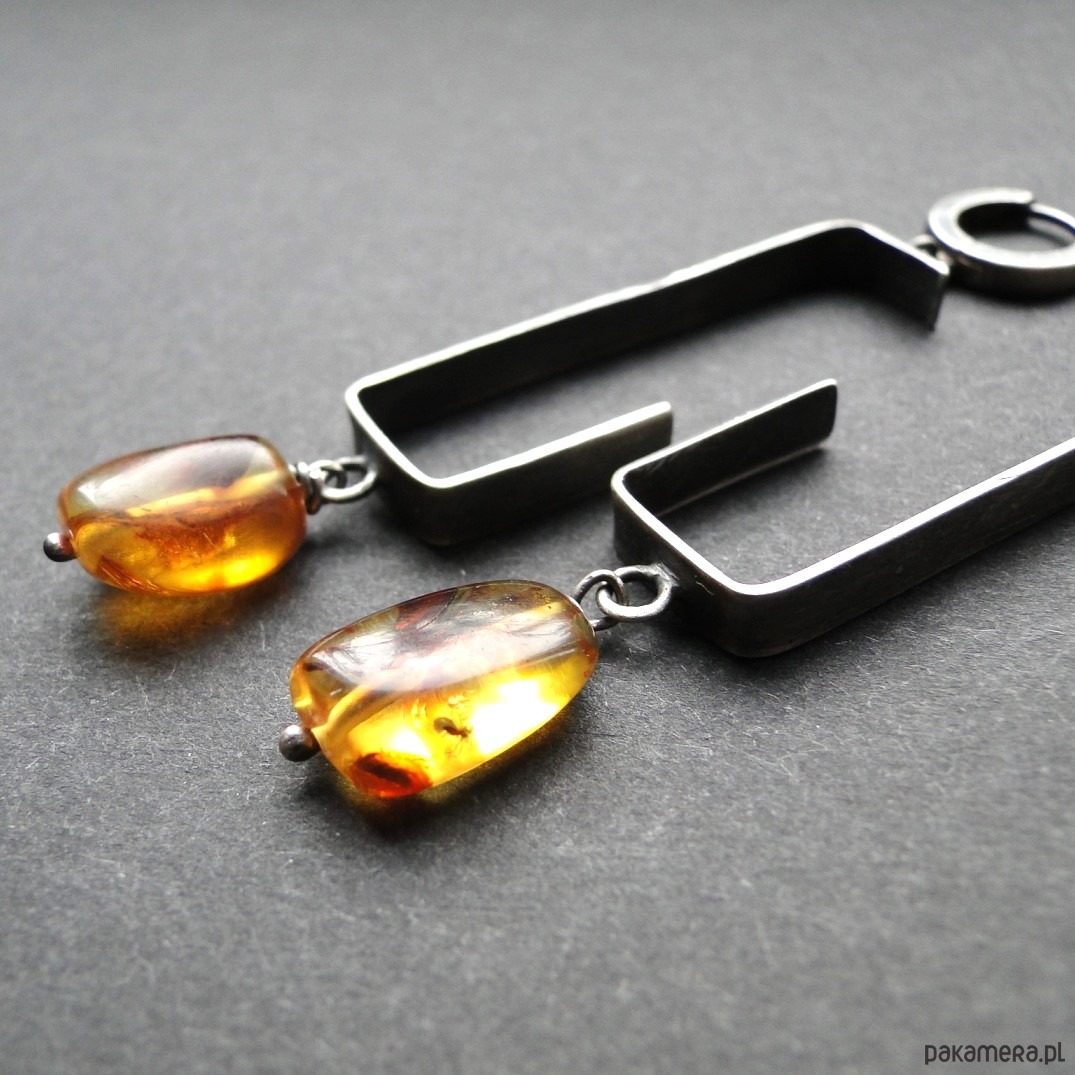 Surowe, geometryczne kolczyki wykonane ręcznie ze srebra 925. Oksydowane i szorowane. Prostokąty ręcznie wykonane i klepane. Naturalny bursztyn dł.11 i 12 mm. Bigle typu kajdanki. Długość kolczyków-7,6cm Bardzo lekkie. Masa Ag w kolczyku< 5g.