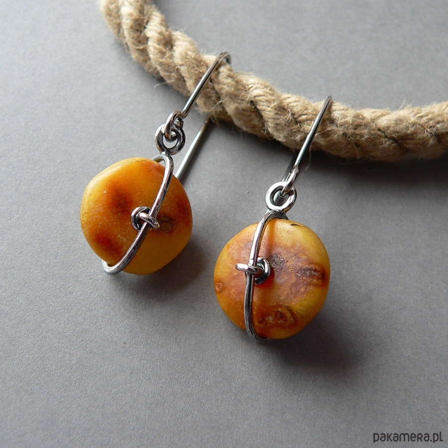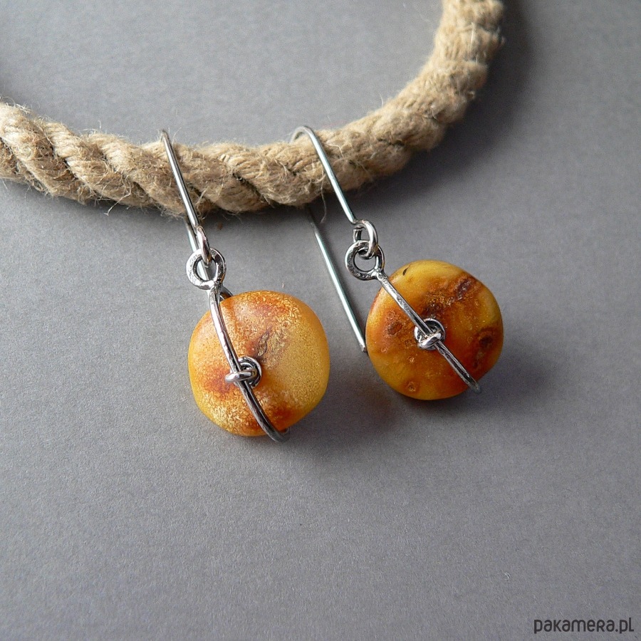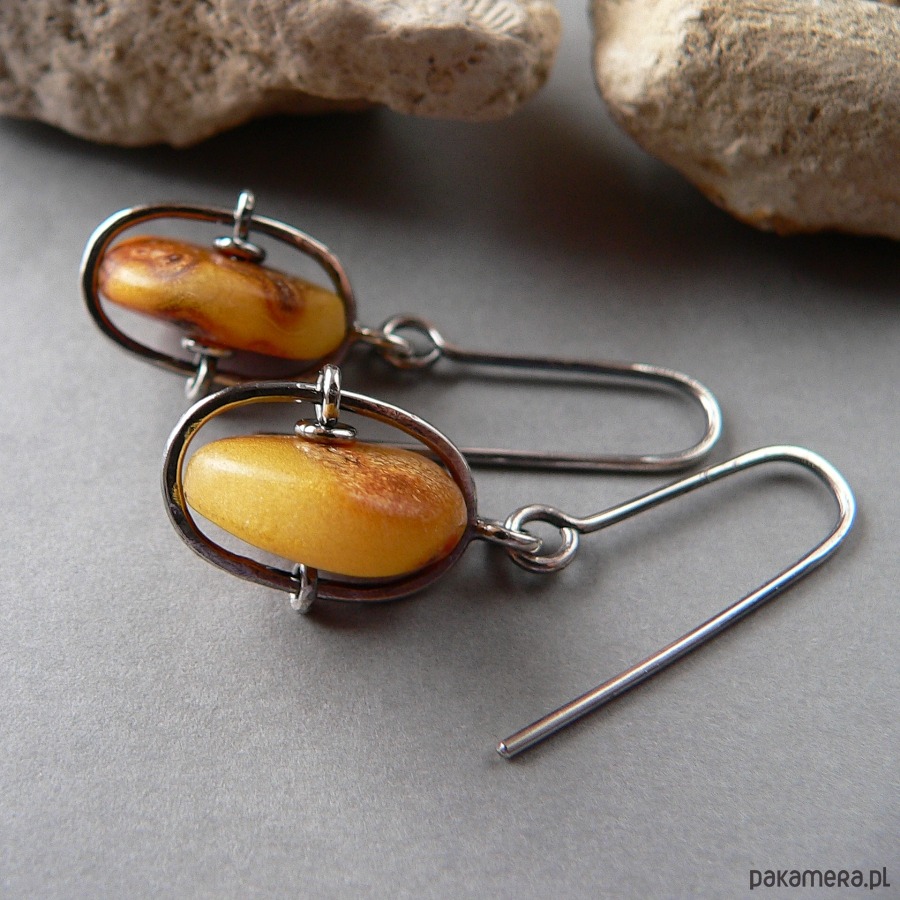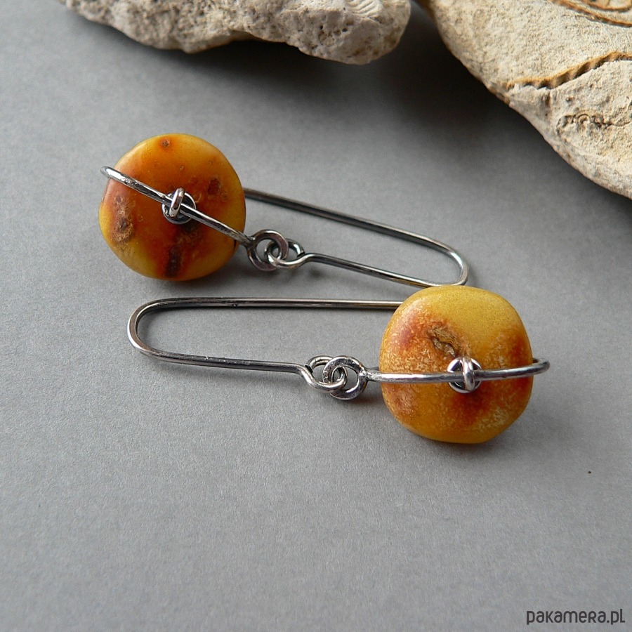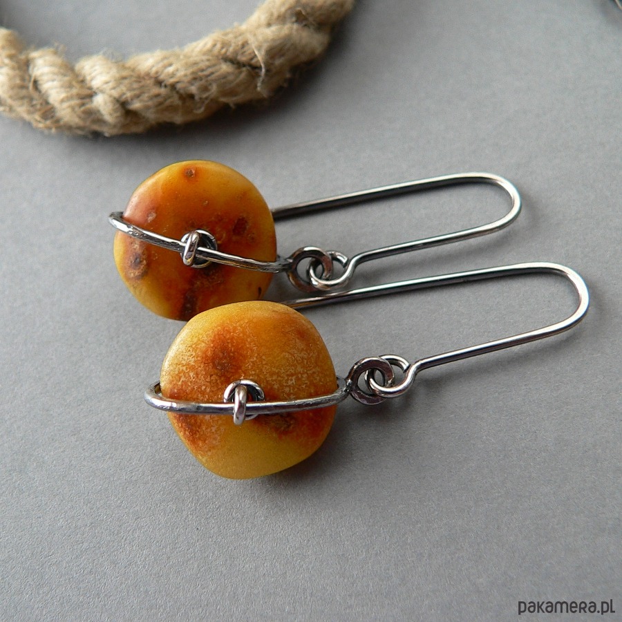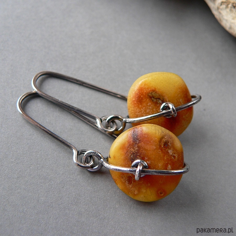 Lekkie, surowe, minimalistyczne kolczyki wykonane ze srebra i oryginalnie mocowanych nieregularnych , matowych pastylek bursztynu. Srebro kute, oksydowane i polerowane. Średnica bursztynów -1,6 cm, długość kolczyka 4,3 cm Bursztyny nie są identyczne.
