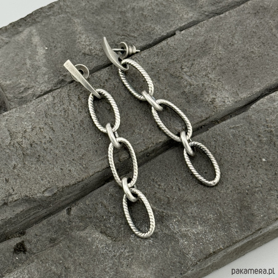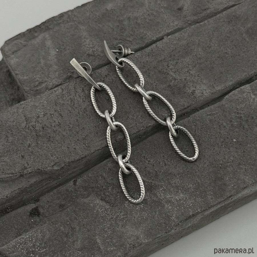 Minimalistyczne kolczyki na co dzień i nie tylko. Wykonana w całości z oksydowanego srebra próby 925 - masywnego, fakturowanego łańcucha, którego większe ogniwa maja wielkość 14,5x8 mm. Całkowita długość kolczyków to 6 cm. W mojej galerii jest dostępna bransoletka do kompletu. Mogę wykonać również podobny naszyjnik. Ozdobnie zapakowana.
