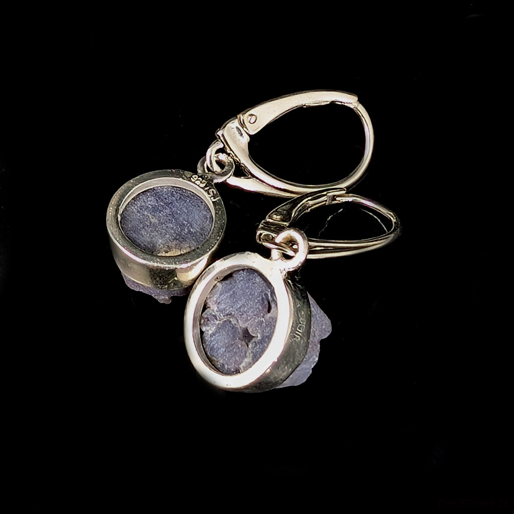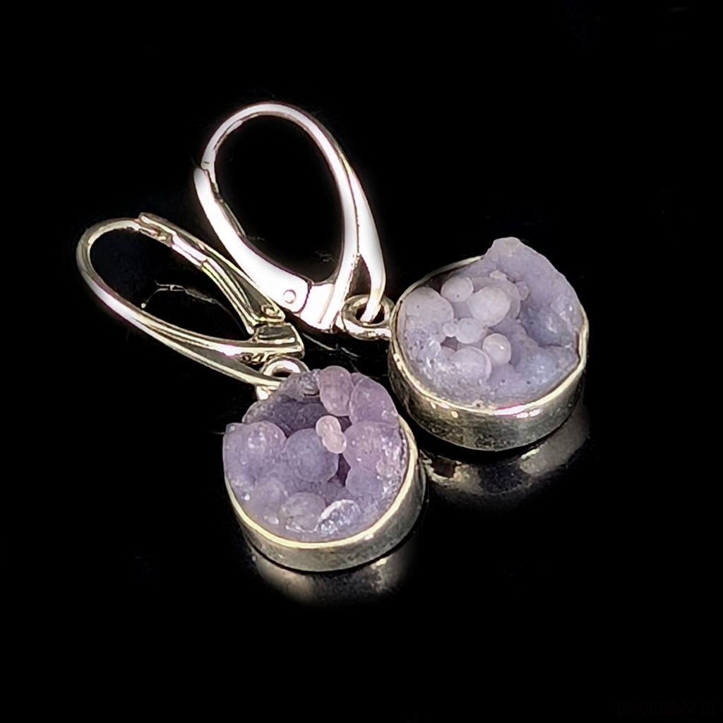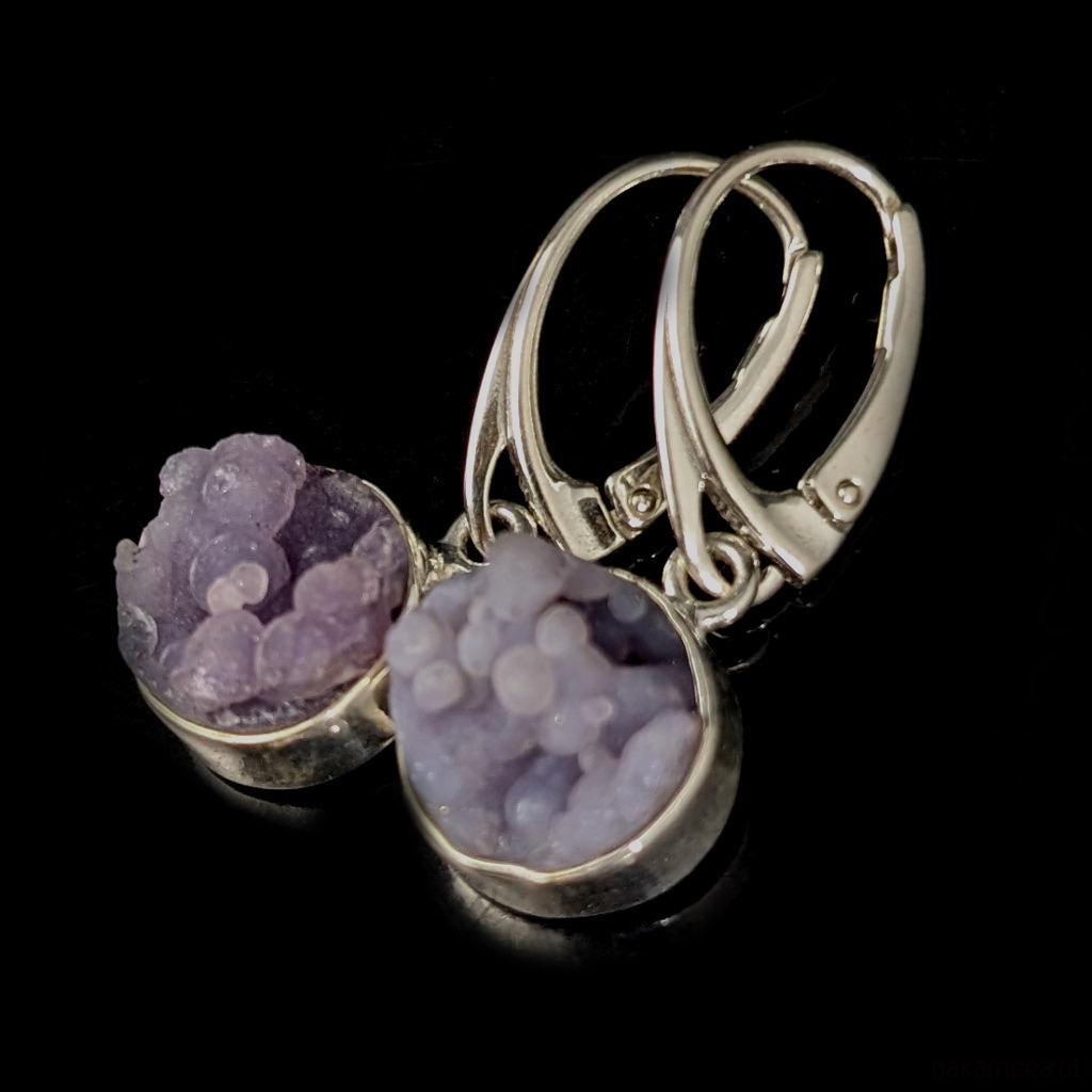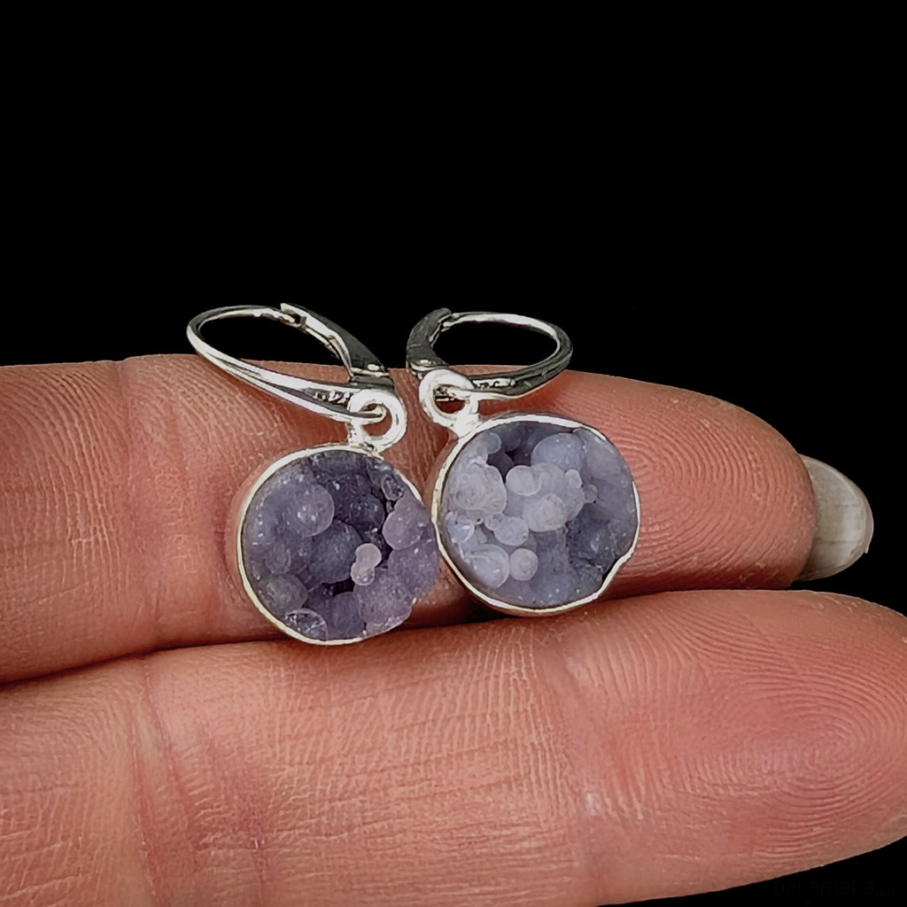 Kolczyki srebra pr 925 oraz chalcedonu winogronowego. Minerał o pięknej, stalowolawendowej barwie i budowie gronowej. Średnica12 mm. Długość max 32 mm. Waga jednego kolczyka 2,8 g. Kolczyki zostaną zapakowane w ozdobne pudełeczko.