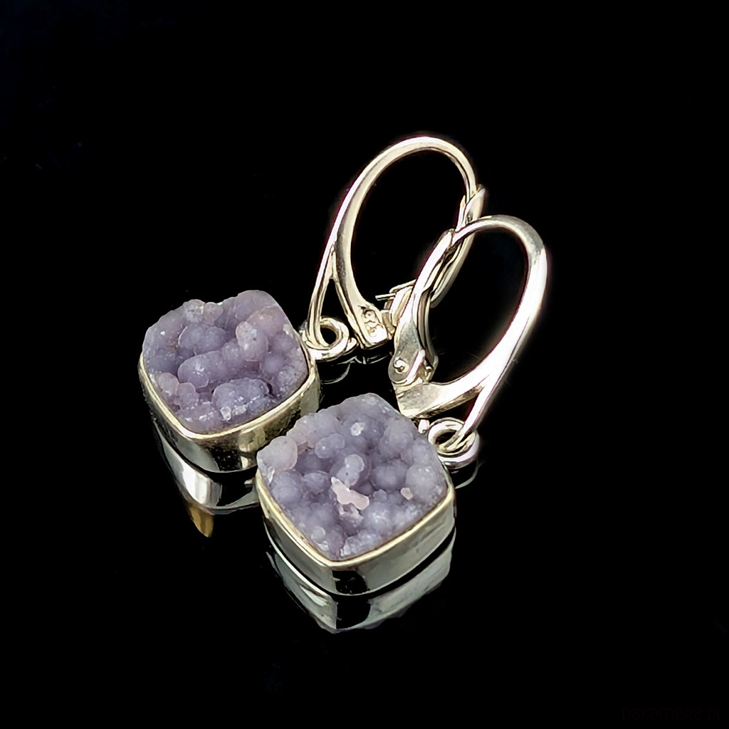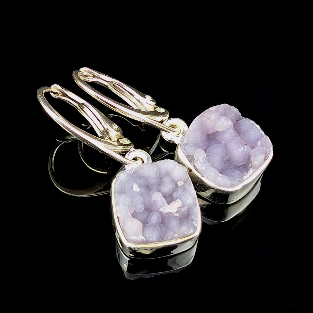 Kolczyki srebra pr 925 oraz chalcedonu winogronowego. Minerał o pięknej, stalowolawendowej barwie i budowie gronowej. Wymiary 11 x 10 mm. Długość max 28 mm. Waga jednego kolczyka 2,5 g. Kolczyki zostaną zapakowane w ozdobne pudełeczko.