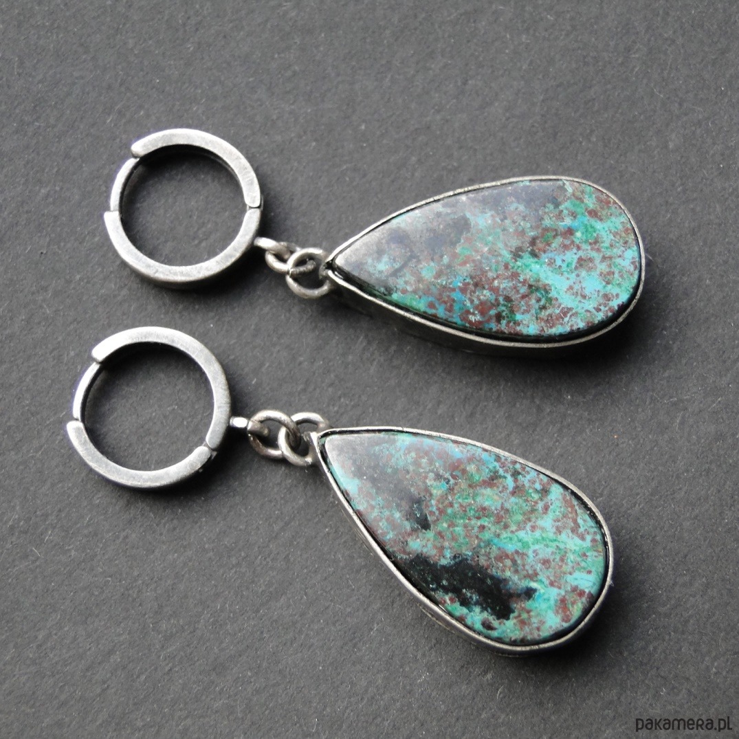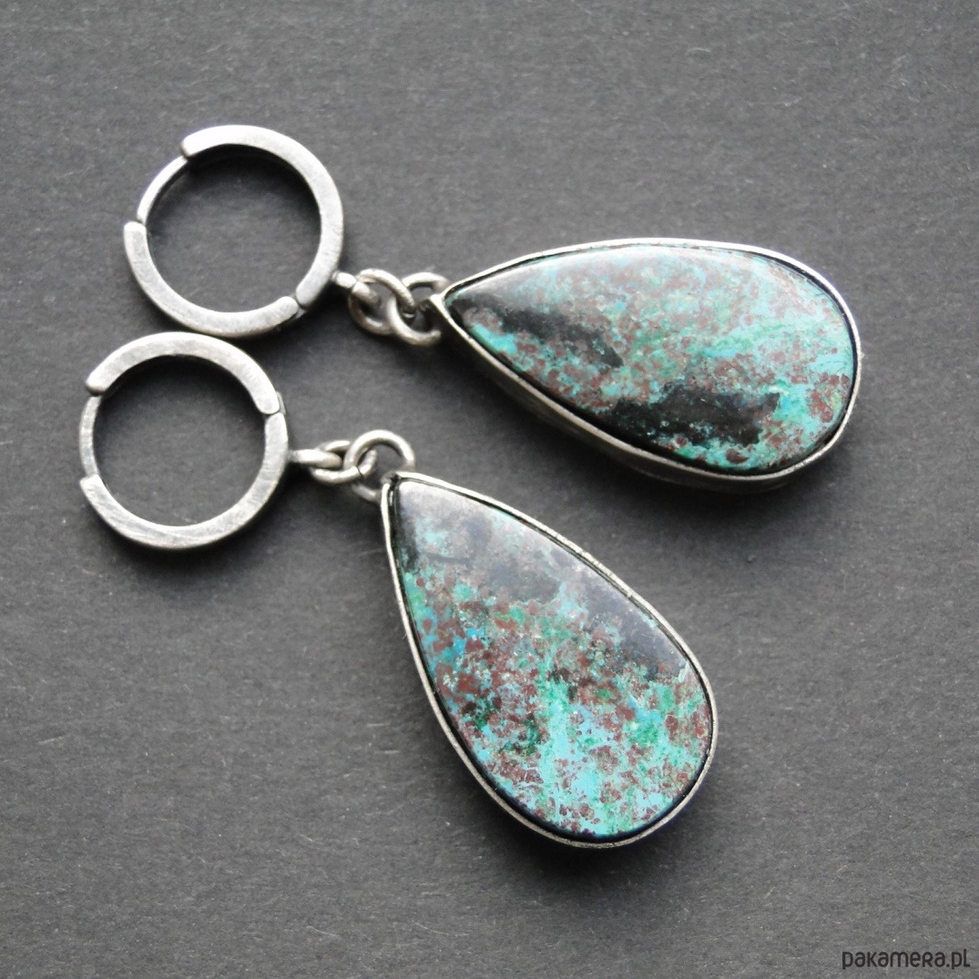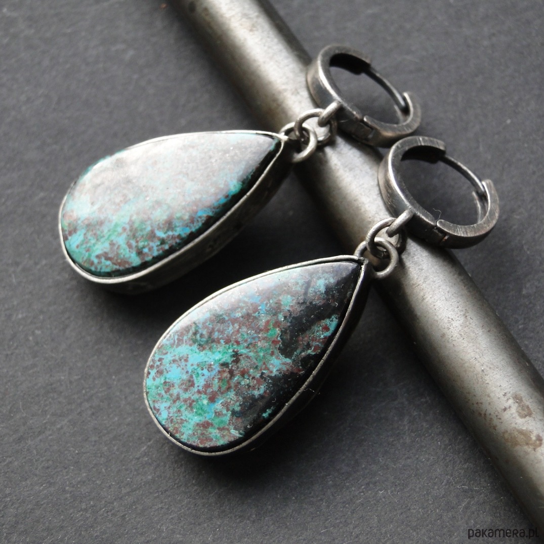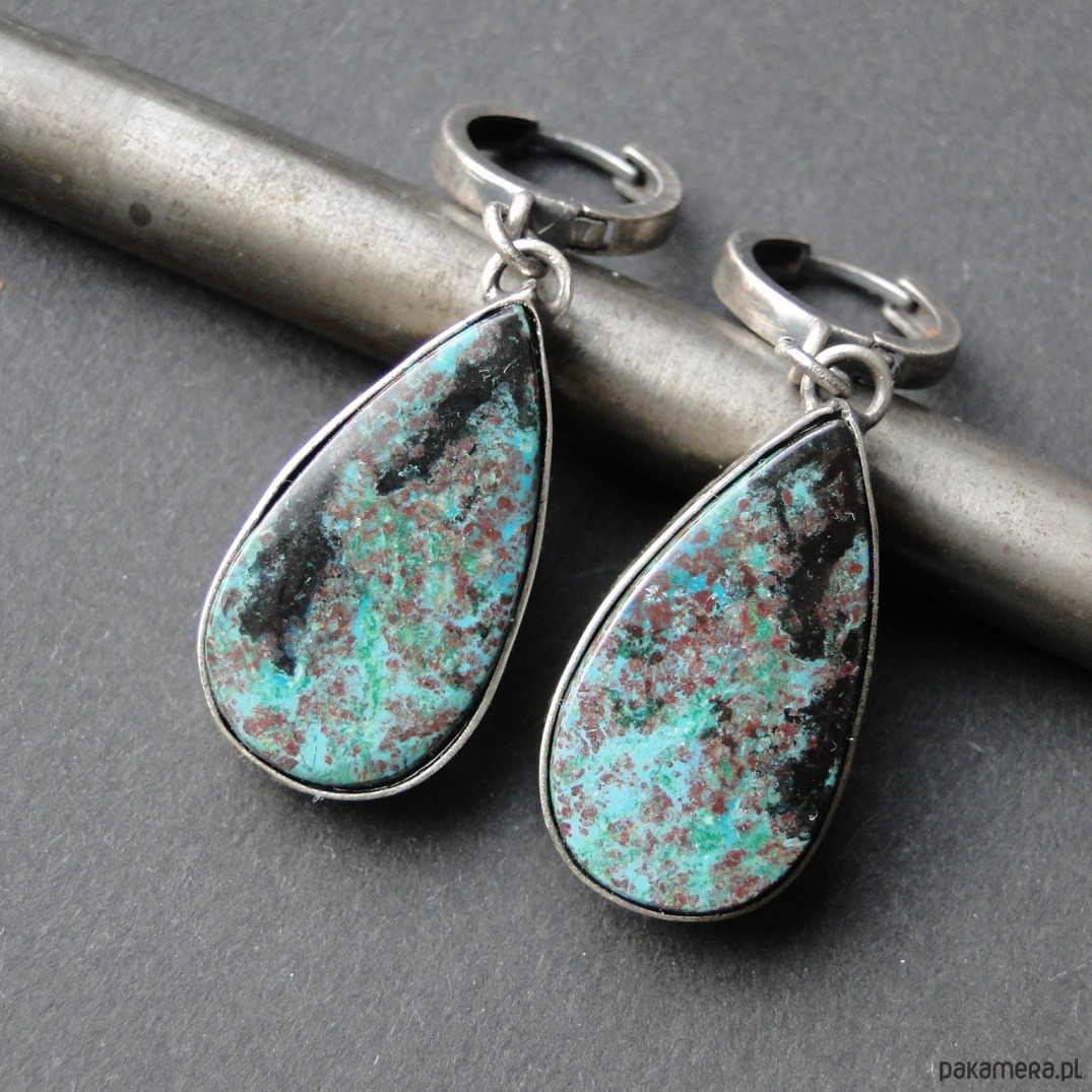 Kolczyki w modnym kolorze morskim,typowanym wg Pantone na kolor roku 2026. Surowe kolczyki z klasycznym akcentem. Piękny naturalny azuryt o wym. 25x13 mm. Srebro pr. 930,oksydowane i szorowane. Srebro surowo wykończone. Kamienie oprawione w kasetki,wklejane. Tył kolczyków-pełny ze srebra. Waga 1 kolczyka- 5,69g. Waga Ag jednego kolczyka poniżej 5g. Długość kolczyka wraz z biglem- 4,6 cm.