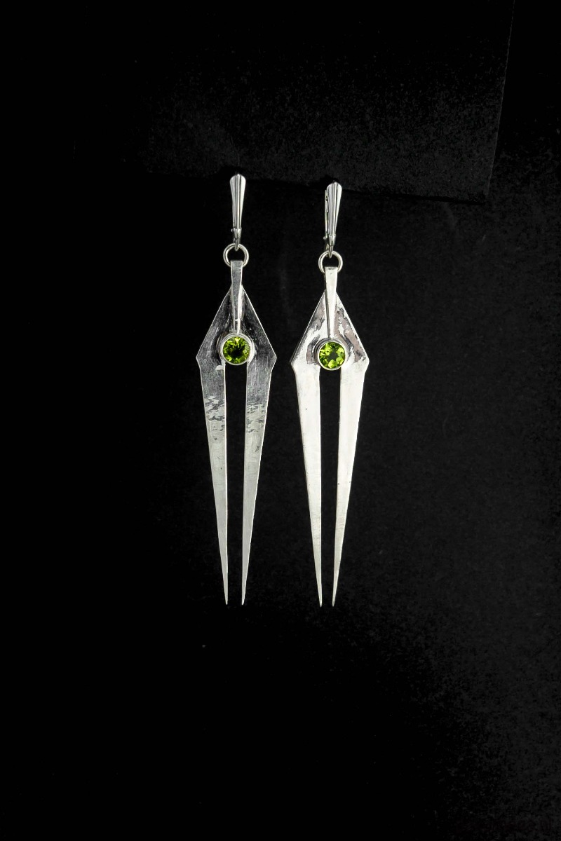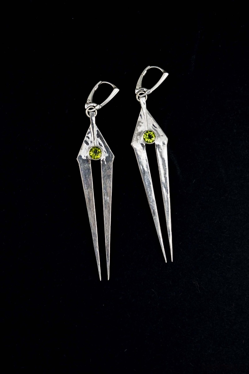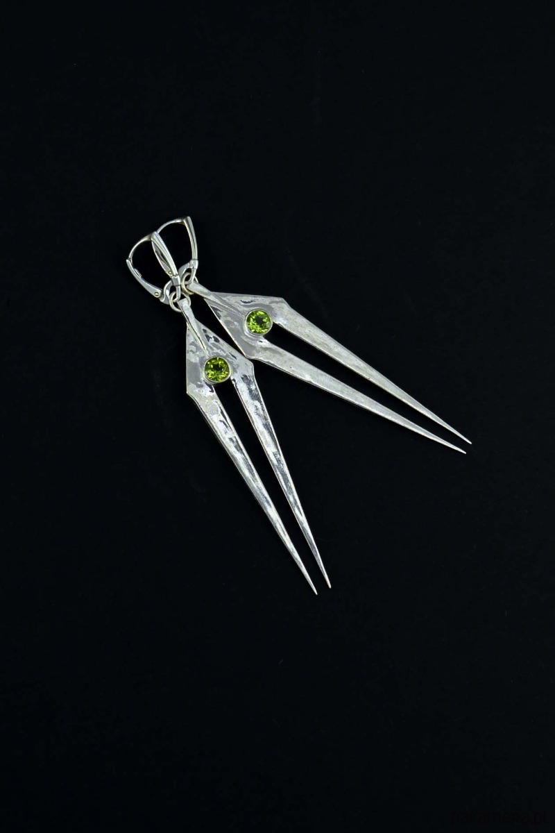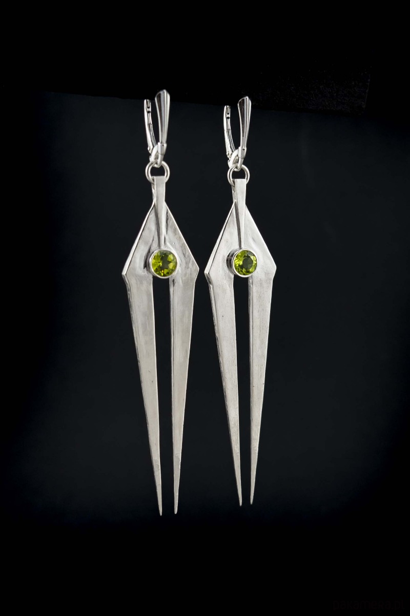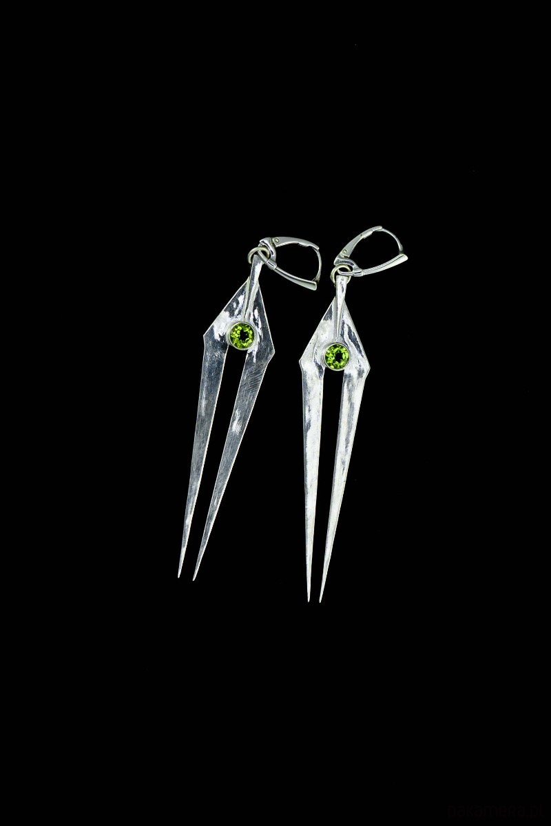 Kolczyki tworzące zderzenie dwóch epok – przeszłości i przyszłości. Wydłużony, ostry kształt przywołuje skojarzenia z grotami włóczni, amuletami, pradawnymi symbolami siły i kierunku. A jednak forma jest czysta, precyzyjna, niemal futurystyczna – jakby została wyrzeźbiona światłem. Chłodny połysk srebra i intensywna zieleń oliwinów tworzą napięcie – między ruchem a skupieniem, między ziemią a technologią. Nie tylko biżuteria – to symbol.