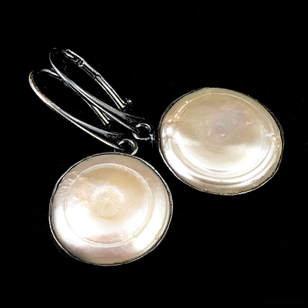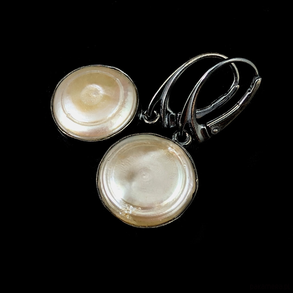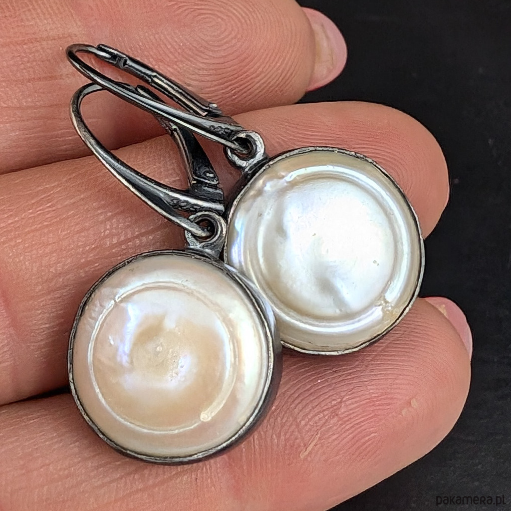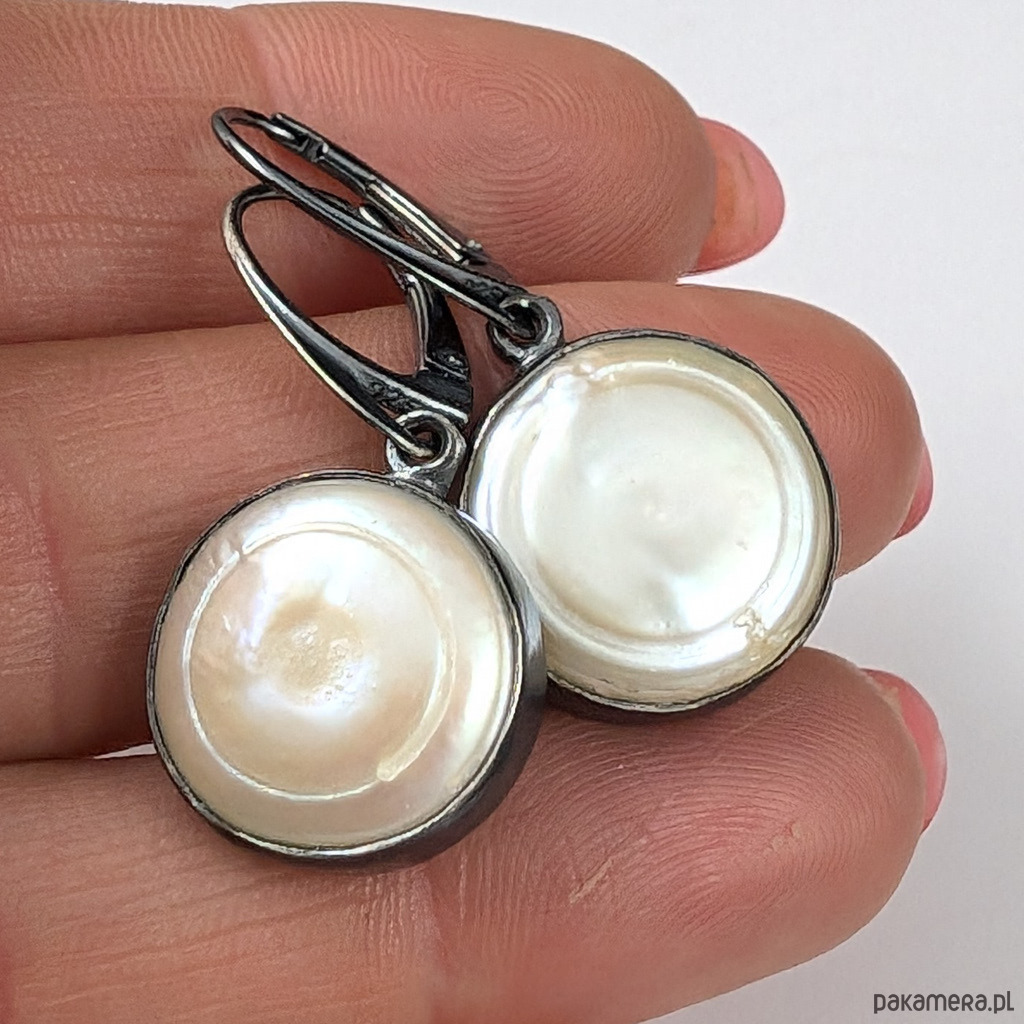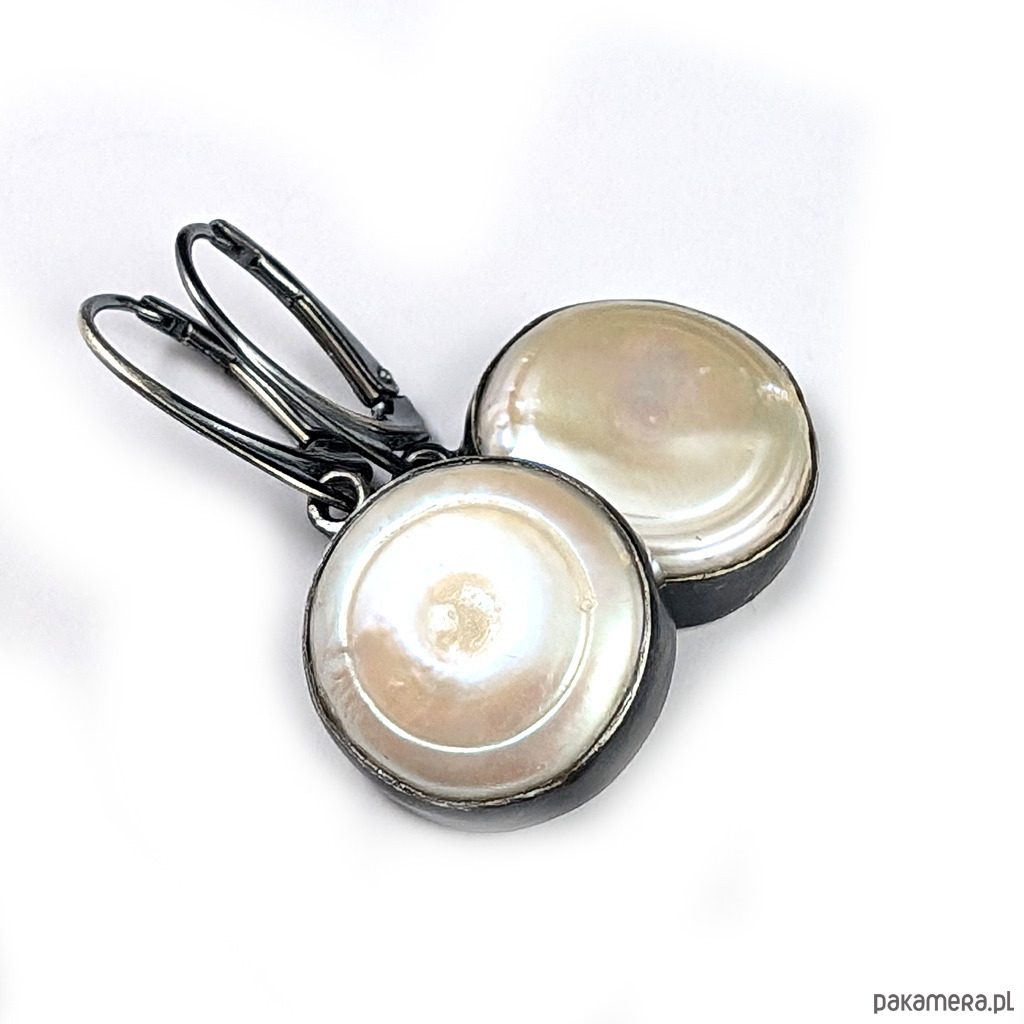 Kolczyki wykonane z oksydowanego srebra próby 925 z wkomponowanymi pięknymi perłami hodowlanymi. Ponadczasowa elegancja, klasyka z nutą awangardy. Średnica elementów 17 mm, długość z biglami 35 mm. Waga jednego kolczyka 4,4grama. Kolczyki zostaną zapakowane w ozdobne pudełeczko.