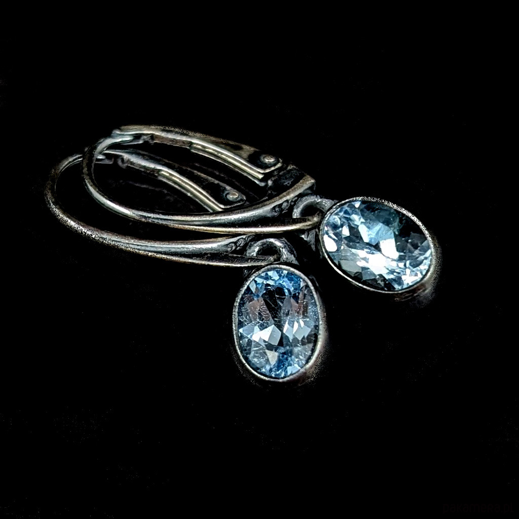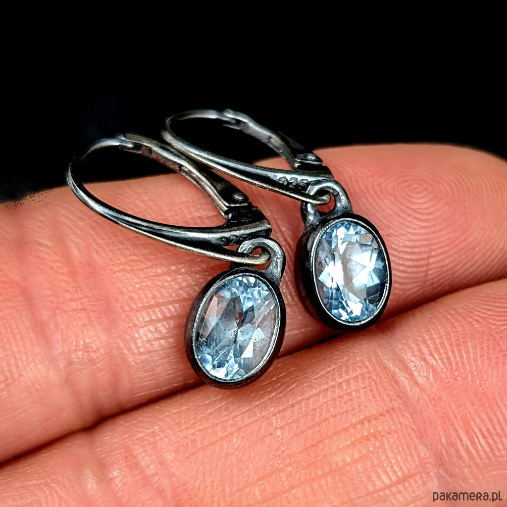 Kolczyki wykonane z oksydowanego srebra 925 oraz przepięknych błękitnych topażów. Wymiary elementów oprawy kamienia 9 x 7 mm. Zapinane na klasyczne bigle angielskie. Długość całości z biglami 28 mm. Leciutkie,waga jednego kolczyka 1,8 grama. Kolczyki zostaną zapakowane w ozdobne pudełeczko.
