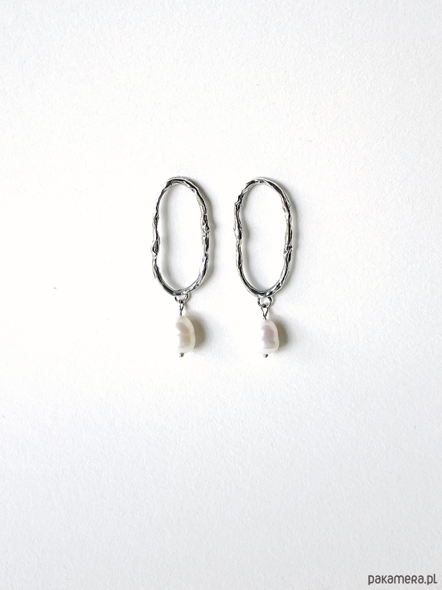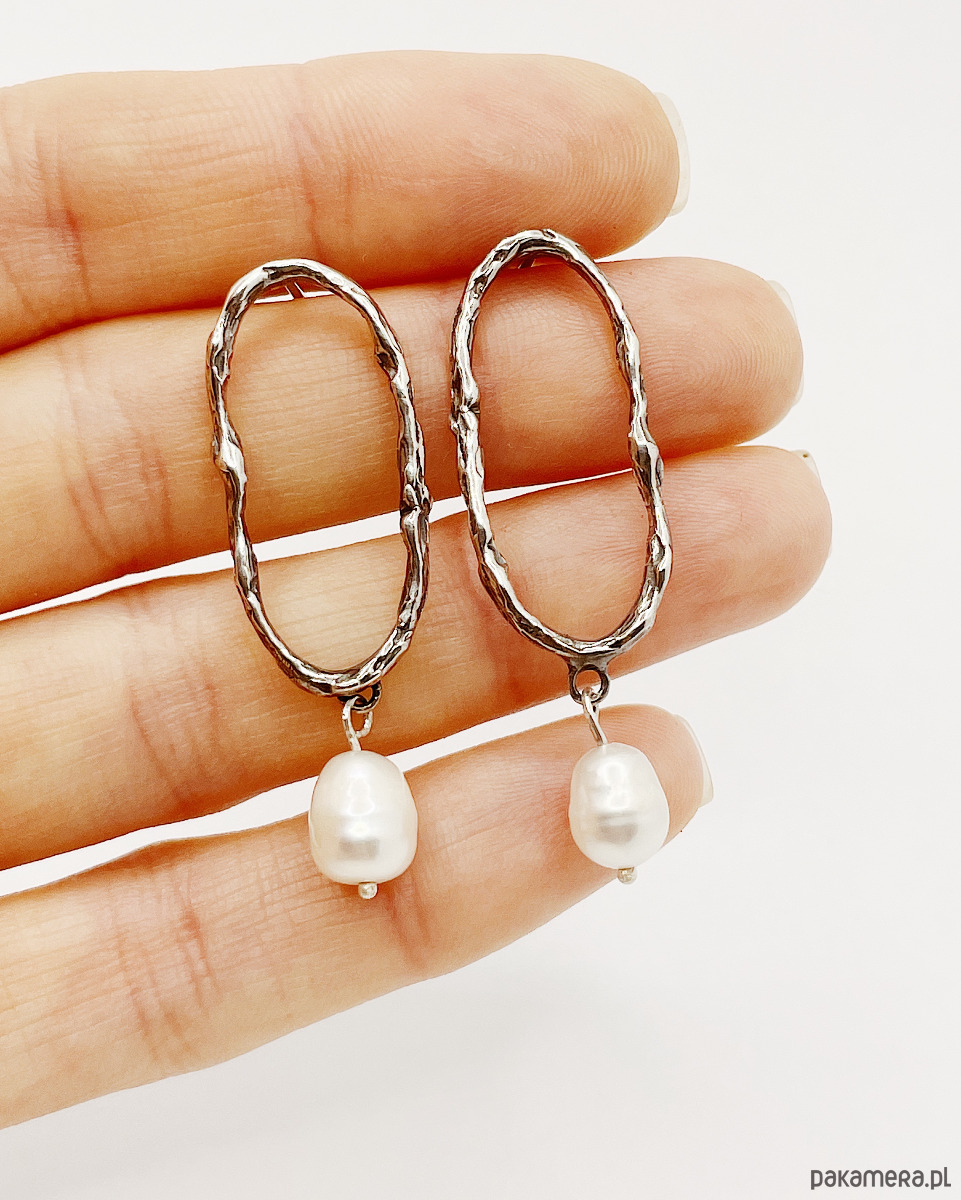Kolczyki nieregularne owale ozdobiona organiczną, swobodną fakturą o surowym charakterze i perłą hodowaną. Srebro oksydowane i przecierane.