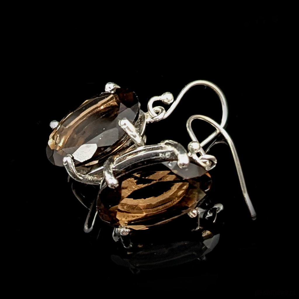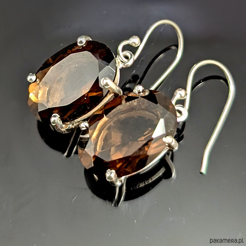 Eleganckie kolczyki wykonane ze srebra 925 oraz pięknych kwarców dymnych. Kamienie zachwycają piękną barwą spotęgowaną precyzyjnym szlifem. Wymiary elementów oprawy kamienia 18 x 13 mm. Długość całości z biglami 33 mm. Bigle mogę zmienić na angielskie. Waga jednego kolczyka 4,4 grama. Kolczyki zostaną zapakowane w ozdobne pudełeczko.