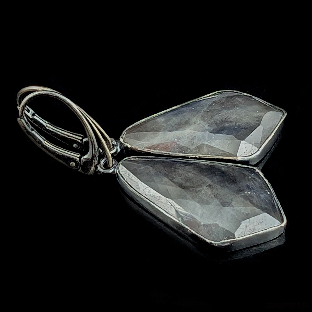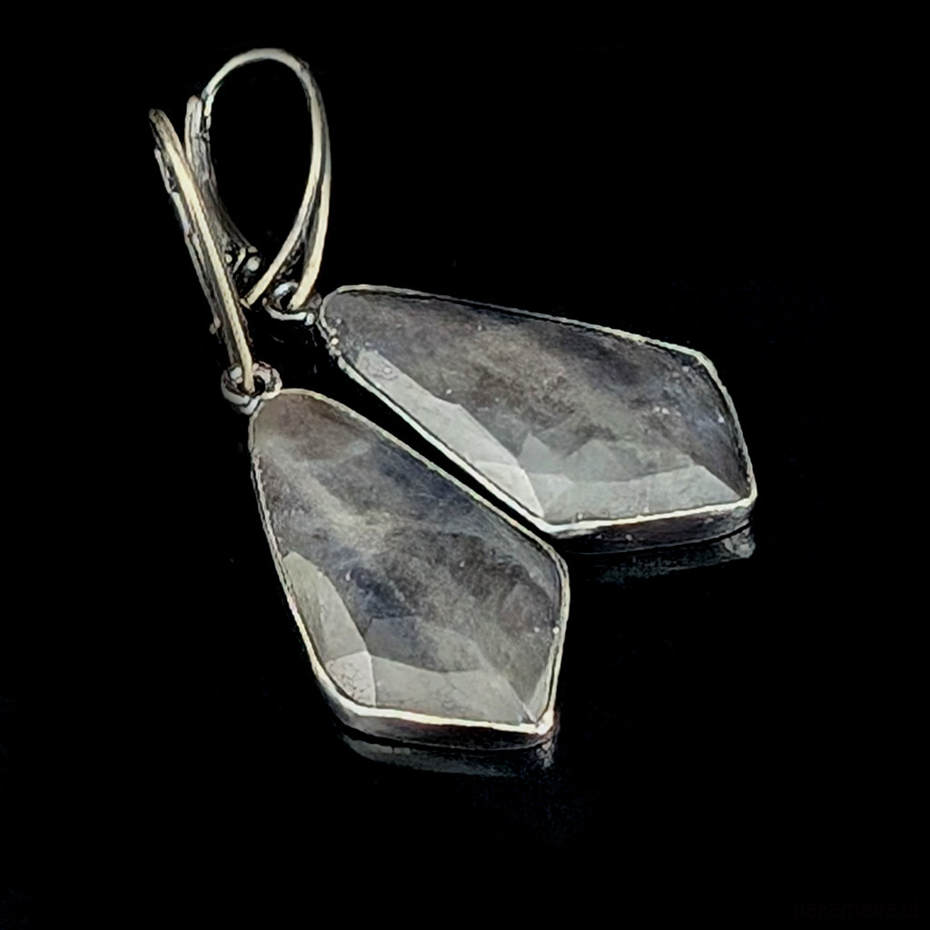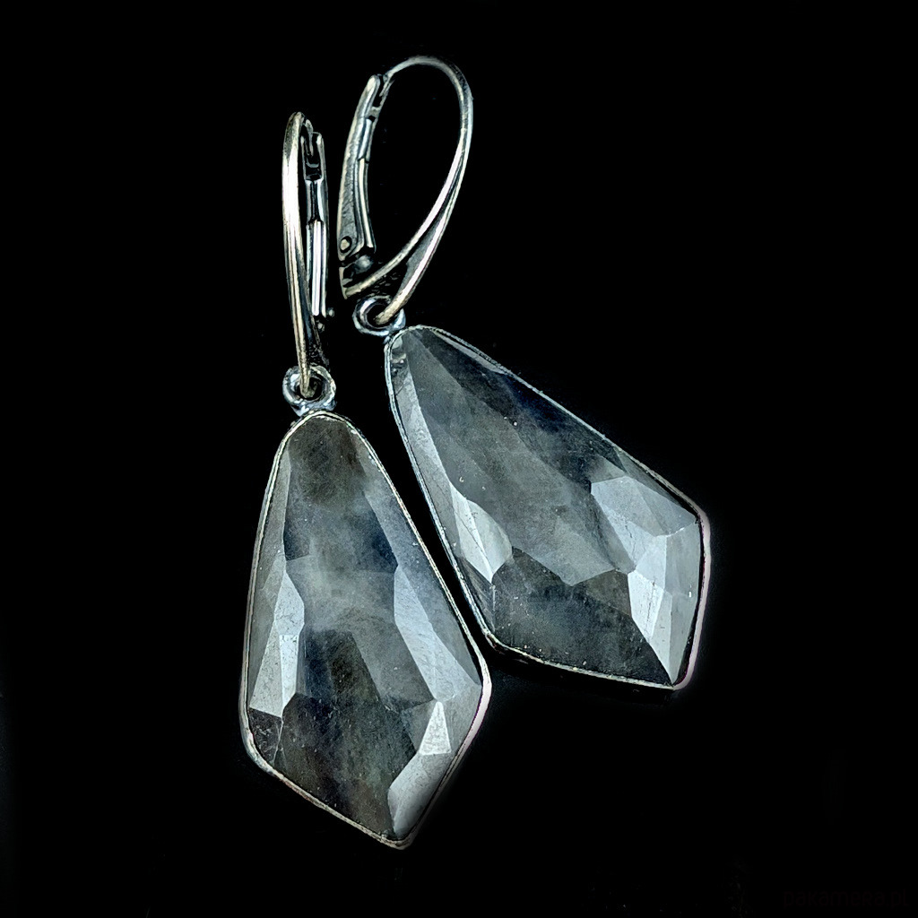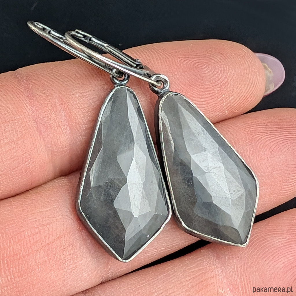 Tajemnicze szafiry o fasetowanej tafli w oprawie oksydowanego srebra próby 925. Wymiary oprawy kamieni 28 x 15 mm, długość z biglami 46 mm. Waga jednego kolczyka 5,7 g. Kolczyki zostaną zapakowane w ozdobne pudełeczko.