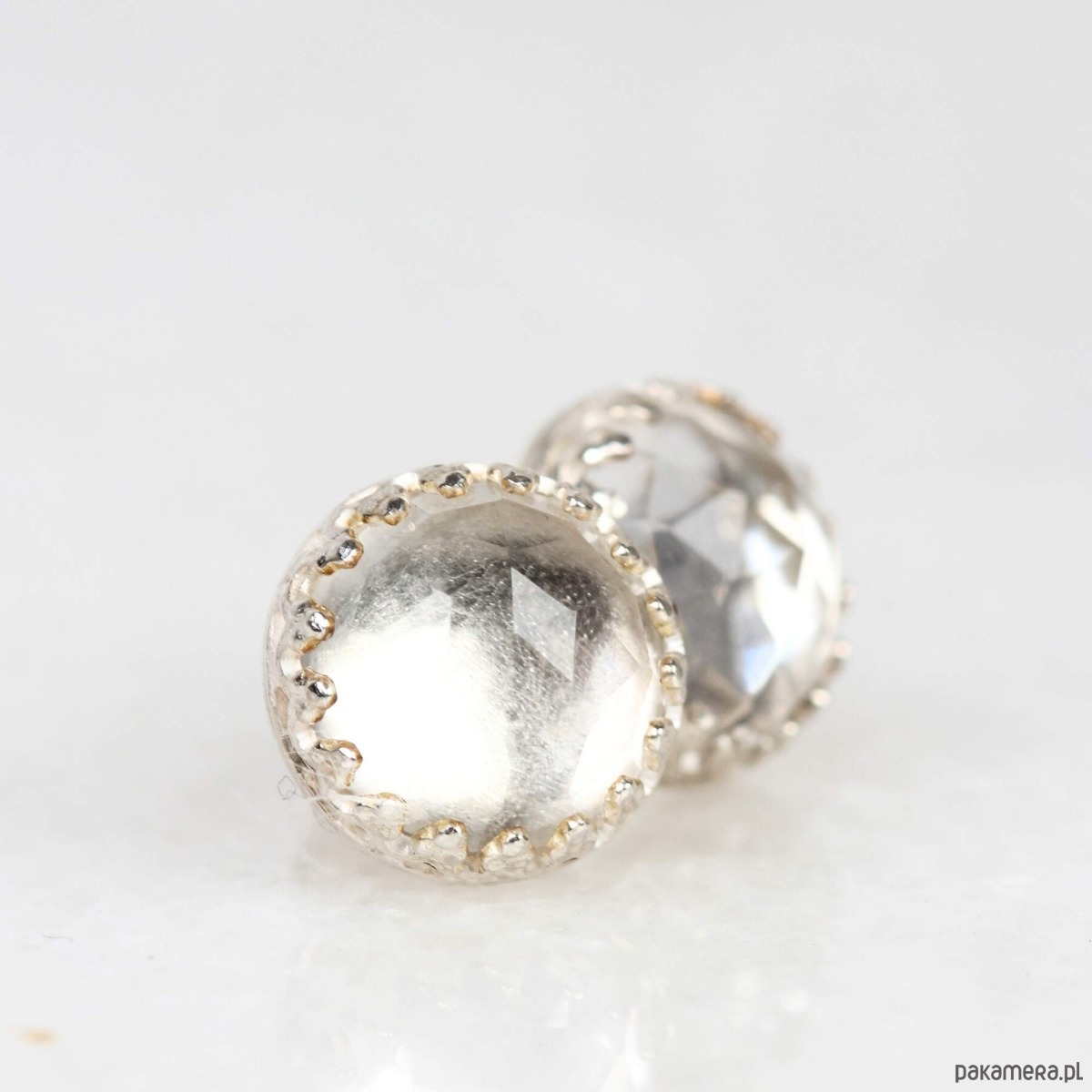 Ręcznie wykonane kolczyki ze srebra z kryształem górskim z pięknym wykończeniem retro wokół kamienia.