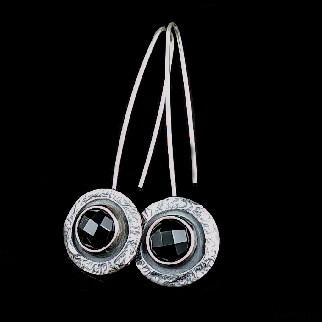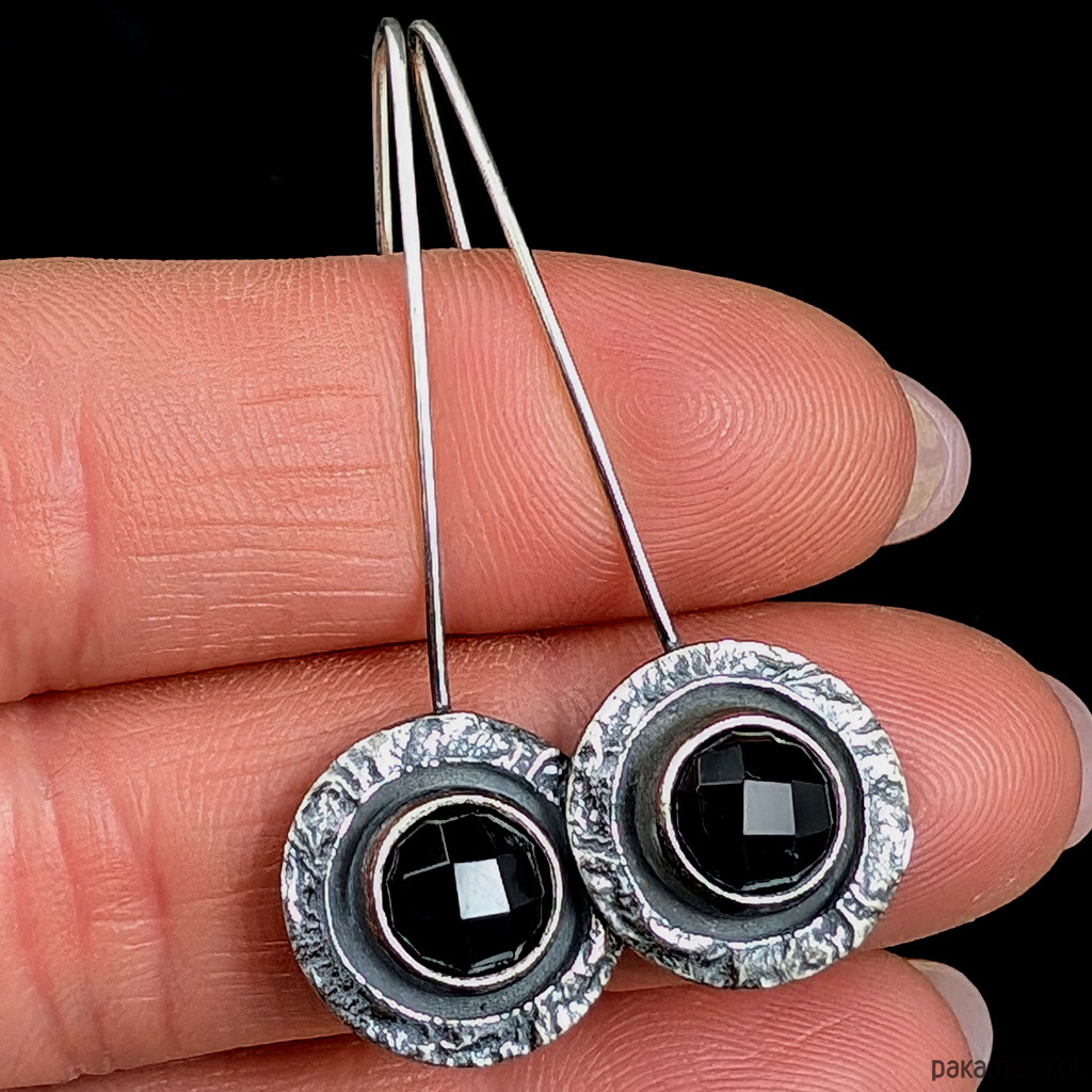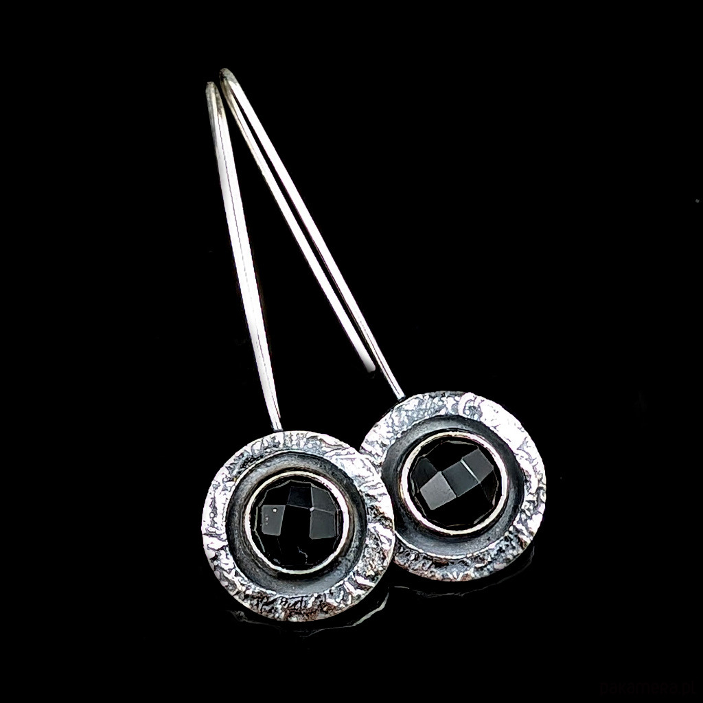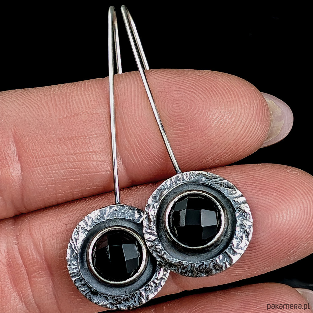Eleganckie kolczyki wykonane z oksydowanego srebra 925 oraz onyksów. Wymiary elementów oprawy kamienia 15 mm. Dugie i smukłe dzięki otwartym biglom (w zestawie silikonowe zatyczki). Długość całości z biglami 45 mm. Leciutkie,waga jednego kolczyka 3 g, Kolczyki zostaną zapakowane w ozdobne pudełeczko.
