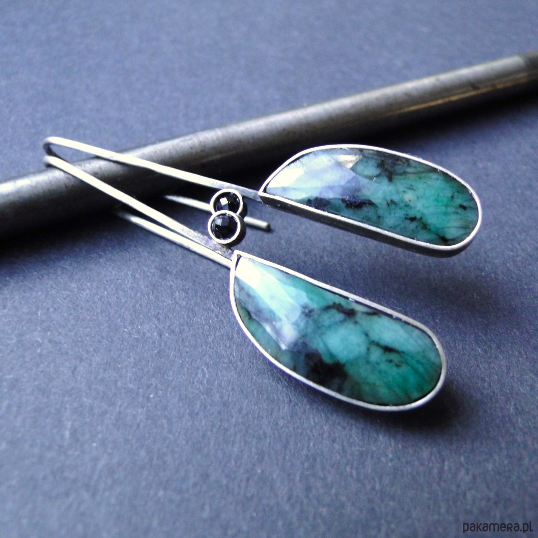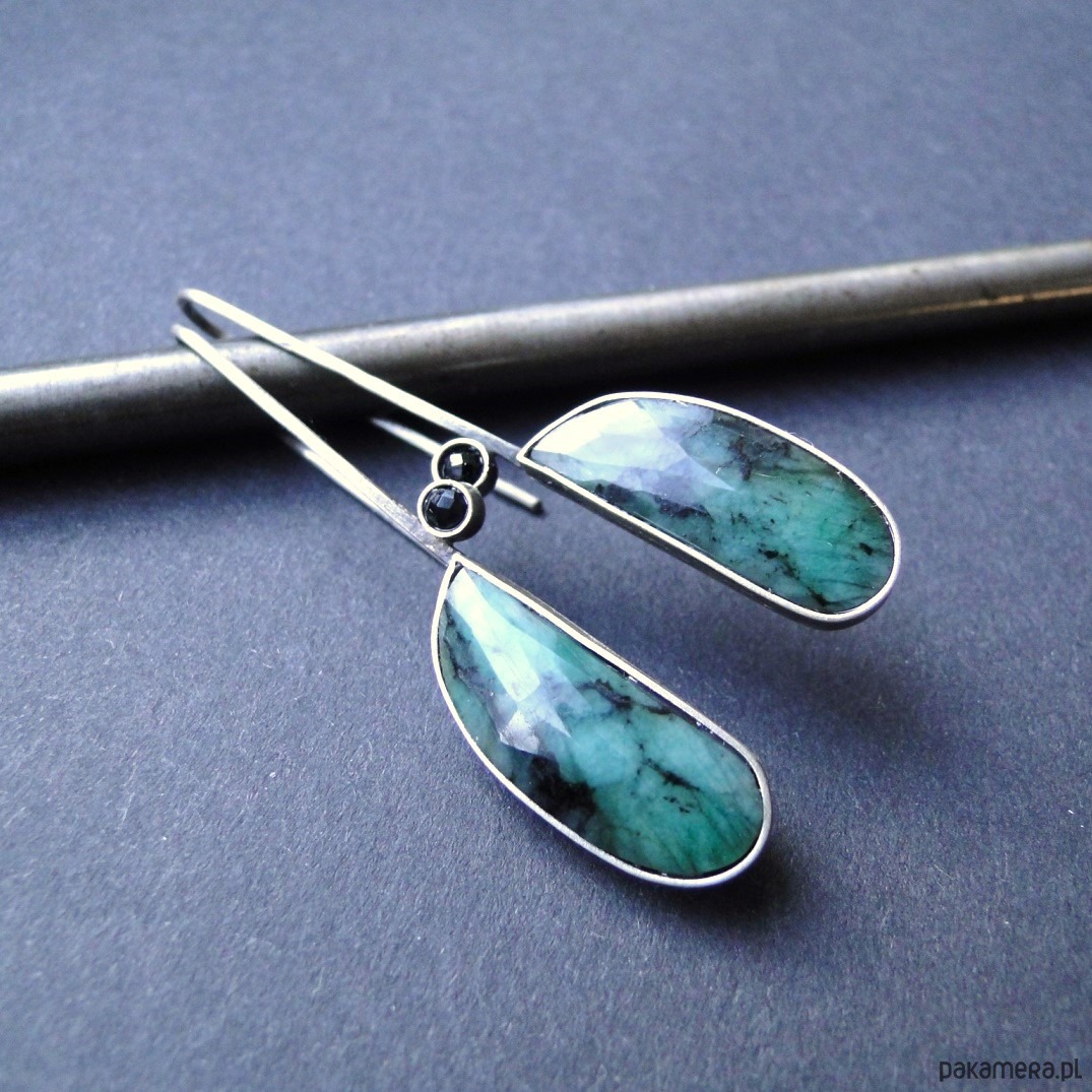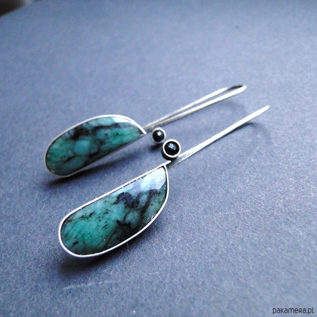 Oryginalne kolczyki w pojedynczym egzemplarzu. Wykonane ręcznie wg tradycyjnych technik jubilerskich. Srebro 930,oksydowane i szorowane. Piekne naturalne szmaragdy fasetowane z czarnymi wstawkami,dł.2,5cm. Małe czarne spinele śr.3mm. Bigle typu zawieszki,przekładane przez ucho. Kolczyki dość lekkie: waga kolczyka 3,43g. Długość całkowita-5,7cm. Nie moczyć w wodzie.