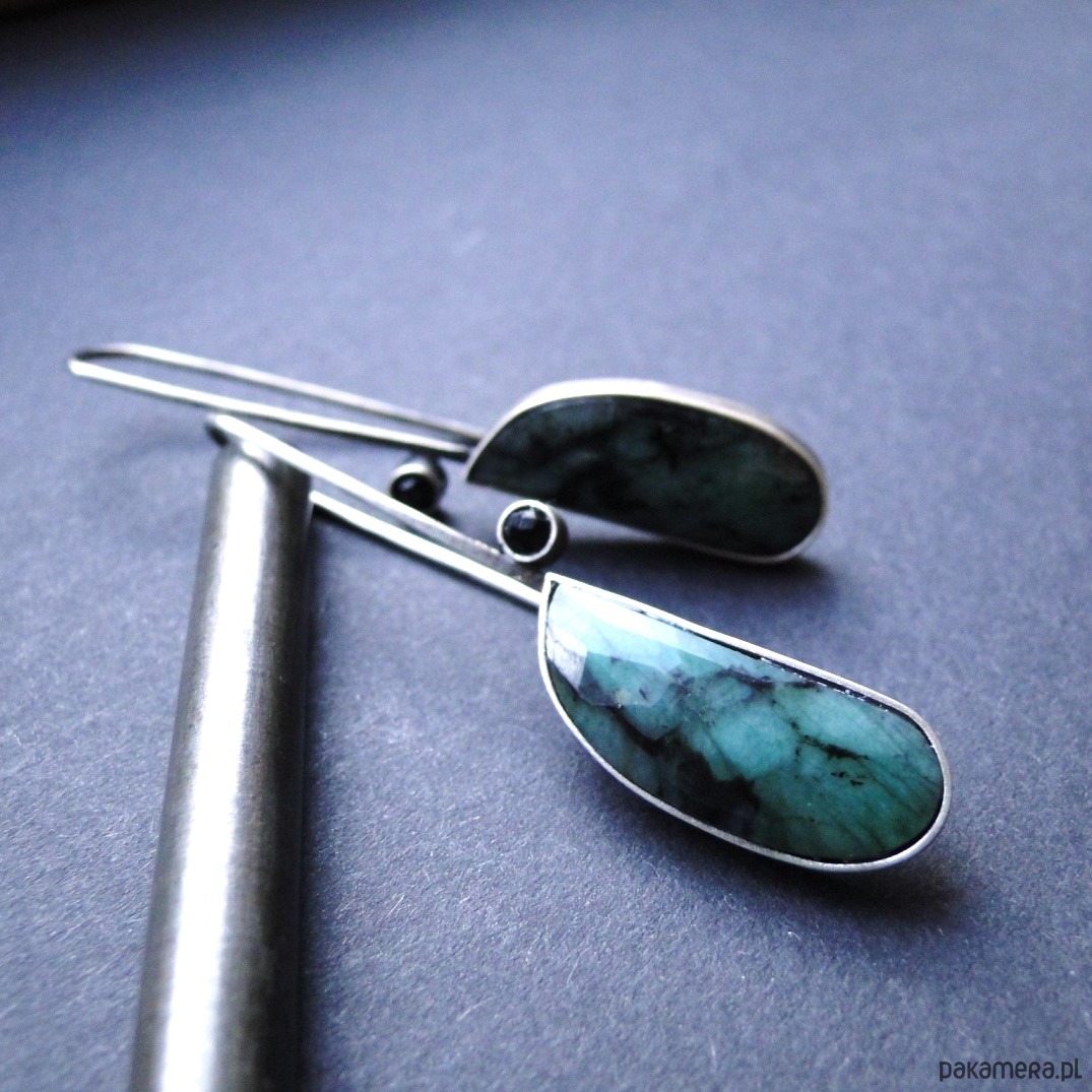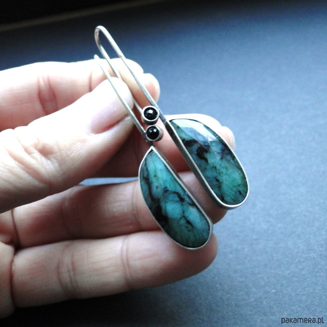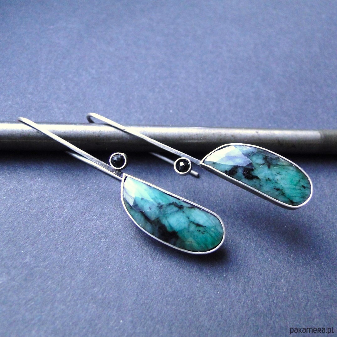 Oryginalne kolczyki w pojedynczym egzemplarzu. Wykonane ręcznie wg tradycyjnych technik jubilerskich. Srebro 930,oksydowane i szorowane. Piekne naturalne szmaragdy fasetowane z czarnymi wstawkami,dł.2,5cm. Małe czarne spinele śr.3mm. Bigle typu zawieszki,przekładane przez ucho. Kolczyki dość lekkie: waga kolczyka 3,43g. Długość całkowita-5,7cm. Nie moczyć w wodzie.