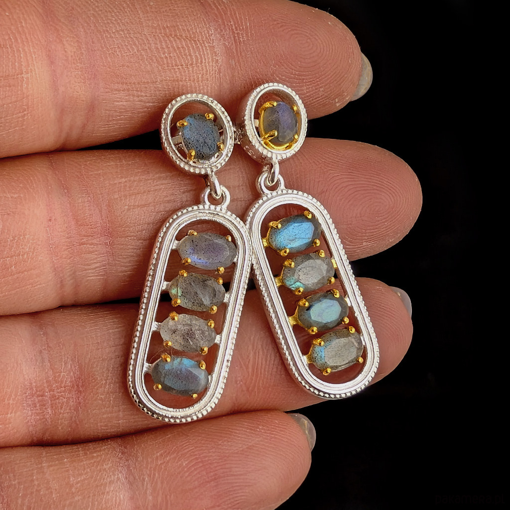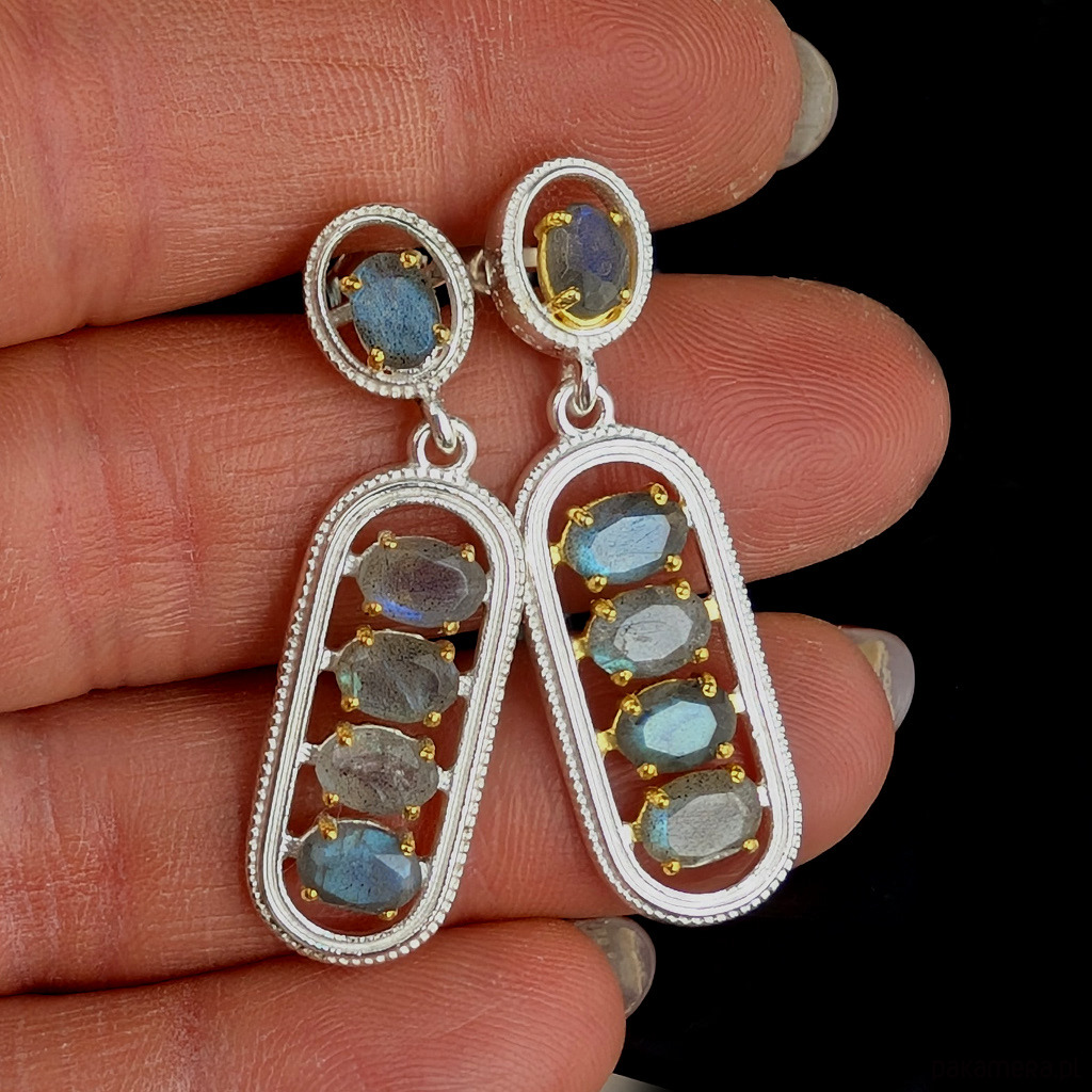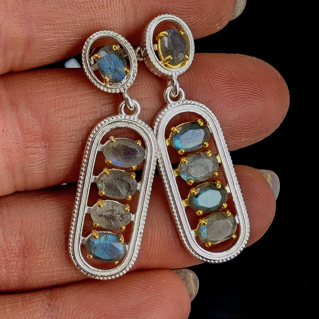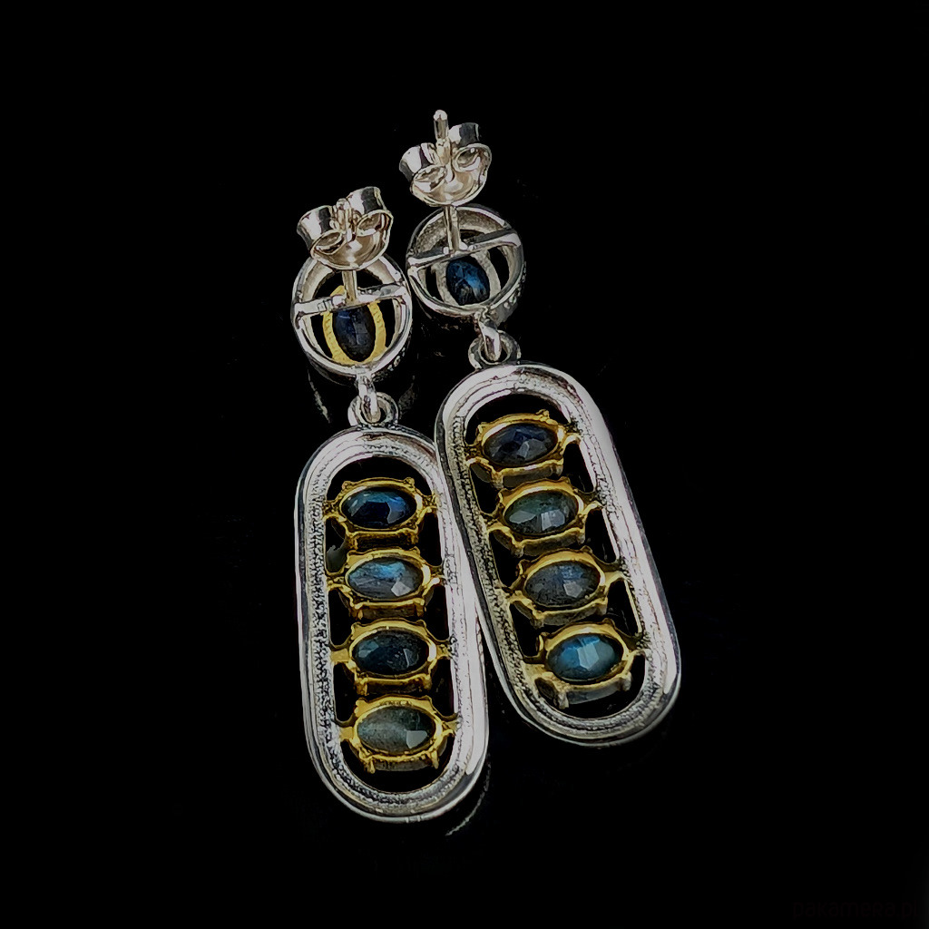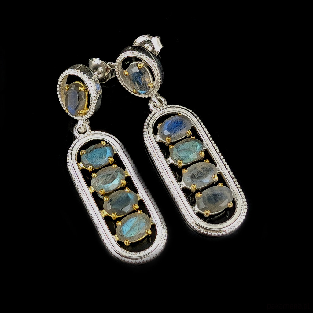 Kolczyki wykonane ze srebra próby 925 oraz fasetowanych labradorytów. Długość całkowita 38 mm. szerokość 11mm. Waga jednego kolczyka 2 ,8 g. Zapięcie na sztyft. Przepiękne. Kolczyki wysyłane zostaną w ozdobnym pudełeczku. Wykonane przez dostawcę kamieni.