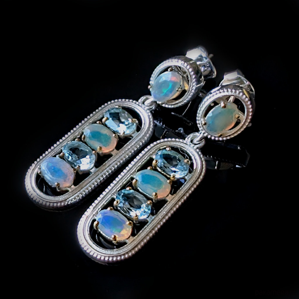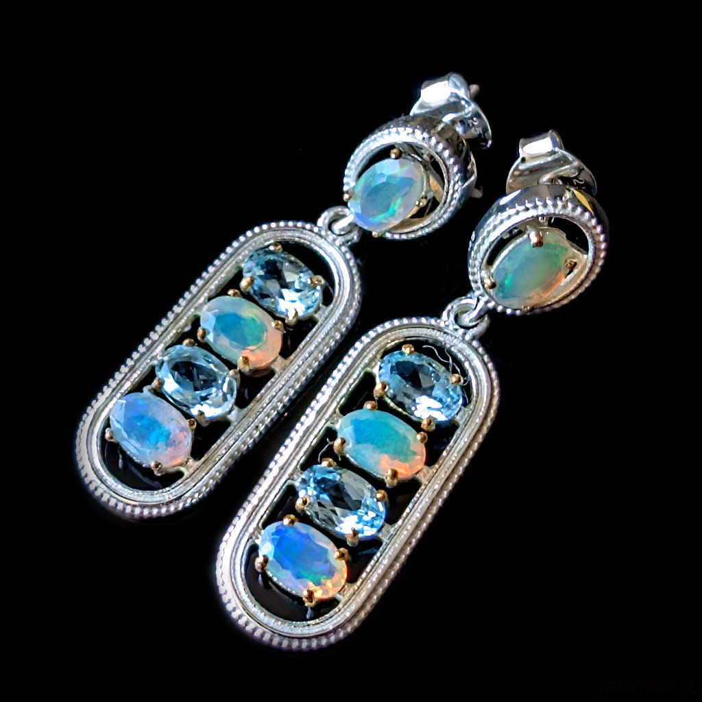 Kolczyki wykonane ze srebra próby 925 oraz fasetowanych opali oraz topazw. Przepiękne barwy. Długość całkowita 38 mm. szerokość 11mm. Waga jednego kolczyka 2 ,68 g. Zapięcie na sztyft. Przepiękne. Kolczyki wysyłane zostaną w ozdobnym pudełeczku. Wykonane przez dostawcę kamieni.