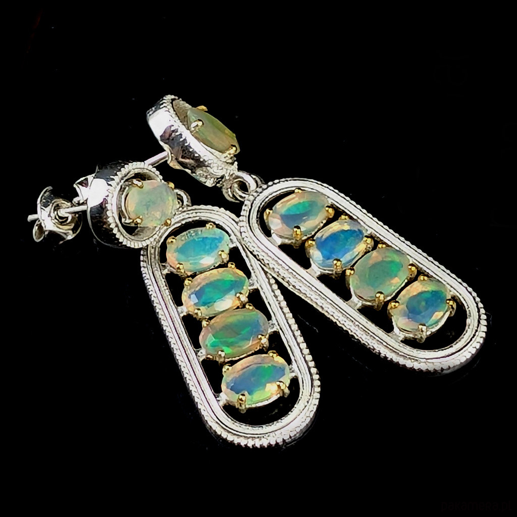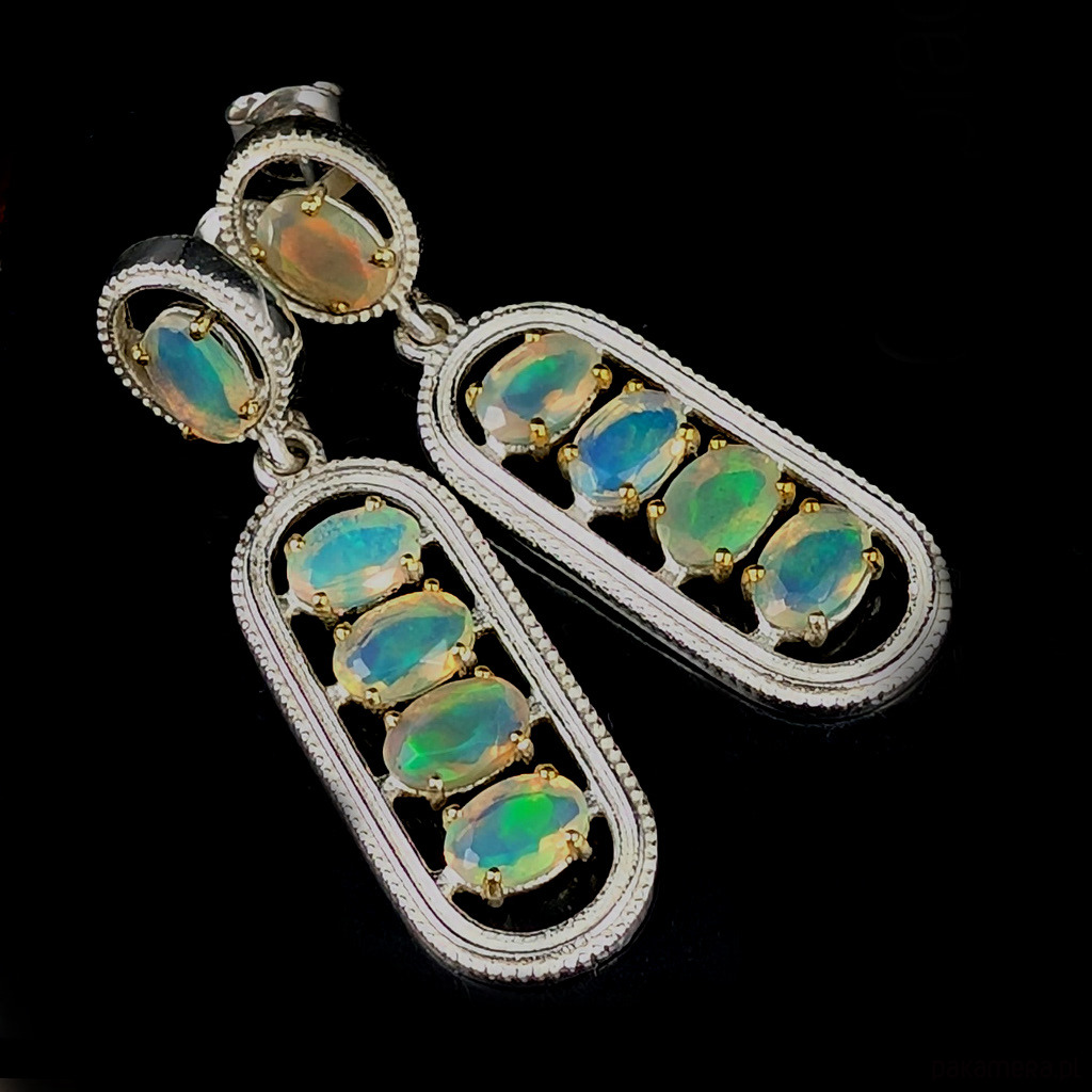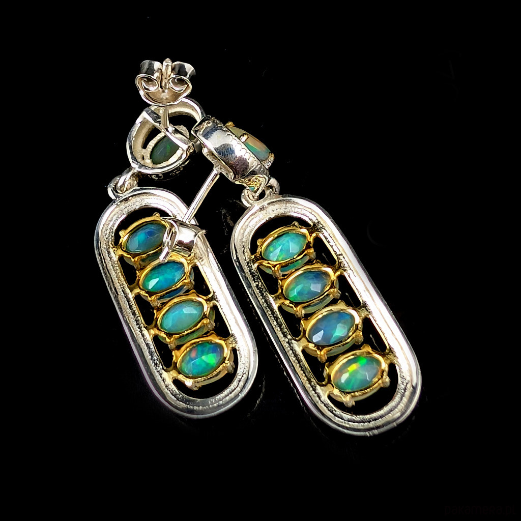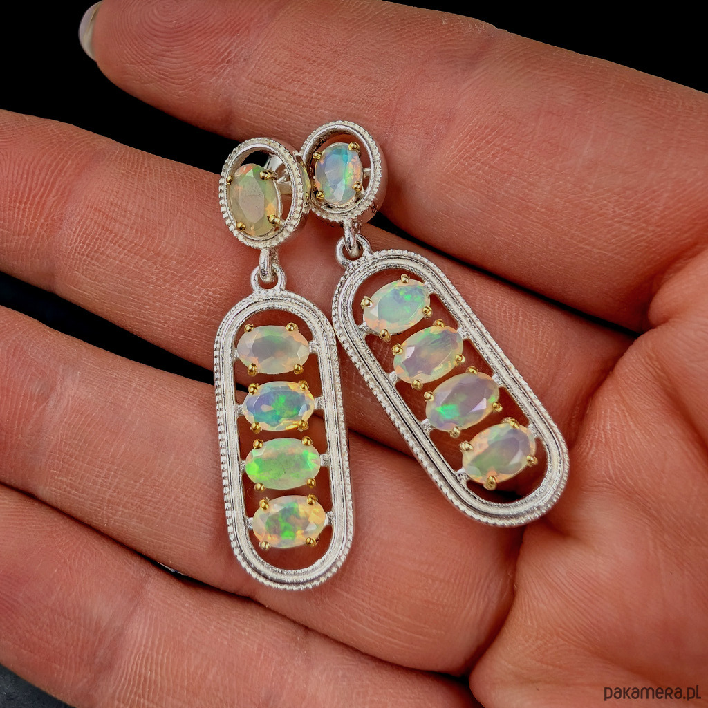 Kolczyki wykonane ze srebra próby 925 oraz fasetowanych opali. Przepiękne barwy. Długość całkowita 38 mm. szerokość 11mm. Waga jednego kolczyka 2 ,63 g. Zapięcie na sztyft. Przepiękne. Kolczyki wysyłane zostaną w ozdobnym pudełeczku. Wykonane przez dostawcę kamieni.