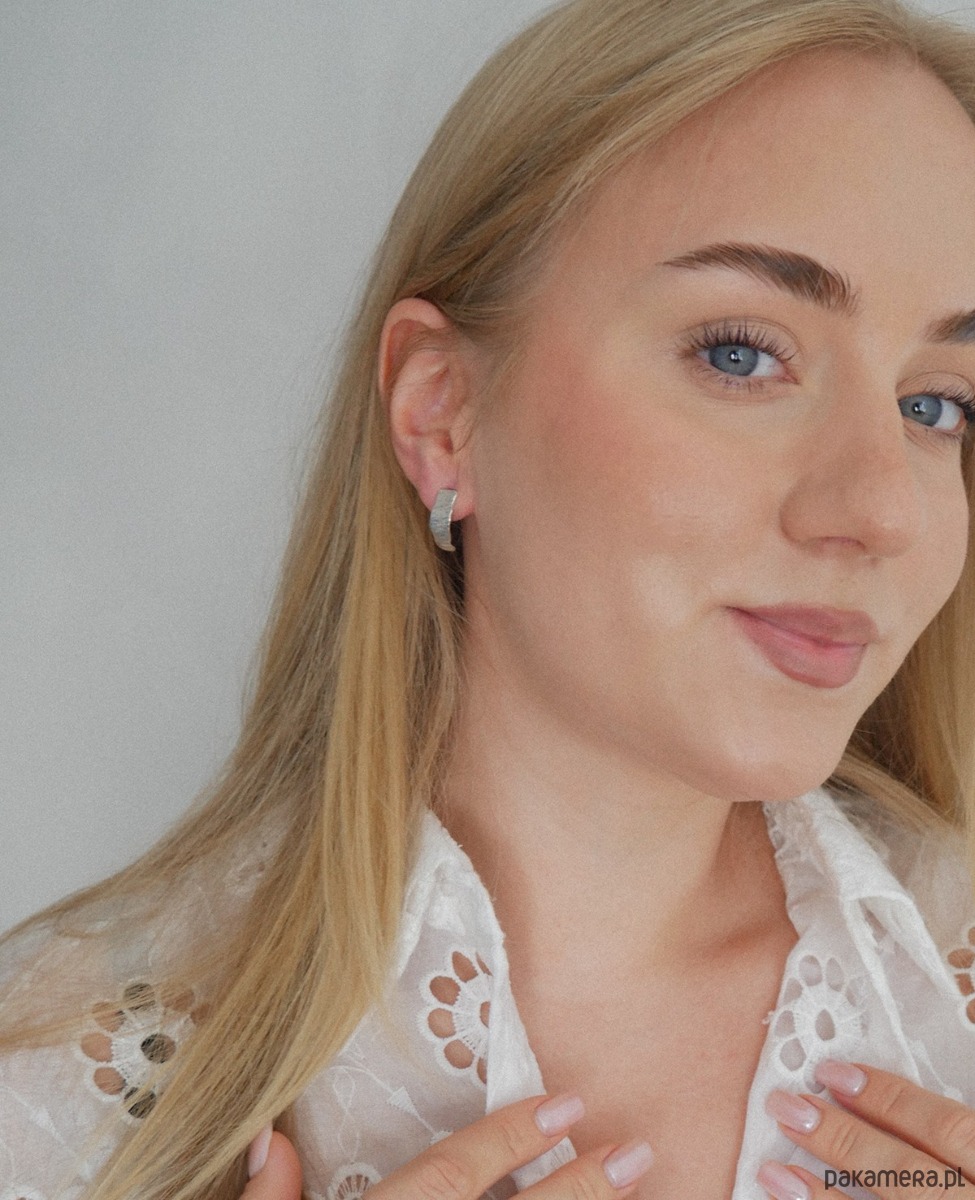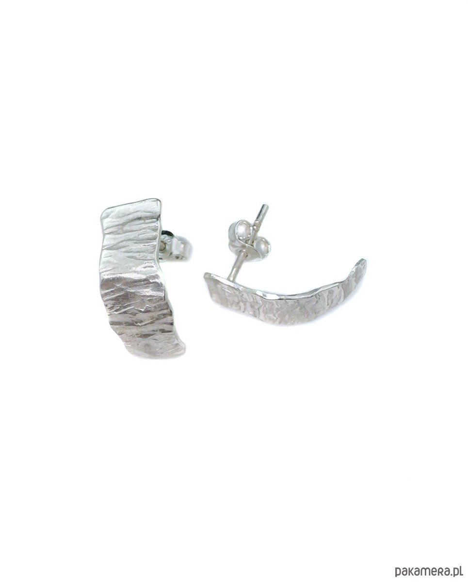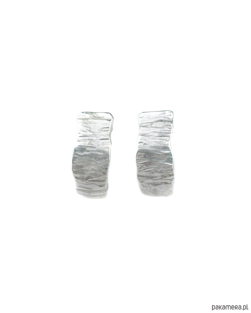 Minimalistyczne kolczyki na sztyftach o fakturowanej powierzchni i nieregularnych brzegach. Wykonane od podstaw ręcznie ze srebra próby 925.