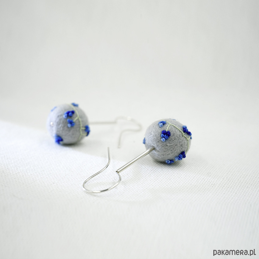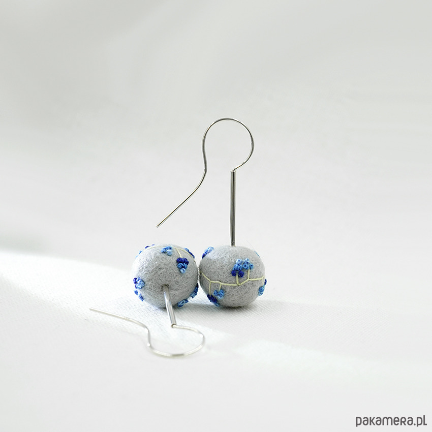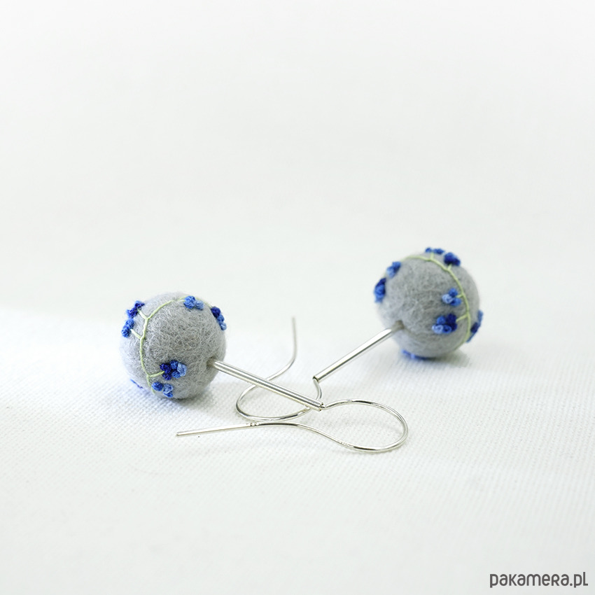 Srebrne kolczyki z filcowymi koralami. Szare, filcowe korale ozdobione haftem wykonała dla mnie Smika ze Słowenii.