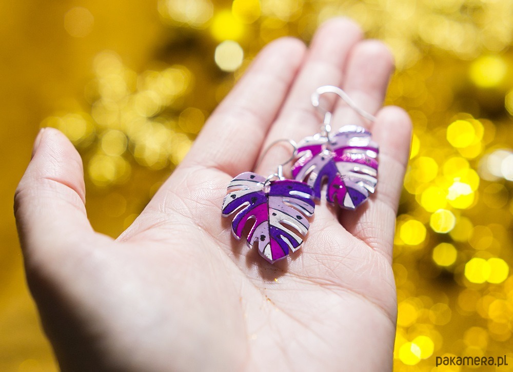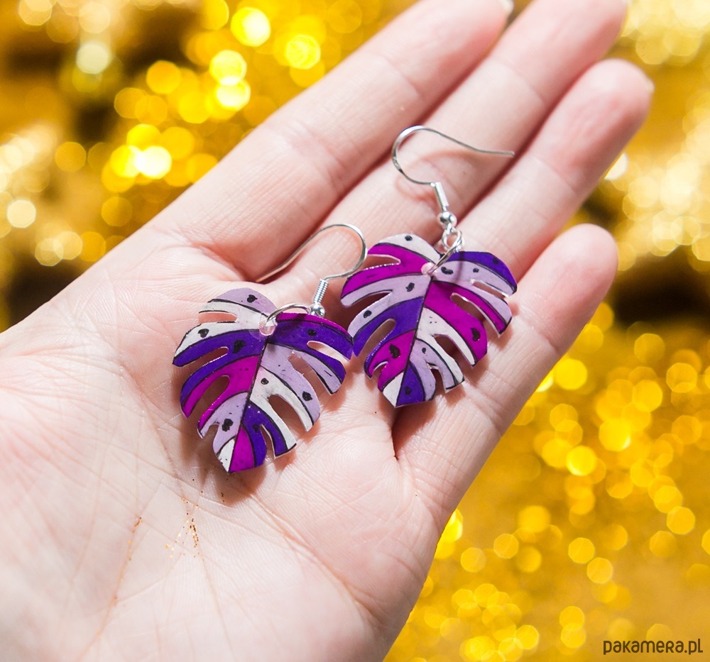 Ręcznie rysowane, niewielkie kolczyki w odcieniach delikatnego fioletu, wykonane w kształcie charakterystycznych liści monstery. Każdy listek ma subtelnie zaznaczone żyłkowanie, które dodaje im lekkości i organicznego charakteru. Kolczyki prezentują się elegancko, a jednocześnie mają artystyczny, unikatowy wygląd.