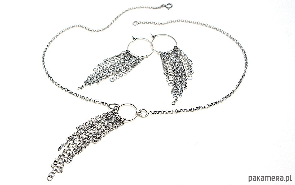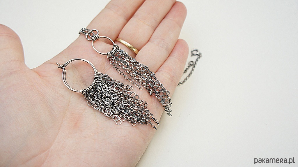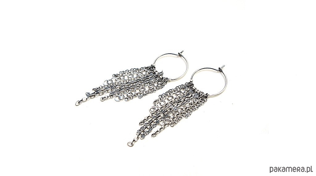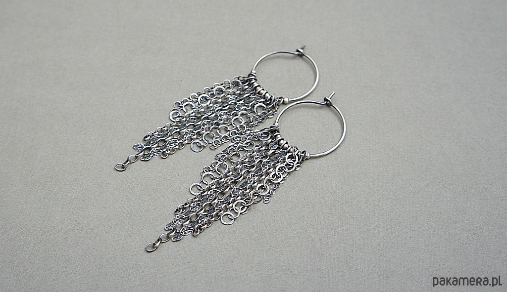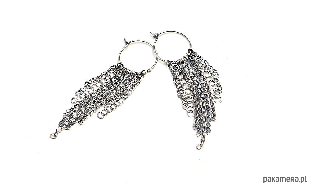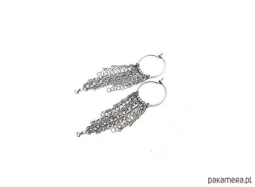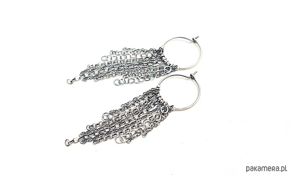 Kolczyki wykonane ze srebra [pr. 925] w połączeniu z różnej długości łańcuszkami o różnych wielkościach ogniw. Srebro oksydowane i przetarte. Średnica kół [20mm]. Całkowita długość kolczyków 7cm. Biżuteria ozdobnie zapakowana.