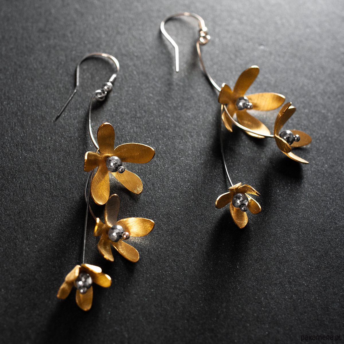 Czarujące kolczyki z kolekcji PRZEDWIOŚNIE z delikatnymi kwiatkami z mosiądzu i hematytu. Łodyżki gałązek połączone są luźno ze sobą, co sprawia, iż kwiatki w trakcie ruchu tańczą i delikatnie połyskują złotym blaskiem. Kolczyki zachwycają swą prostotą i subtelnością. Kobieta, która je założy poczuje się zwiewna jak wiosna! Długość kolczyków z biglem - 8,5 cm. Długość elementu dekoracyjnego - 3 kwiatków ~ 7 cm. Wykorzystany metal to srebro 925 (20%), mosiądz (70%) i stal chirurgiczna (10%). Biżuterię w wykonujemy ręcznie, według własnego projektu w pracowni Anillo. Kolczyki starannie zapakujemy i prześlemy w eleganckim kartoniku.