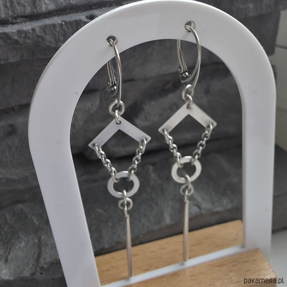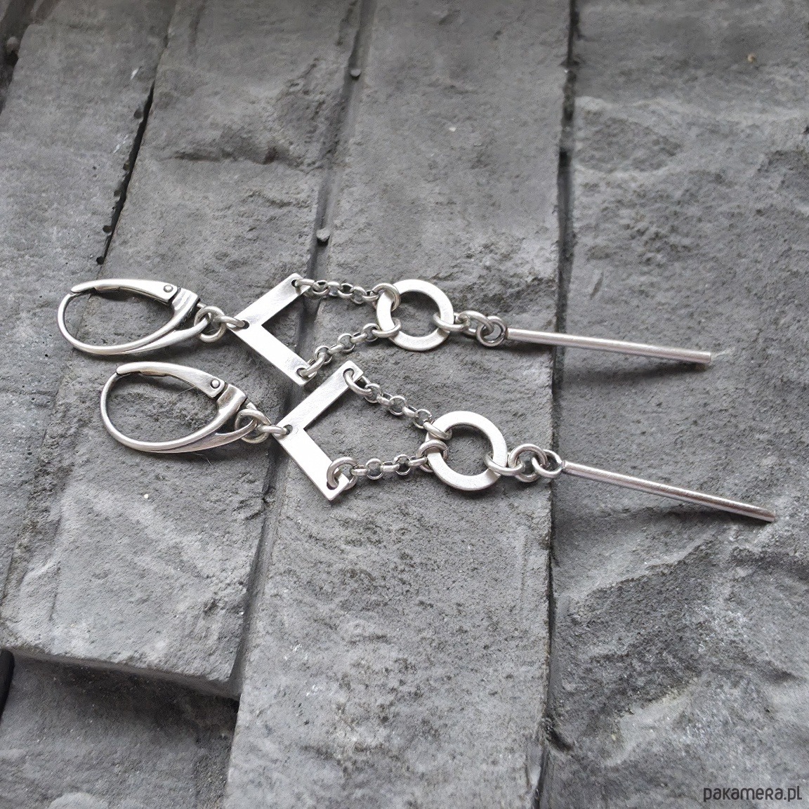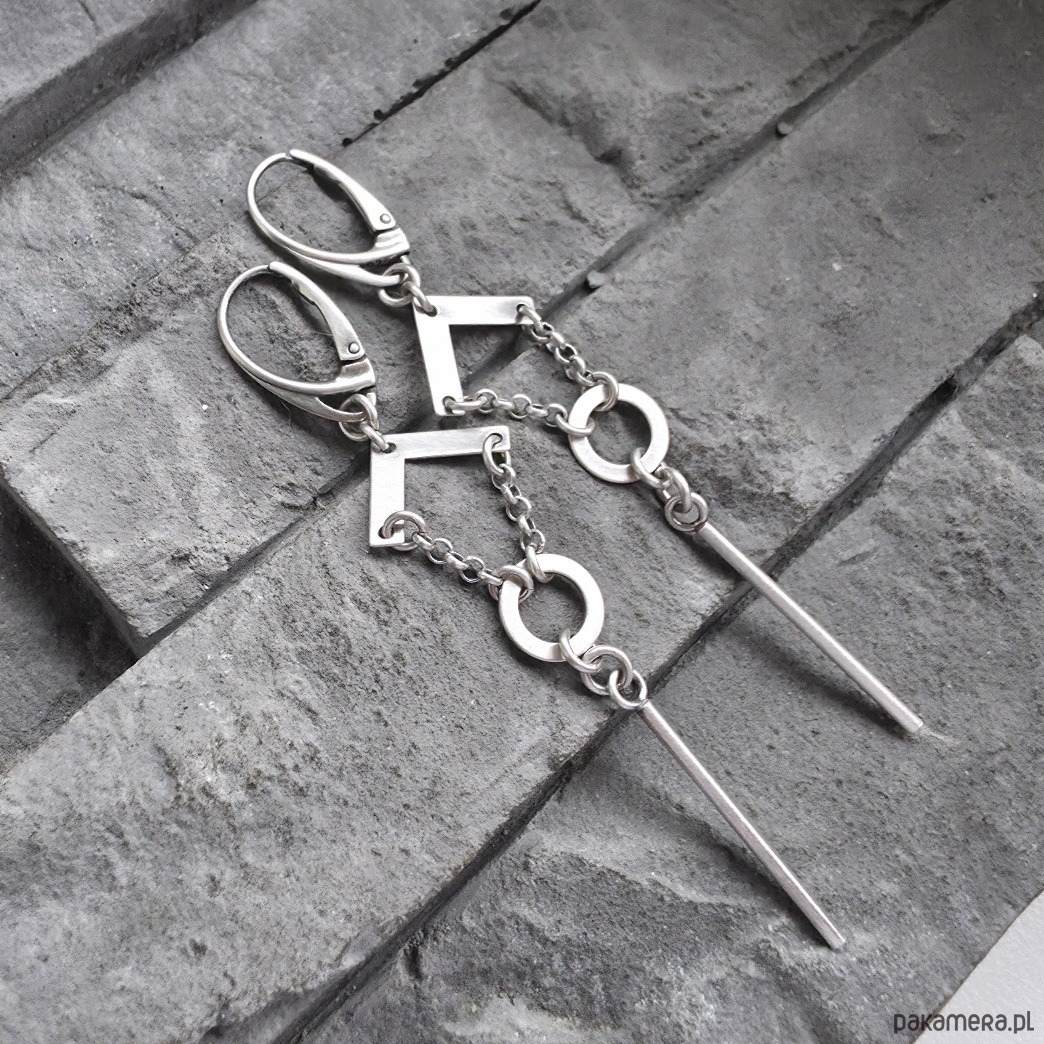 Nowoczesne, geometryczne kolczyki odpowiednie na wiele okazji. Wykonane w całości ze srebra próby 925. Geometryczne elementy polaczone w oryginalna kompozycje. Całkowita długość kolczyków to ok. 8 cm. Na życzenie moge wyslac wersje bez oksydowania. Ozdobnie zapakowane.