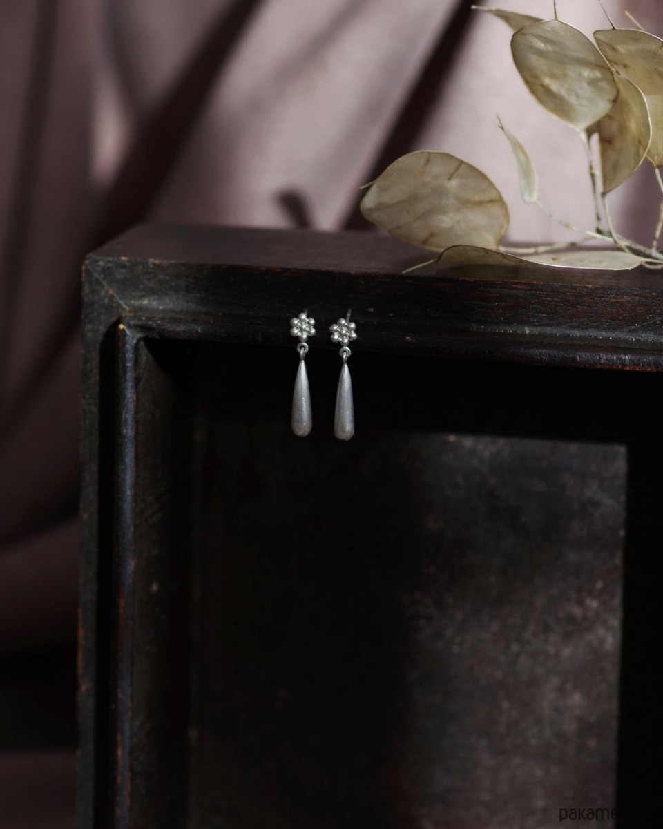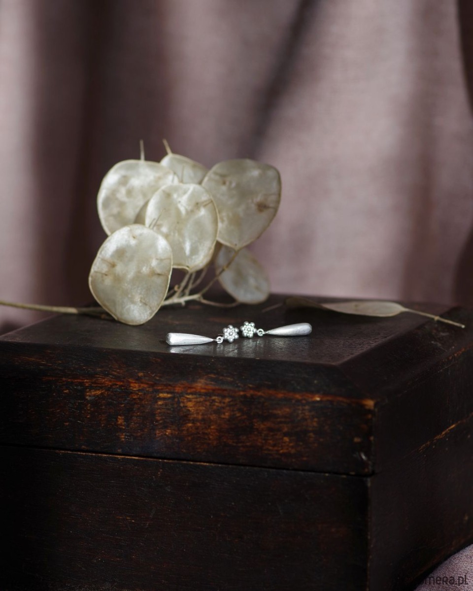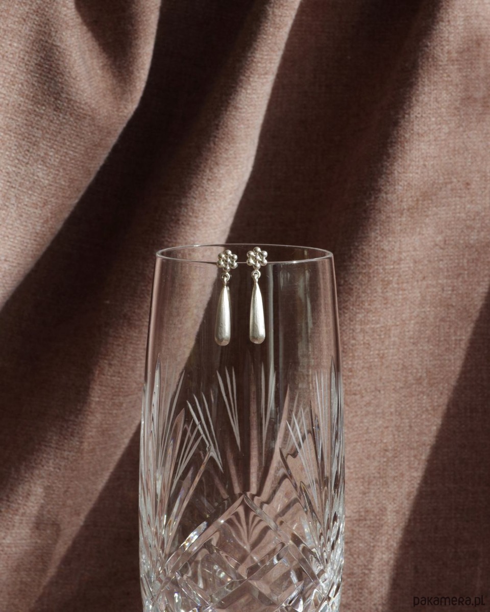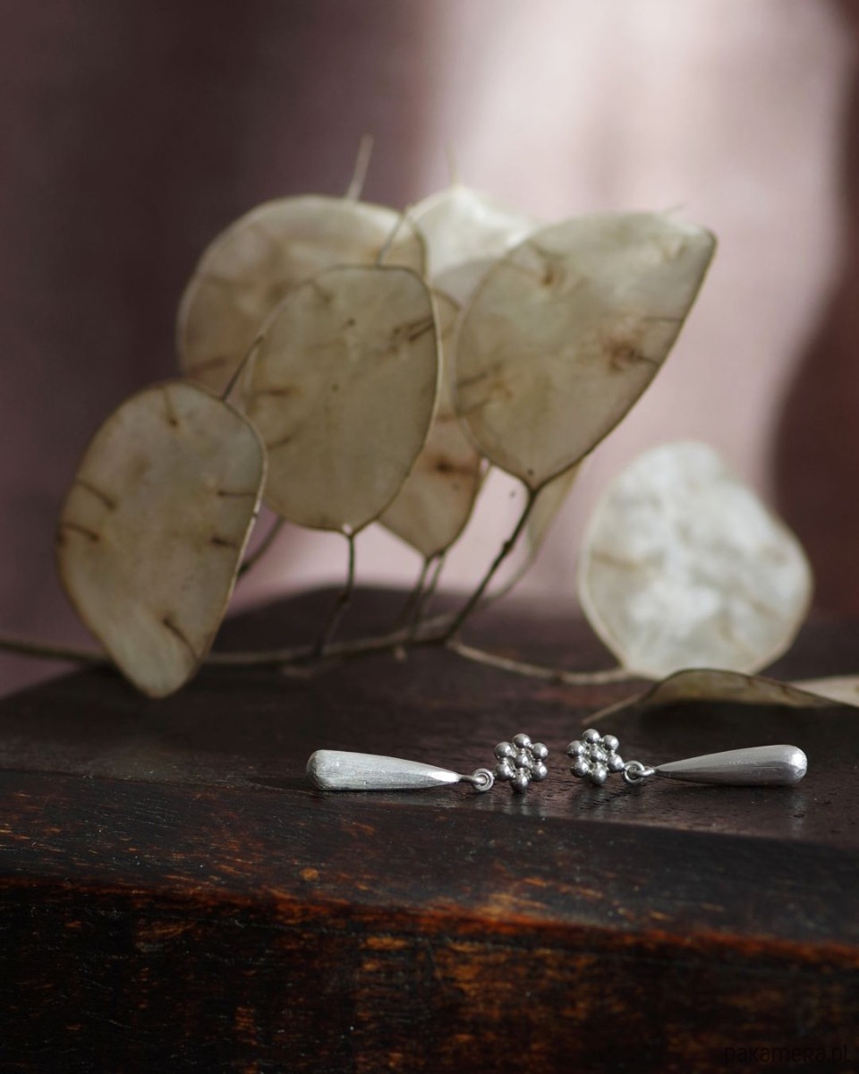 Zostały w całości wykonane ze srebra, choć mogą nieco zwodzić swoim wyglądem. Górna część bowiem rzuca błyski niczym drogocenny kamień, zaś dolna, matowa, przypomina mleczną powierzchnię perły. Symetryczny wypolerowany kwiatek kontrastuje z kroplą o surowej fakturze i szlachetnym wydłużonym kształcie.