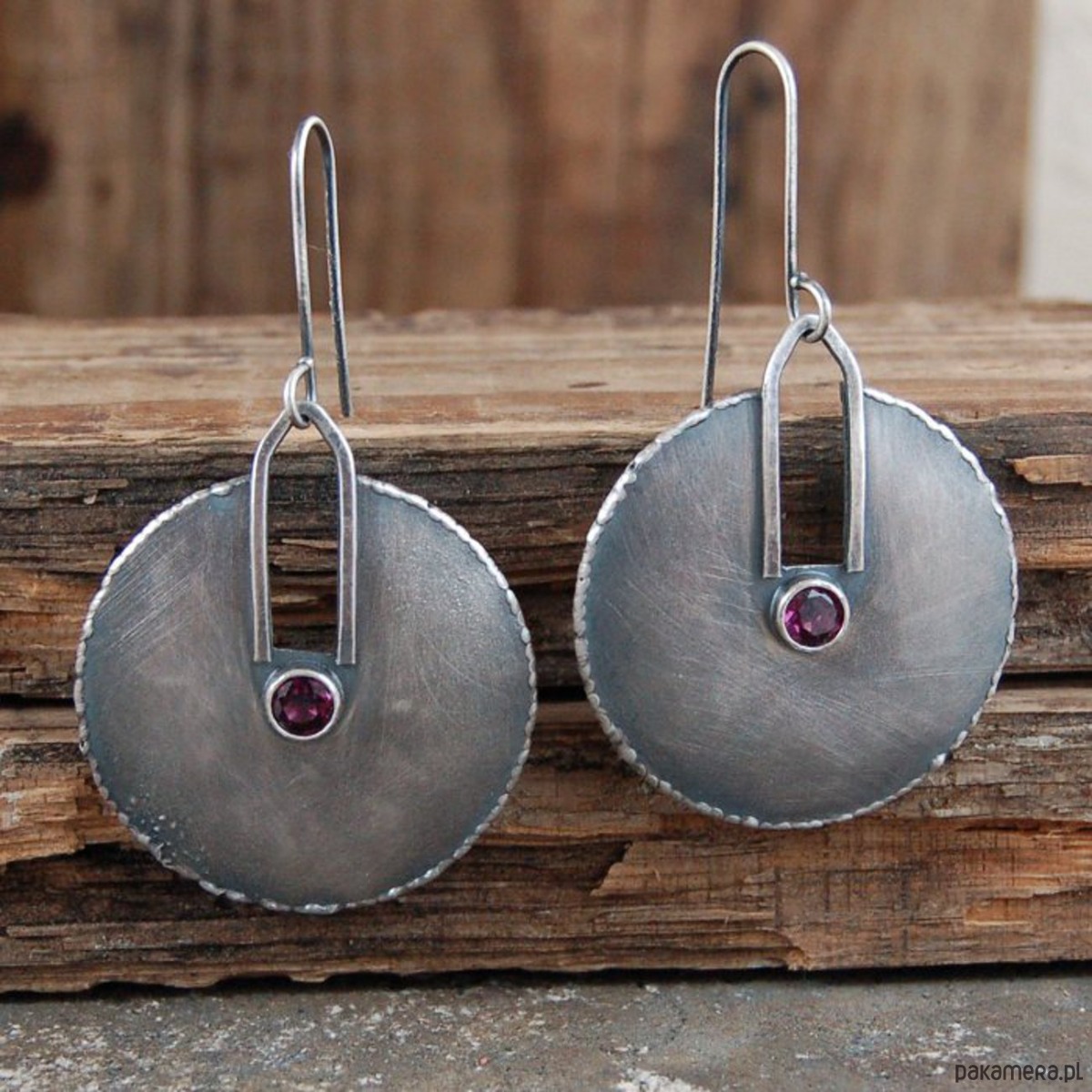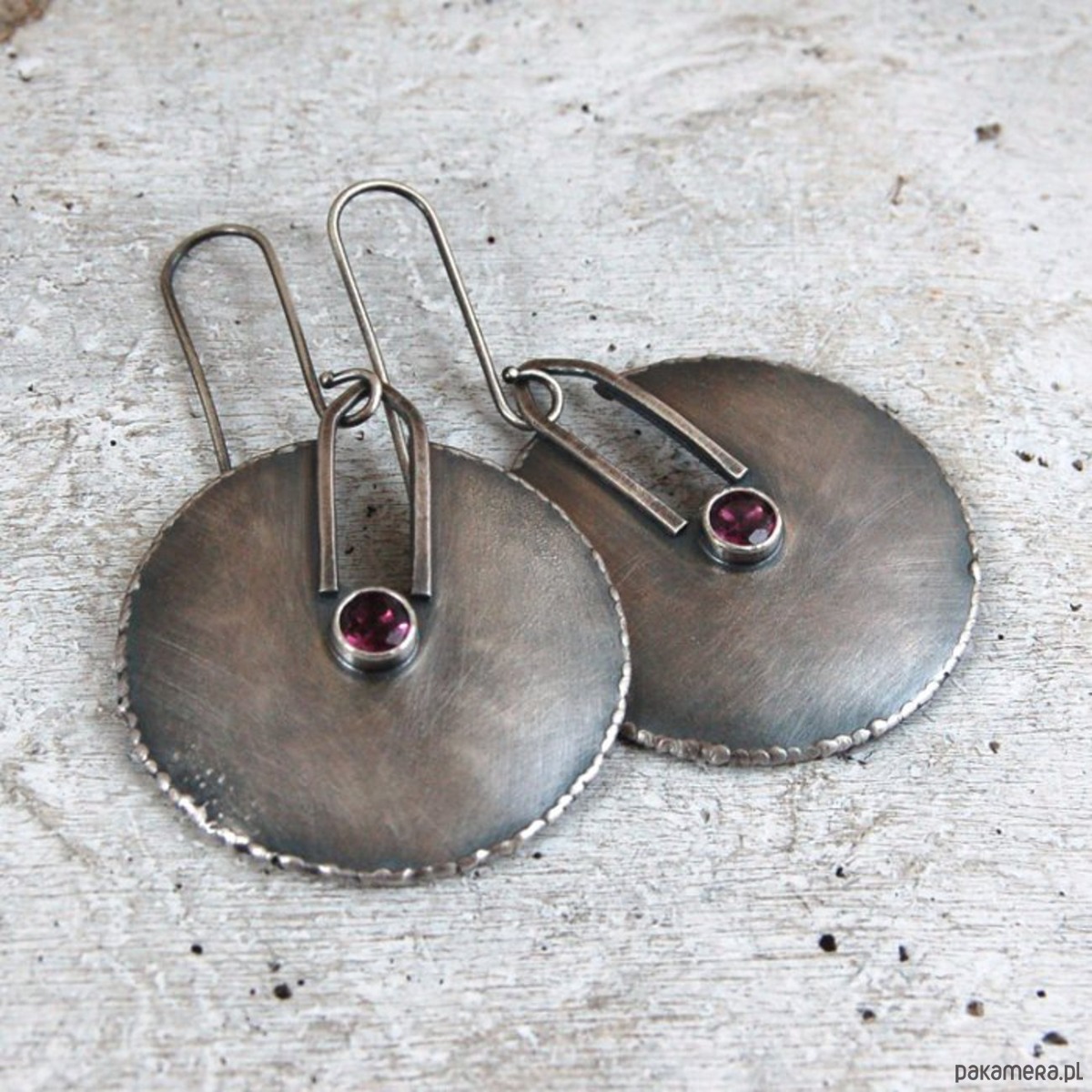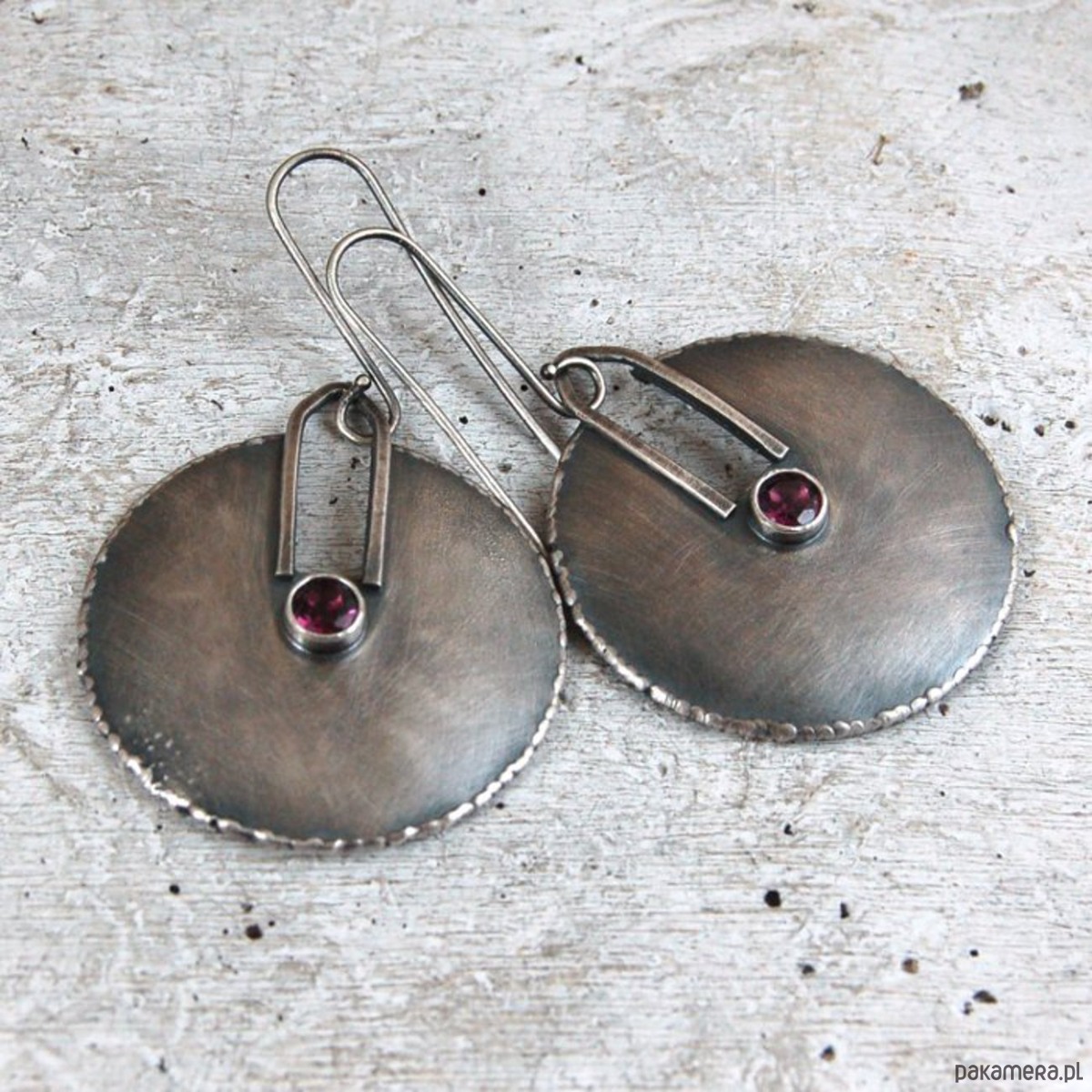 Srebrne kolczyki z granatem. Srebro oksydowane, przetarte. Średnica kamieni 0,5 cm, średnica kolczyków 3,6 cm, długość 6,2 cm, waga jednego kolczyka 5,5 g.