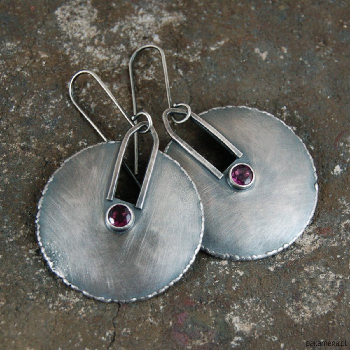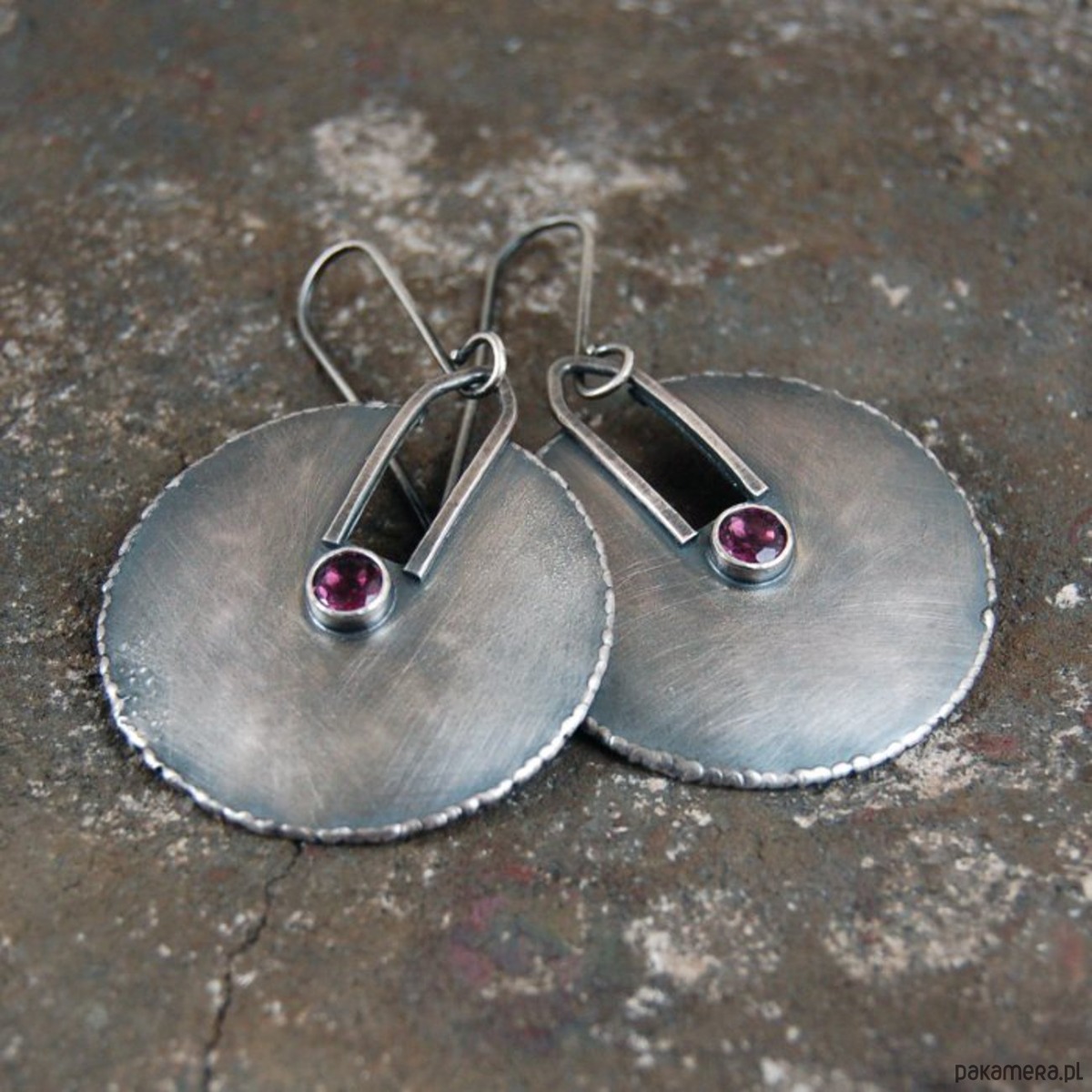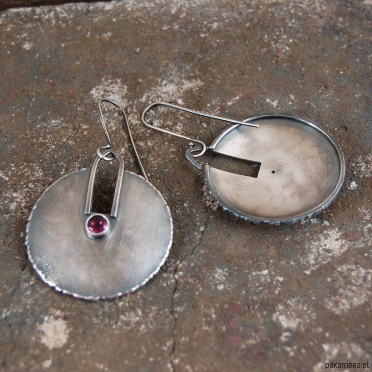 Srebrne kolczyki z granatem. Srebro oksydowane, przetarte. Średnica kamieni 0,5 cm, średnica kolczyków 3,6 cm, długość 6,2 cm, waga jednego kolczyka 5,5 g.