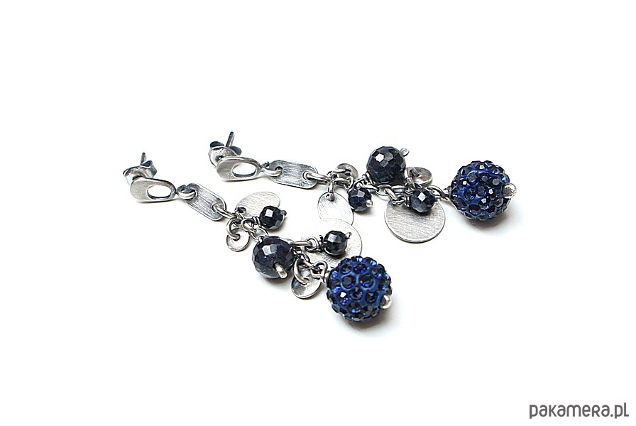 Kolczyki wykonane ze srebra [pr. 925] w połączeniu z kuleczkami szafirów [4mm i 6mm], kuleczką shamballa wysadzaną kryształkami Swarovski [10mm] oraz srebrnymi blaszkami. Całość oksydowana i przetarta. Całkowita długość kolczyków ok. 5,5cm. Biżuteria ozdobnie zapakowana.
