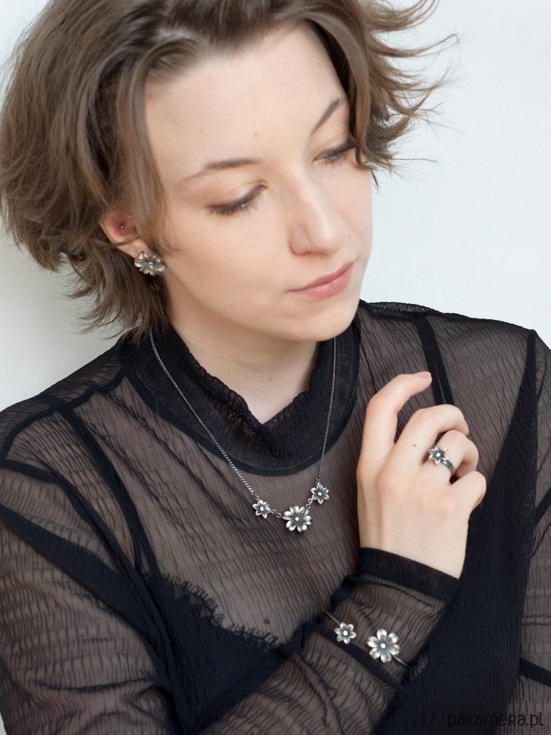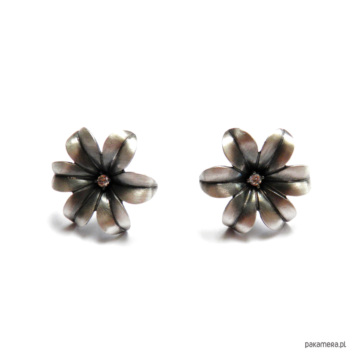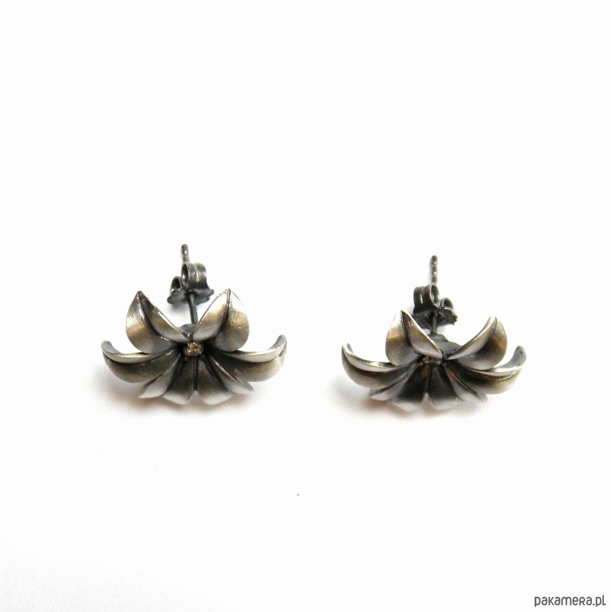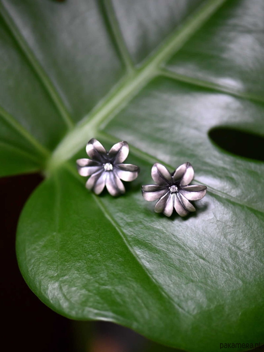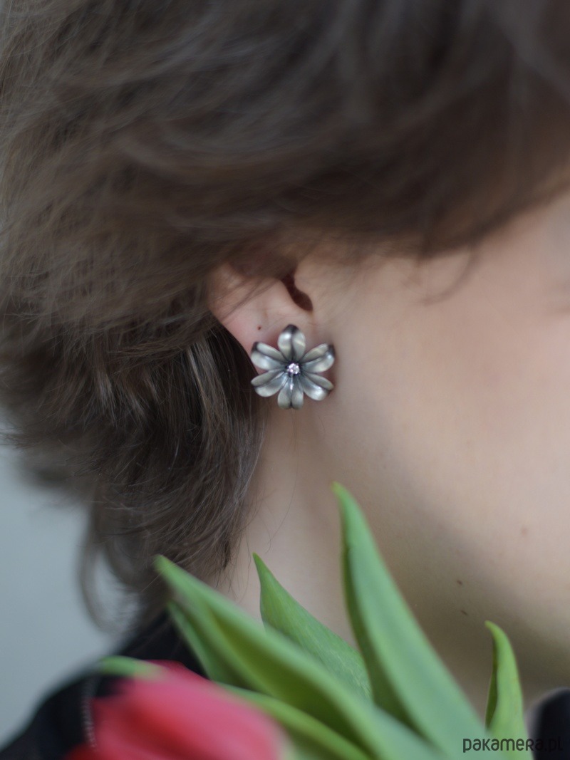 Niezwykle efektowne i bardzo kobiece kolczyki w kształcie kwiatuszka, z sześcioma wywiniętymi płatkami, z malutką białą cyrkonią umieszczoną w środku. Kolczyki wykonane ze srebra próby 925, następnie zoksydowane i wypolerowane. Szerokość kwiatuszków 2 cm. Urocze, delikatne i zachwycające.
