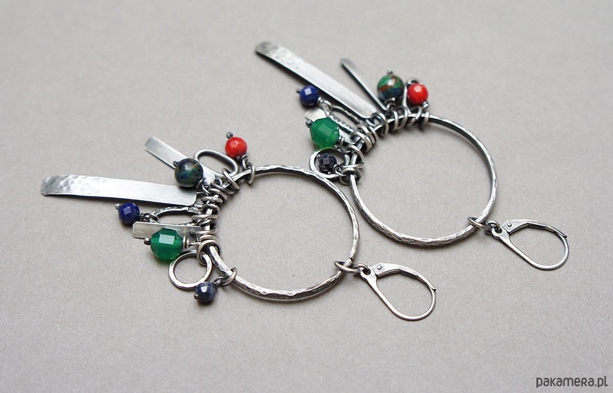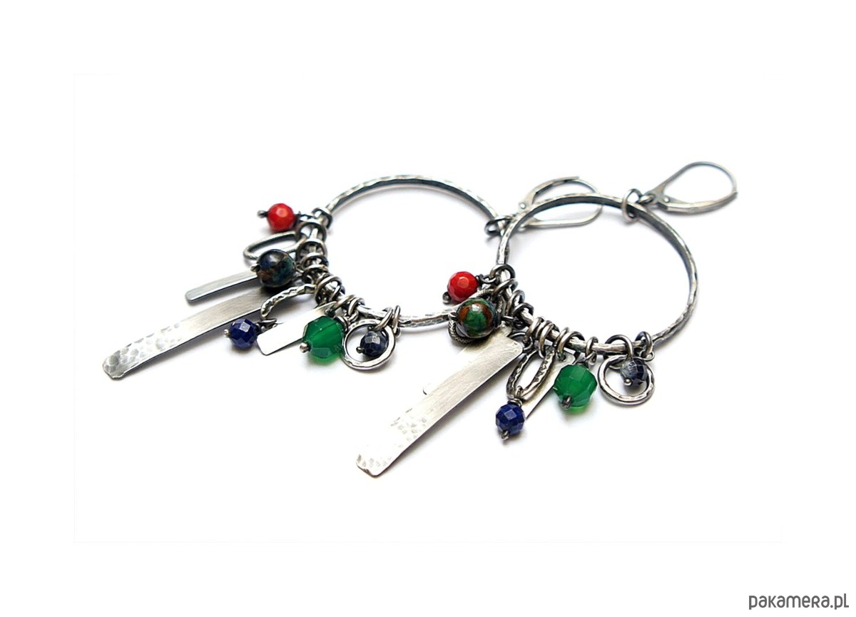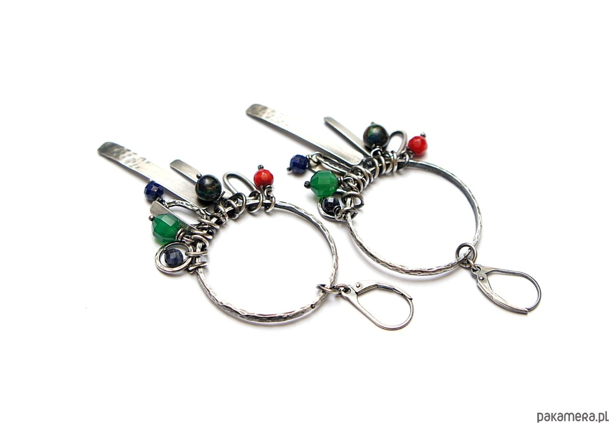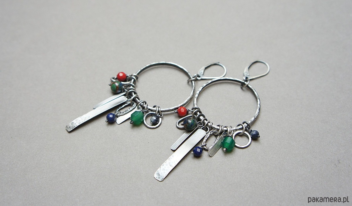 Kolczyki wykonane własnoręcznie od podstaw ze srebra [pr. 925] w połączeniu z fasetowanym zielonym onyksem [6mm], fasetowanymi szafirami, lapisem lazuli czerwonym koralem [4mm] oraz kuleczkami chryzokoli [6mm]. Srebro oksydowane i przetarte. Średnica kół 30mm. Całkowita długość kolczyków 8,5cm. Biżuteria ozdobnie zapakowana