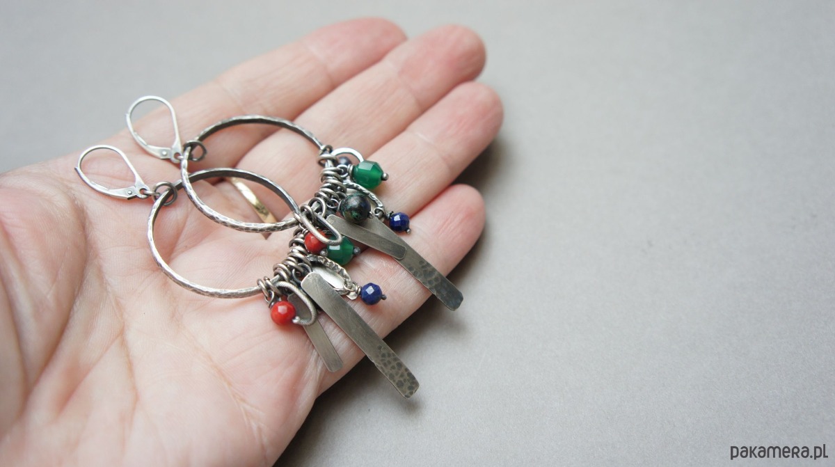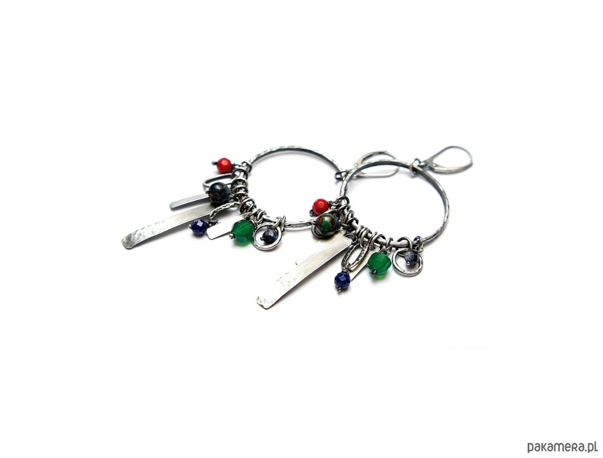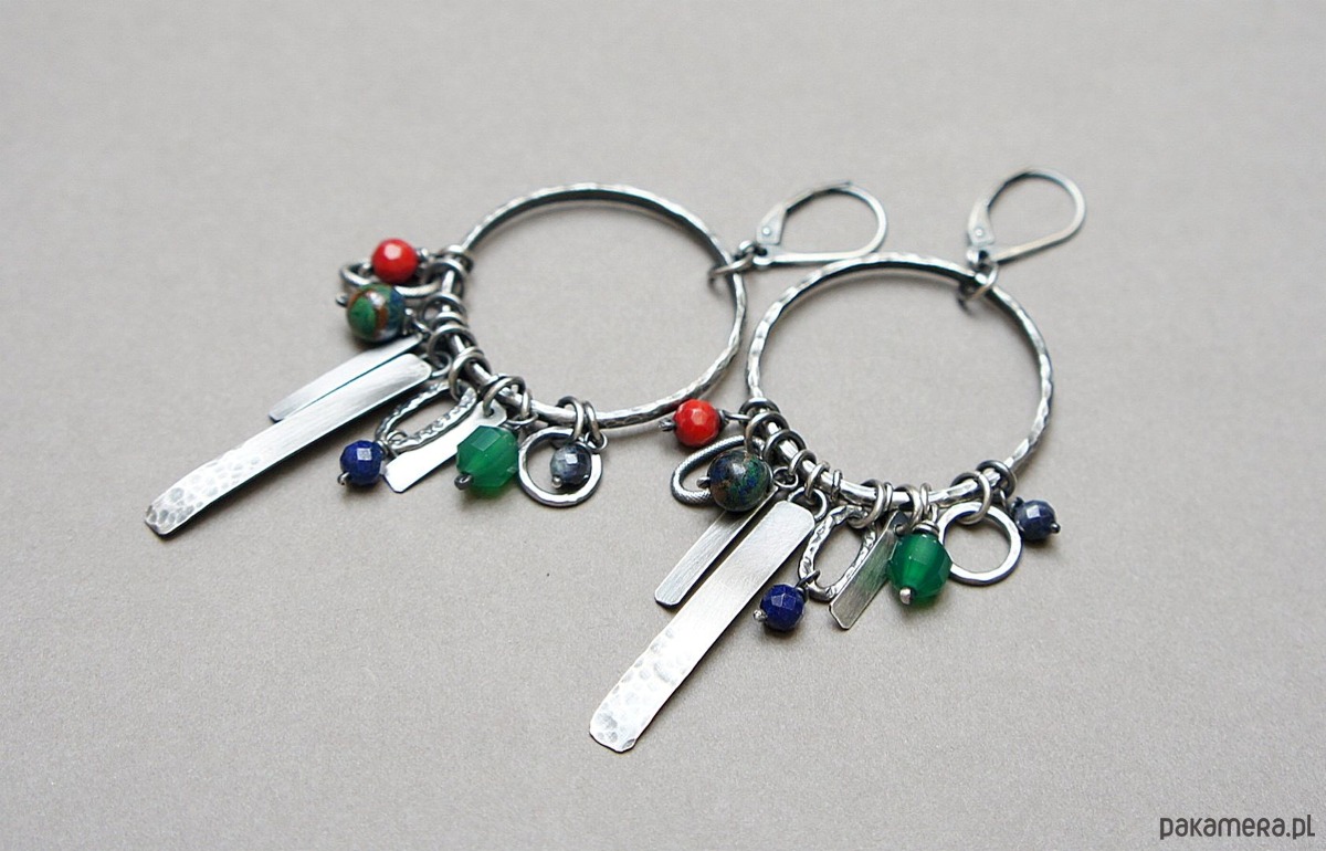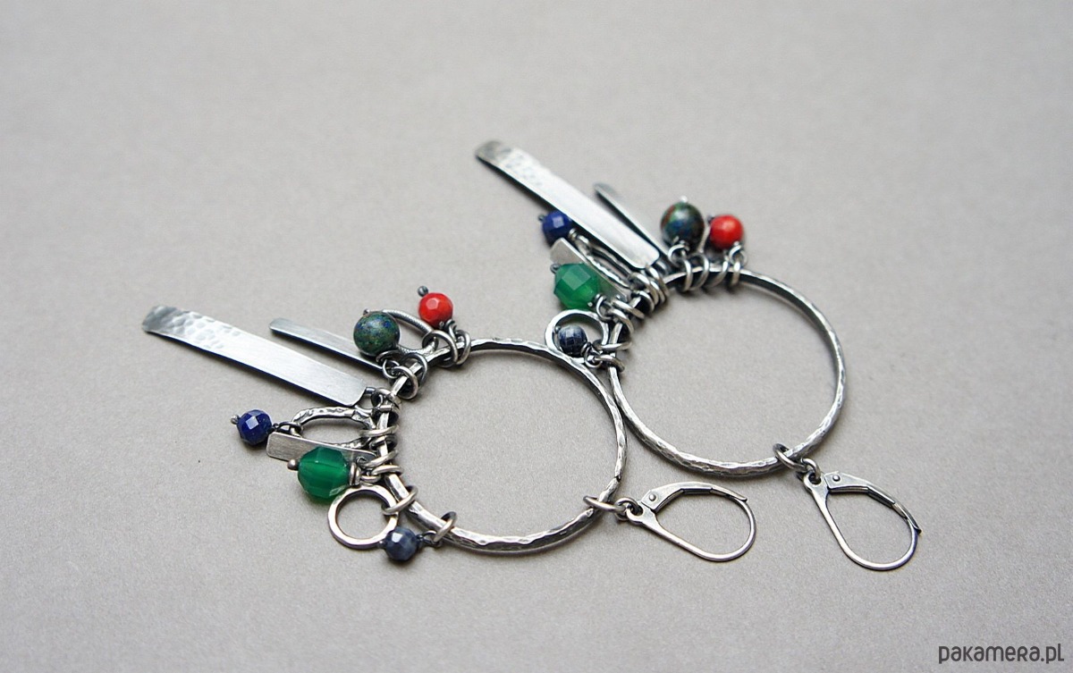 Kolczyki wykonane własnoręcznie od podstaw ze srebra [pr. 925] w połączeniu z fasetowanym zielonym onyksem [6mm], fasetowanymi szafirami, lapisem lazuli czerwonym koralem [4mm] oraz kuleczkami chryzokoli [6mm]. Srebro oksydowane i przetarte. Średnica kół 30mm. Całkowita długość kolczyków 8,5cm. Biżuteria ozdobnie zapakowana