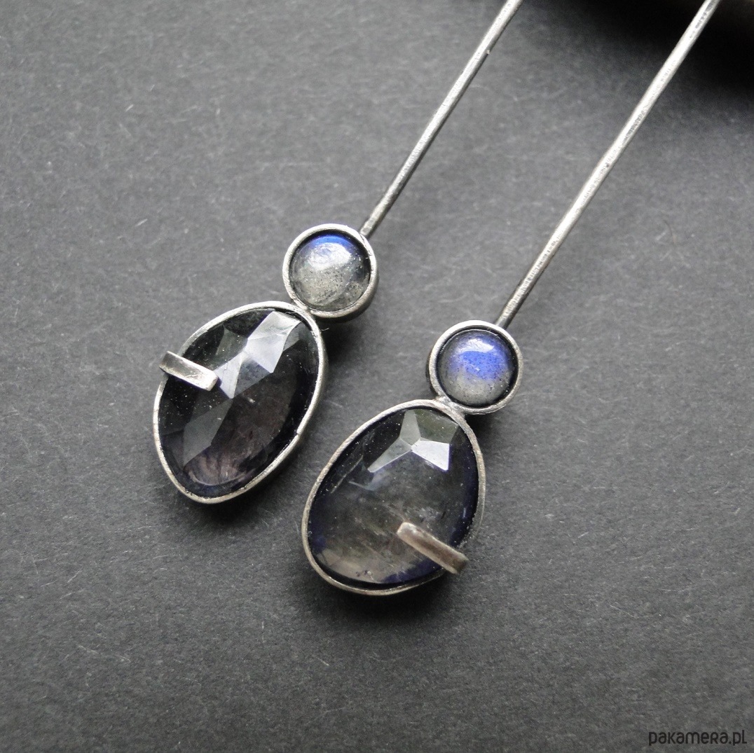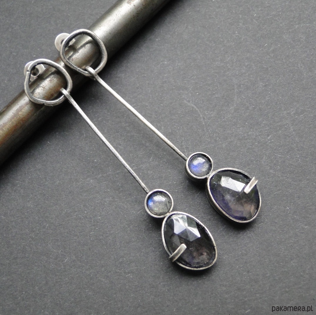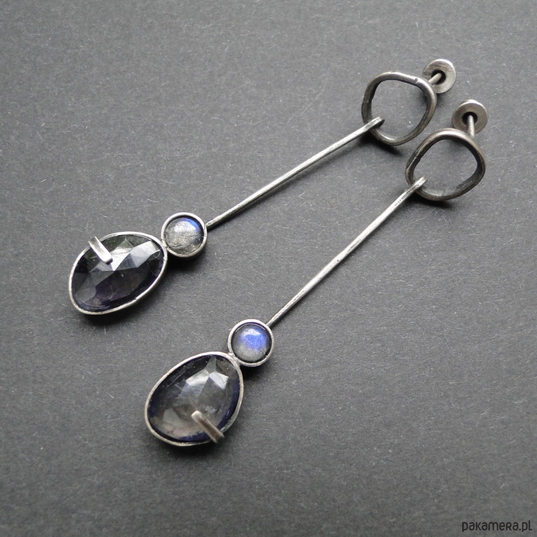 Surowe, długie kolczyki wykonane ręcznie w całości. Srebro 925,oksydowane i szorowane. Kamienie: wysokiej klasy Iolit dł.13 i 14 mm; labradoryt śr.5 mm z niebieską poświatą. Iolit jest w kolorze jasnego granatu,kamienie niesymetryczne, podobnie jak same sztyfty ręcznie wykonane. Długość kolczyka- 6 cm. Nie moczyć w wodzie.